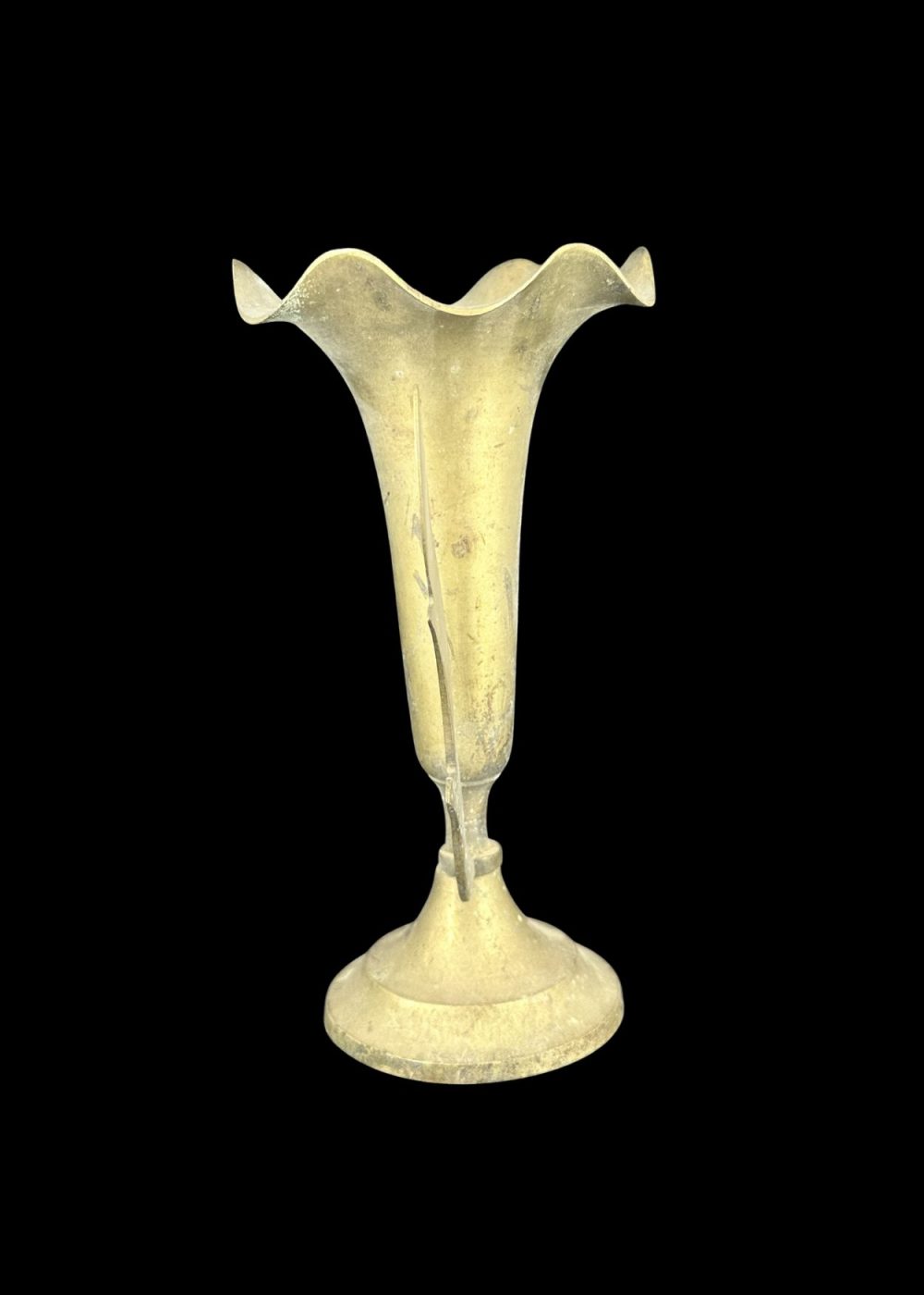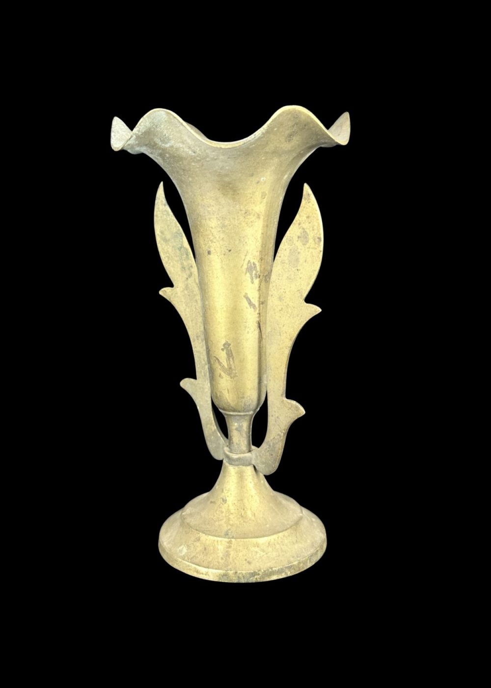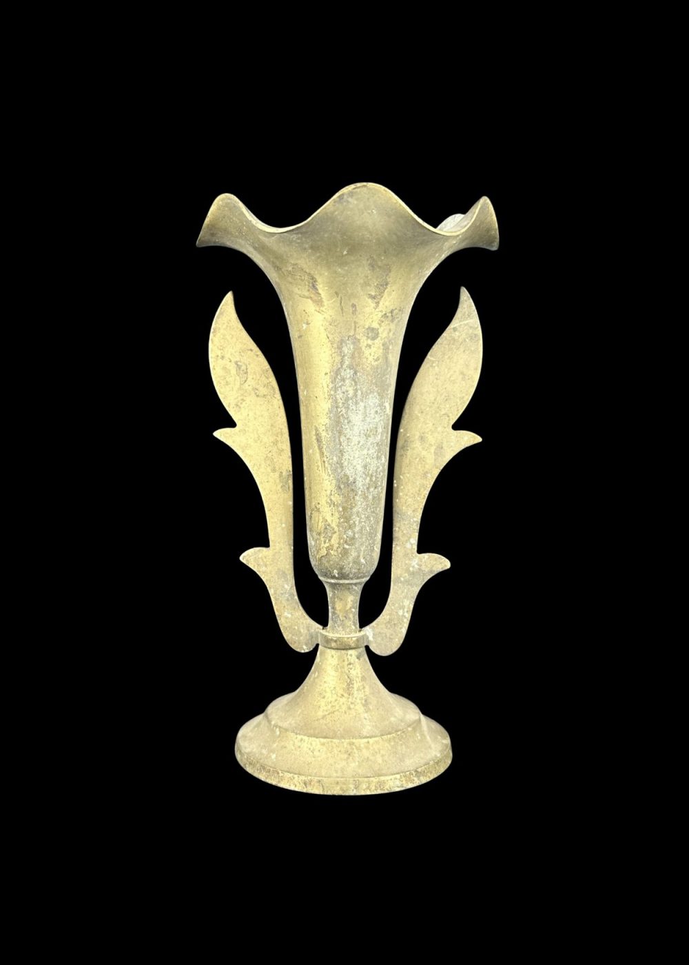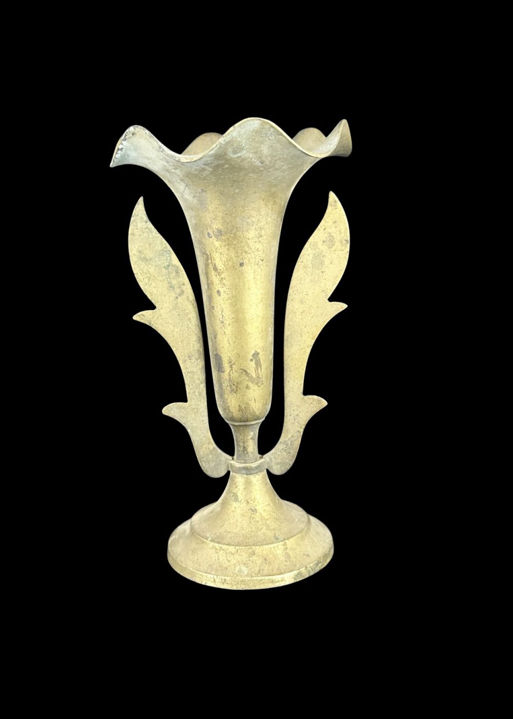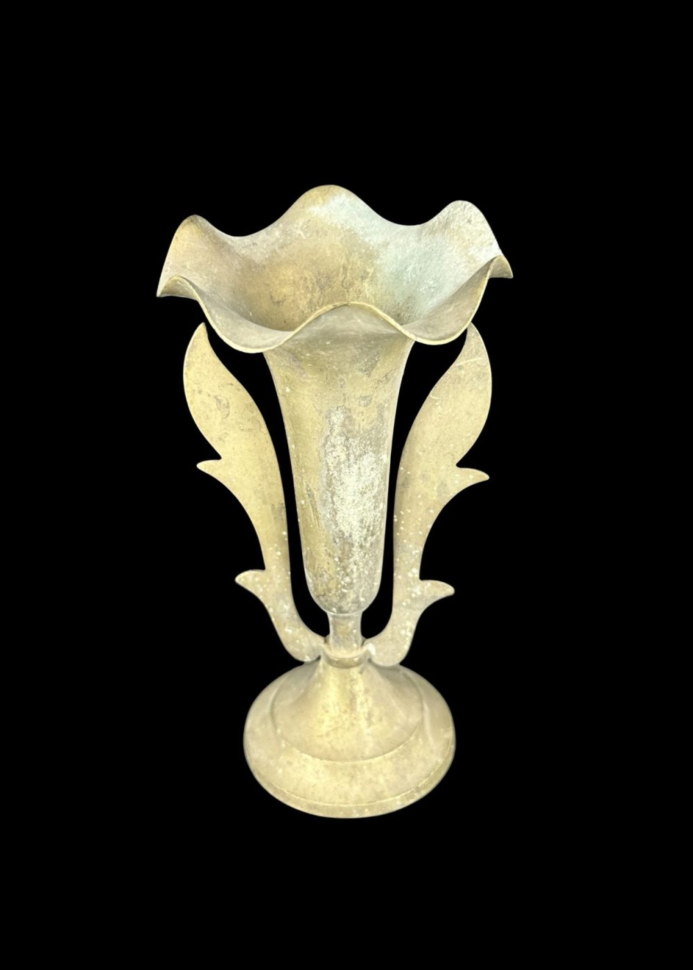 This elegant garman silver flower vase features a flared trumpet-shaped mouth and a slender stem rising from a round tiered base. Flanking the central body are two stylized leaf-like elements, adding a decorative flourish to its symmetrical form. Likely used for both ornamental and ritual purposes, the vase showcases fine craftsmanship and a graceful silhouette characteristic of traditional Indian metalwork.