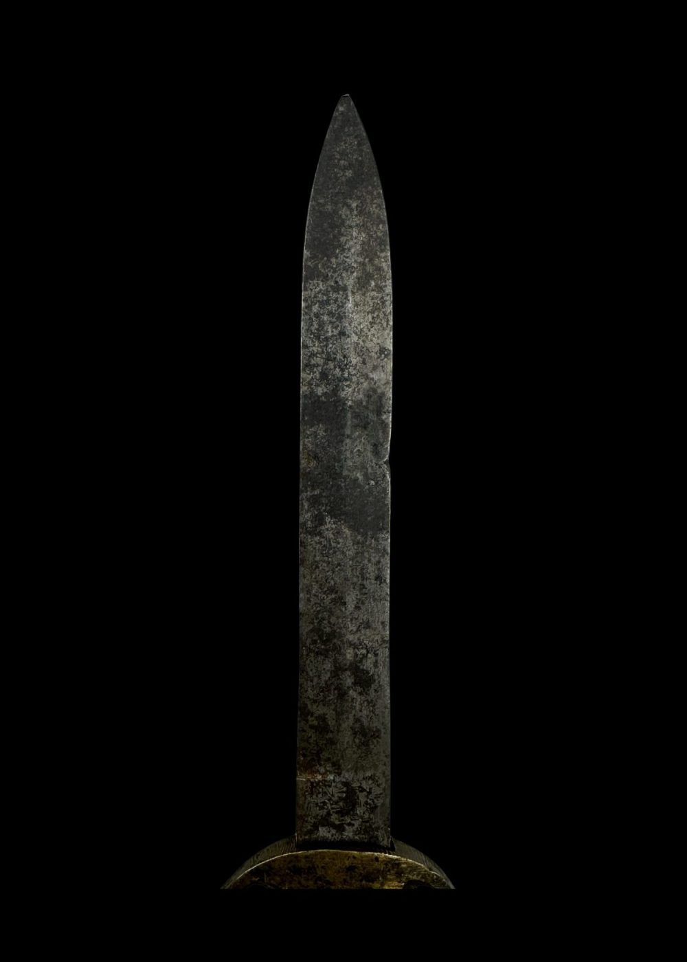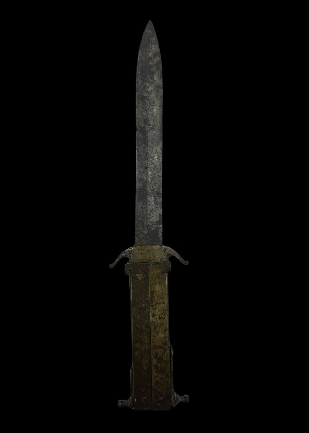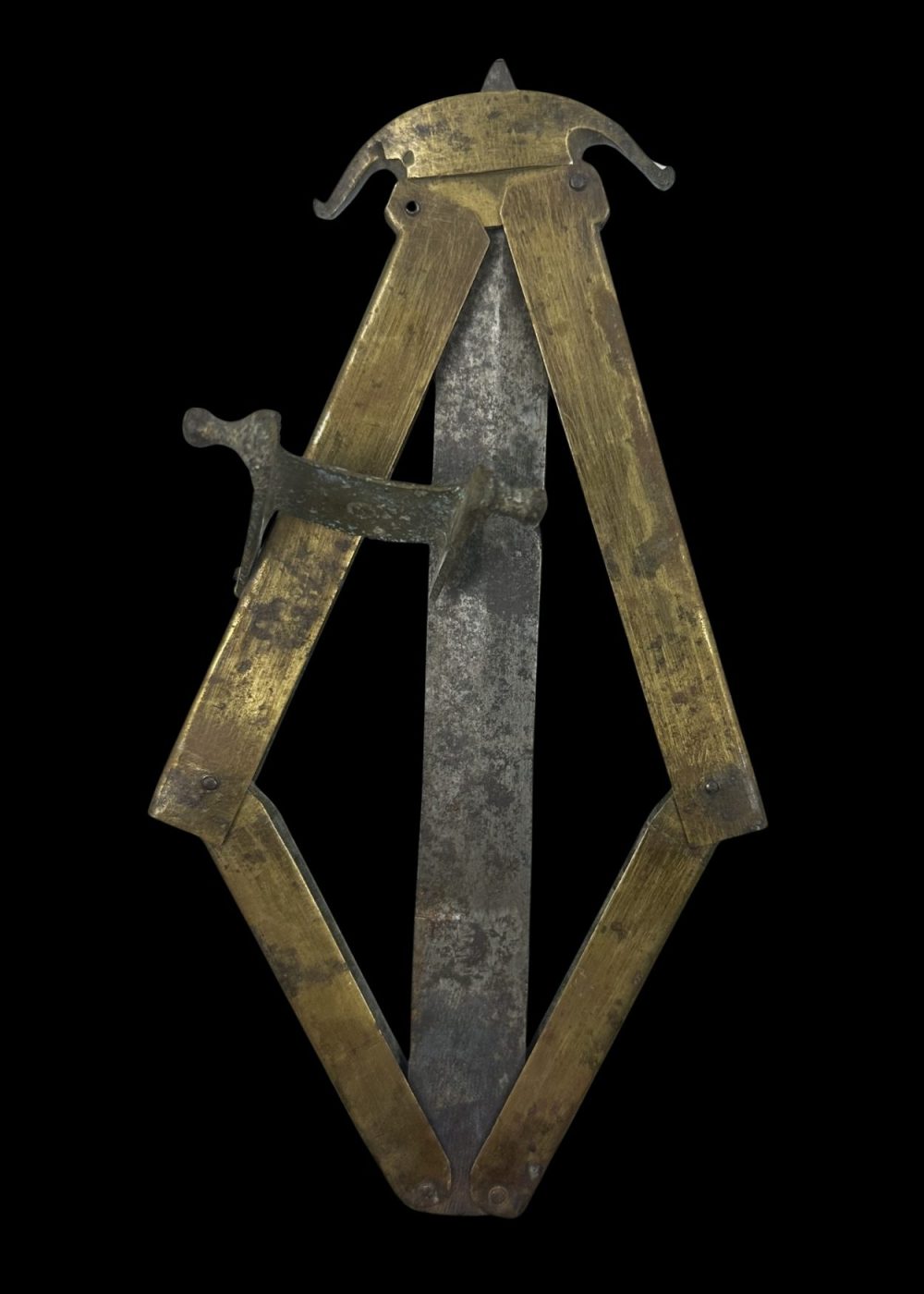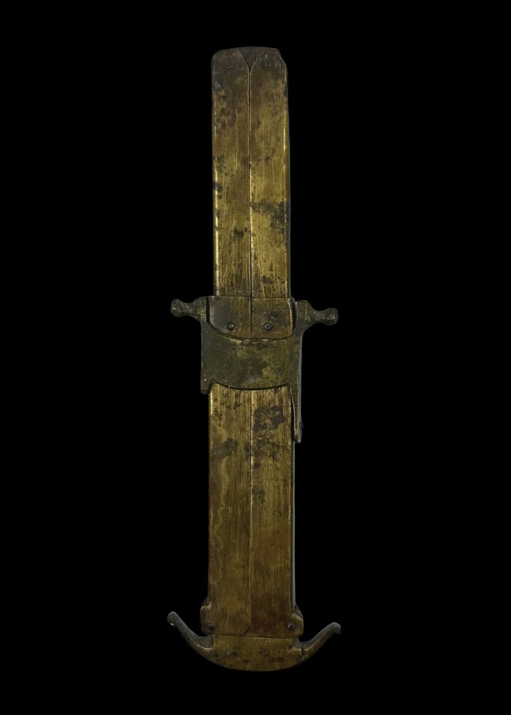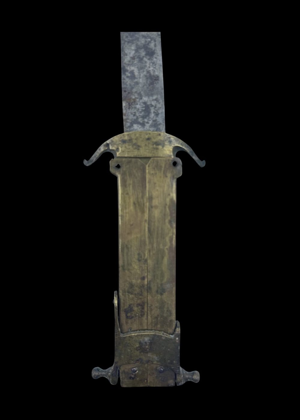 This knife, dating to around, is crafted from iron with brass detailing. Its unique design features a mechanical or folding mechanism, suggesting it may have functioned as a folding pocket or utility knife. The brass exterior exhibits a worn patina, indicating frequent use or age. Its symmetrical, robust form and side levers reflect mid-20th-century utilitarian craftsmanship, possibly for everyday or multipurpose tasks.