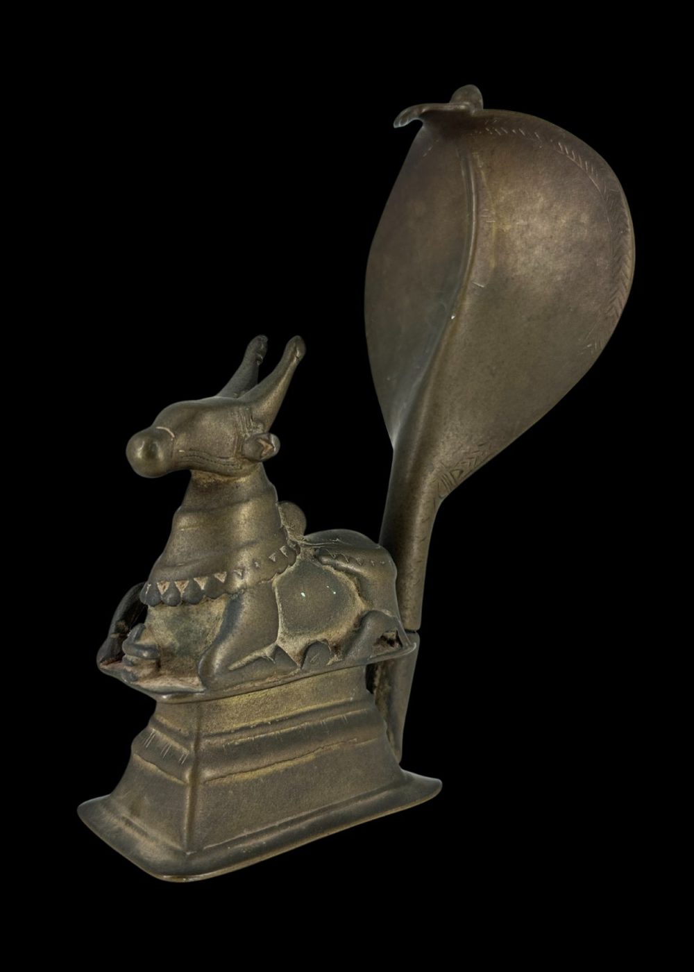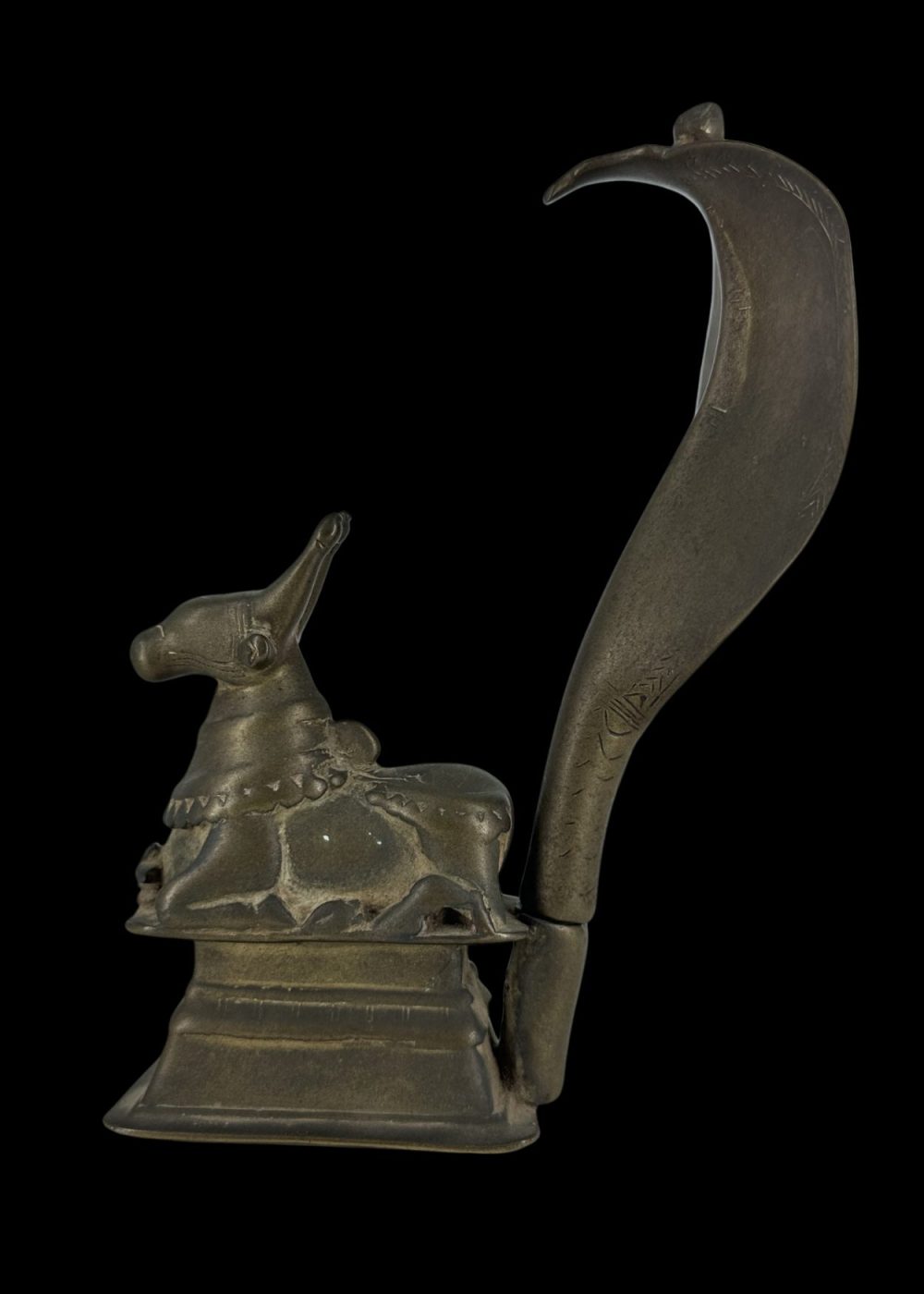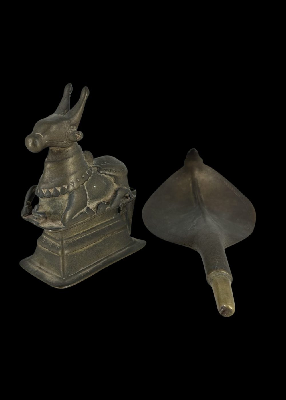 This brass sculpture from Maharashtra or Karnataka depicts Nandi, the sacred bull of Lord Shiva, seated in a composed posture. Adorned with a stylized ritual standard (dhwaja) behind him, the figure reflects the region’s mastery in metalcraft and its deep-rooted devotional traditions. Such objects were commonly used in temples or home shrines, symbolizing steadfast devotion, purity, and divine guardianship in Shaivite worship.