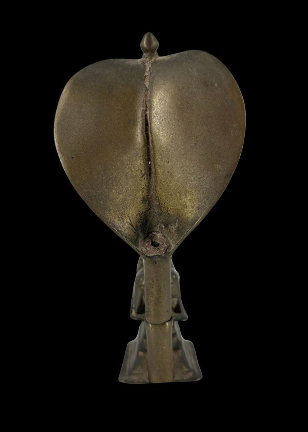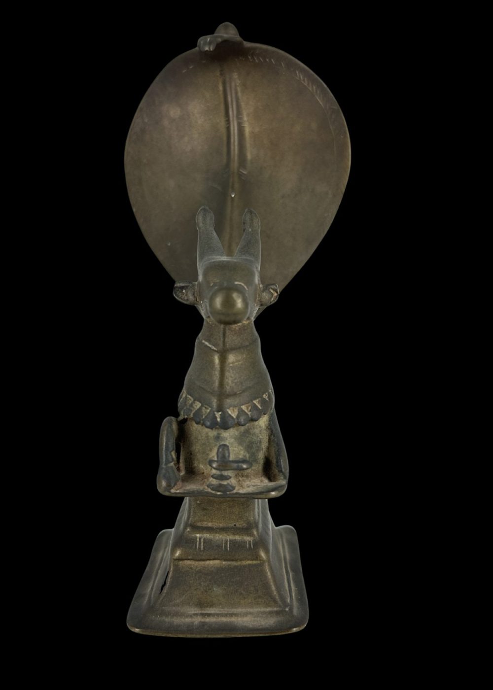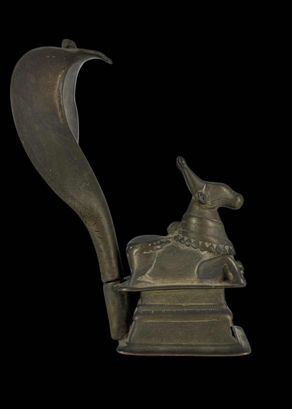 This brass sculpture from Maharashtra or Karnataka depicts Nandi, the sacred bull of Lord Shiva, seated in a composed posture. Adorned with a stylized ritual standard (dhwaja) behind him, the figure reflects the region’s mastery in metalcraft and its deep-rooted devotional traditions. Such objects were commonly used in temples or home shrines, symbolizing steadfast devotion, purity, and divine guardianship in Shaivite worship.