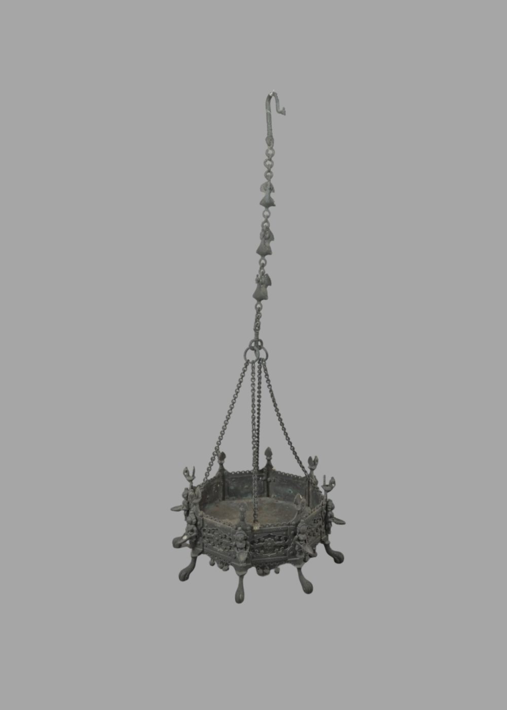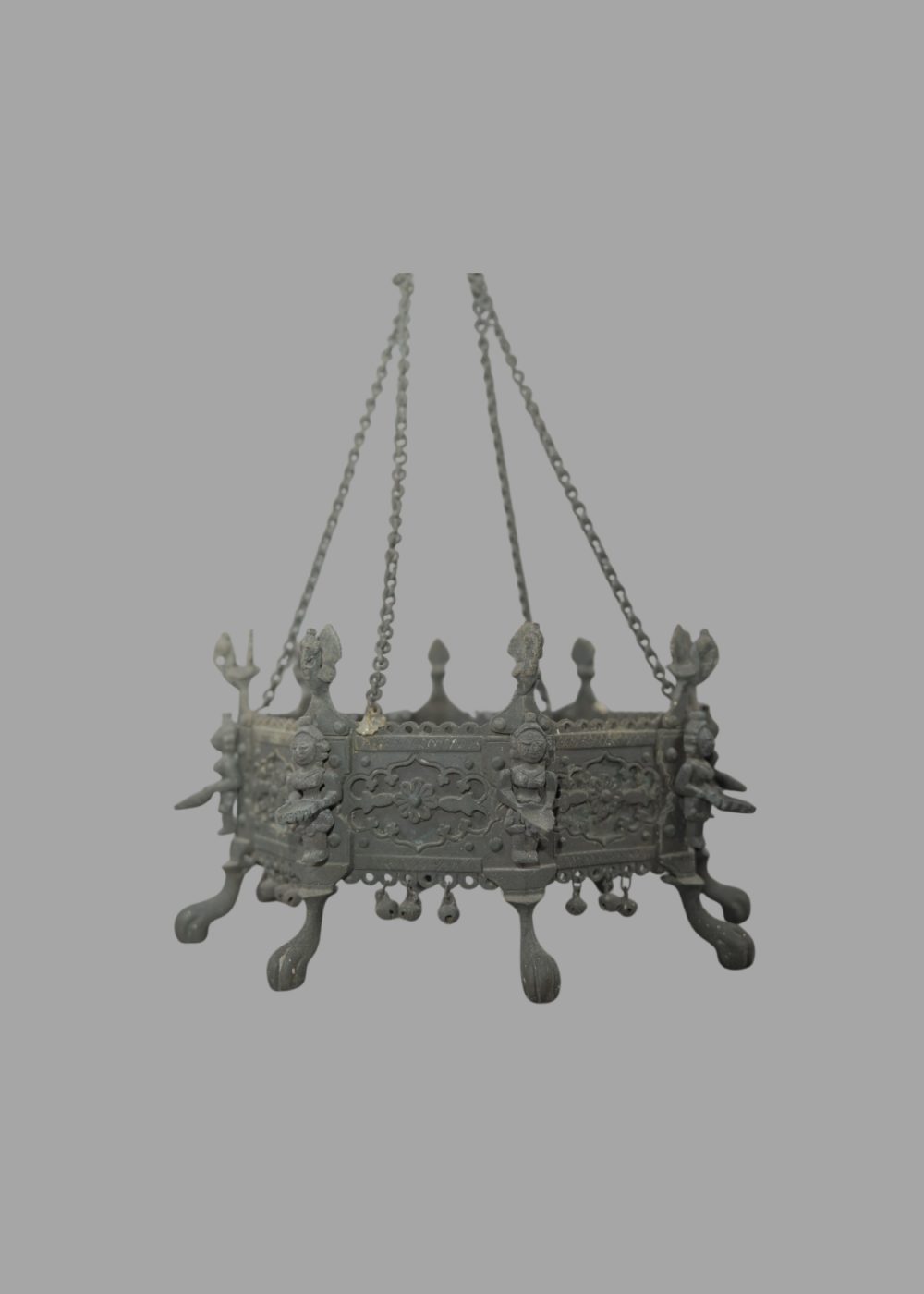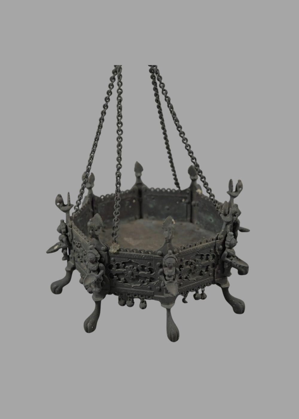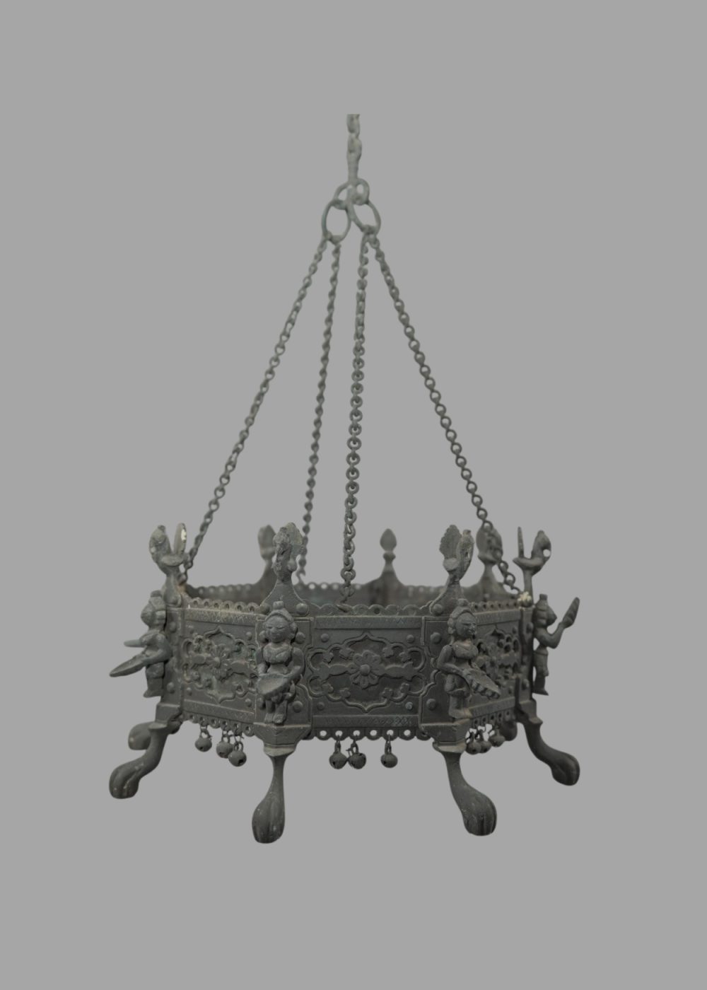 This ornate Brazier with Dipa Lakshmi Oil Lamps is a beautifully cast bronze hanging vessel used in traditional South Indian rituals. The circular brazier is adorned with finely detailed depictions of goddess Lakshmi figures holding lamps, symbolizing prosperity and divine illumination. Supported by intricate chains and suspended from a decorated hook, it rests on elegant curved legs. The detailed craftsmanship, floral motifs, and miniature bells enhance its aesthetic and spiritual significance, reflecting the region’s deep devotion and metalworking artistry.