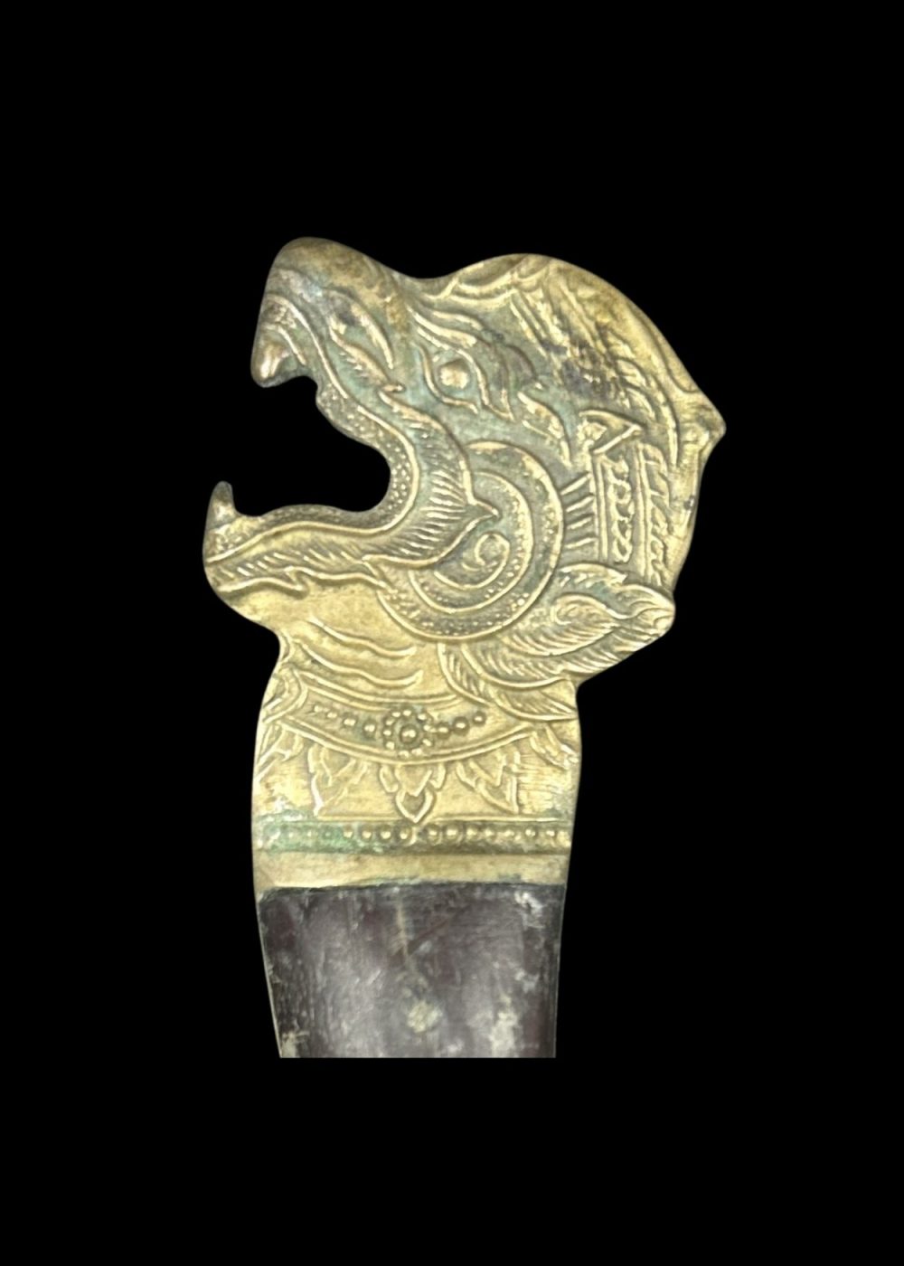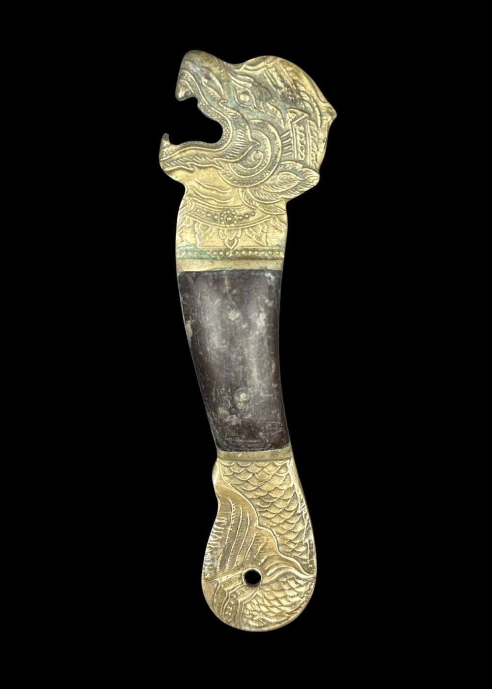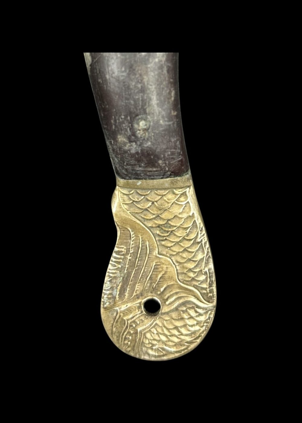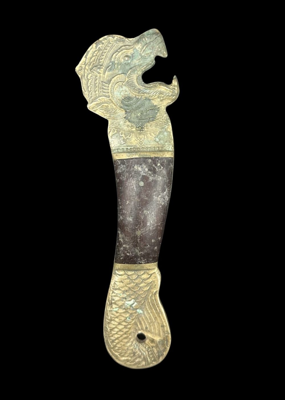 This unique bottle opener combines functionality with artistic craftsmanship. The handle features a boldly sculpted lion’s head in bronze, symbolizing strength and authority, while the lower section is adorned with fish-scale patterns. The central grip is made of polished wood, providing a comfortable hold. Likely handcrafted, this piece merges traditional Indian decorative motifs with a practical modern use, making it both a collectible and a conversation piece.