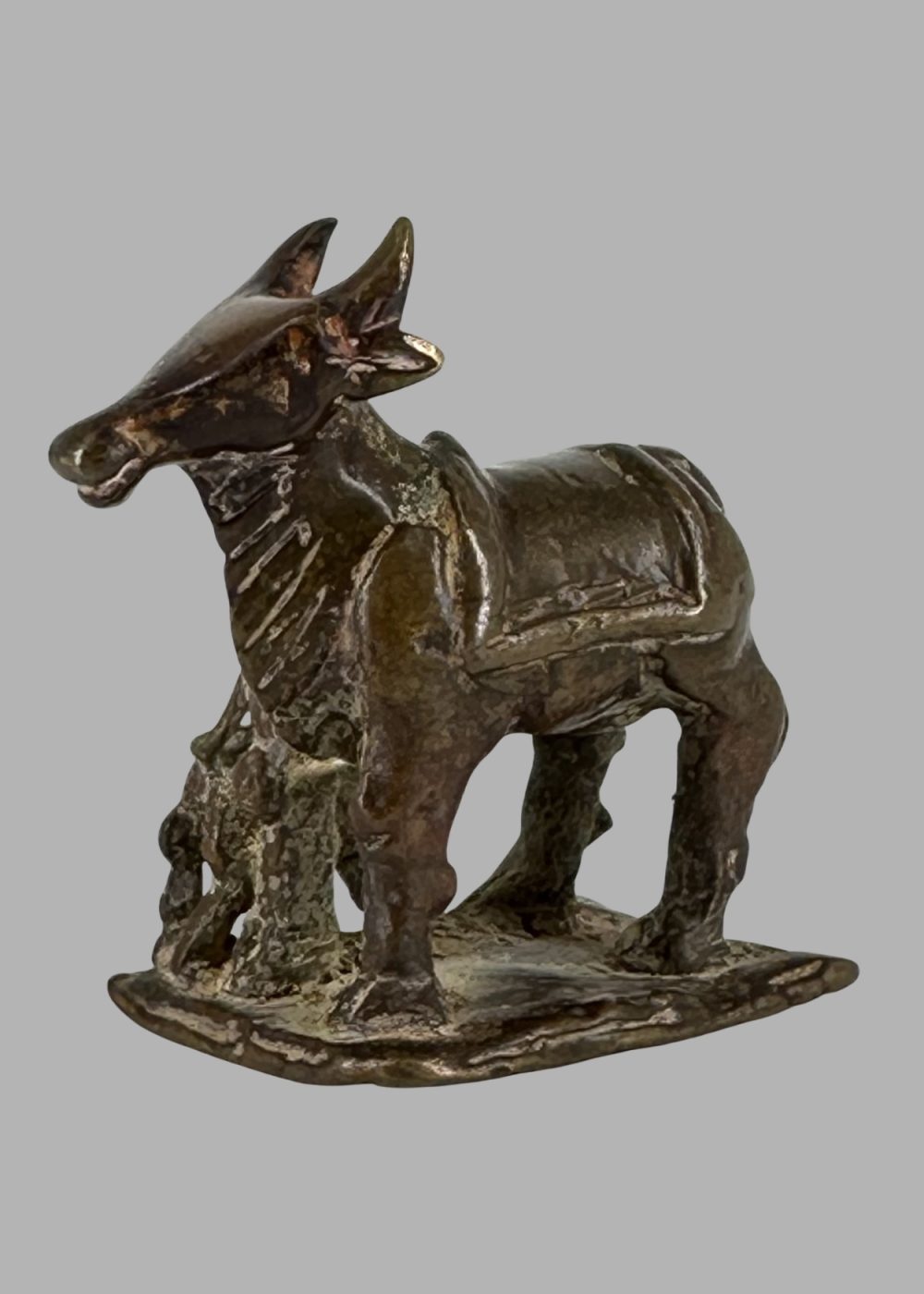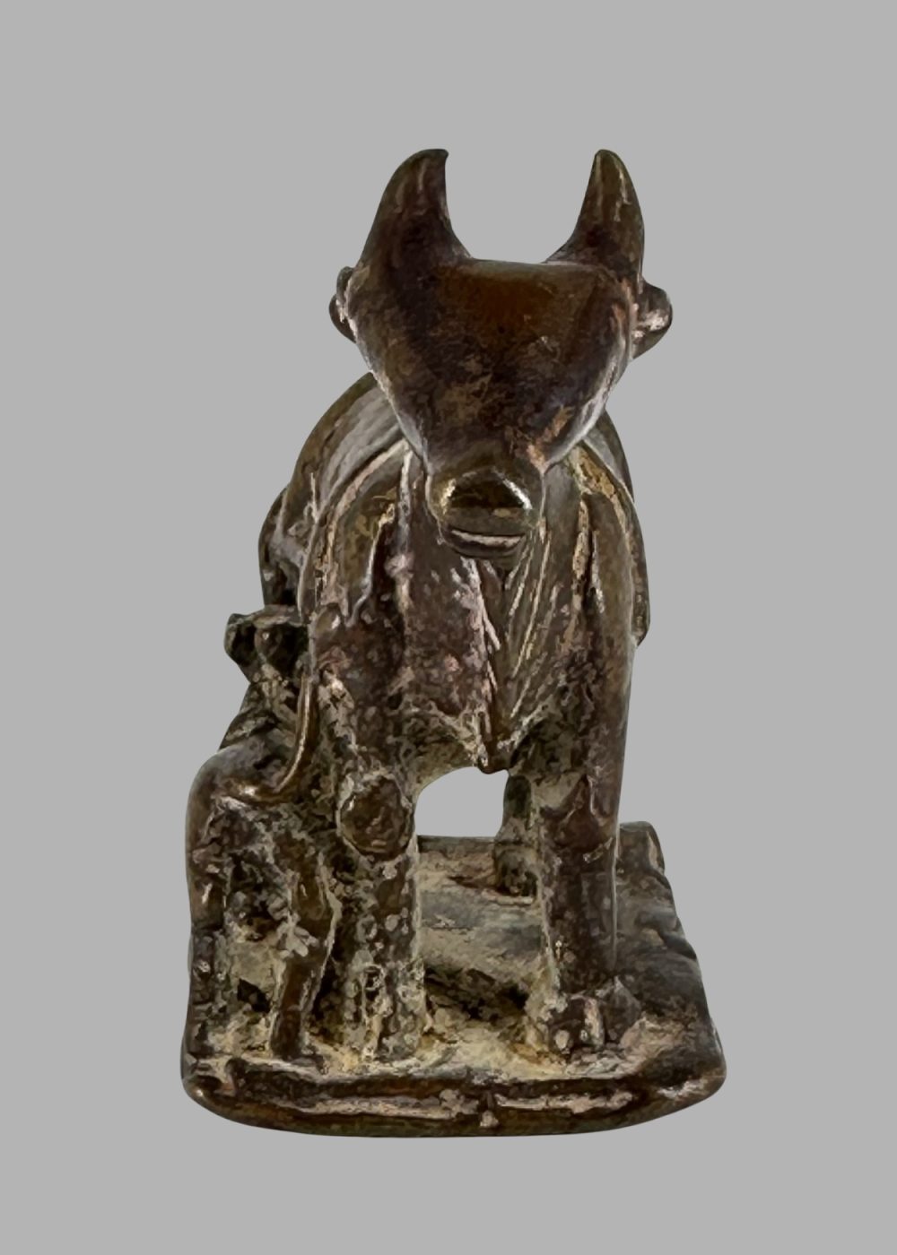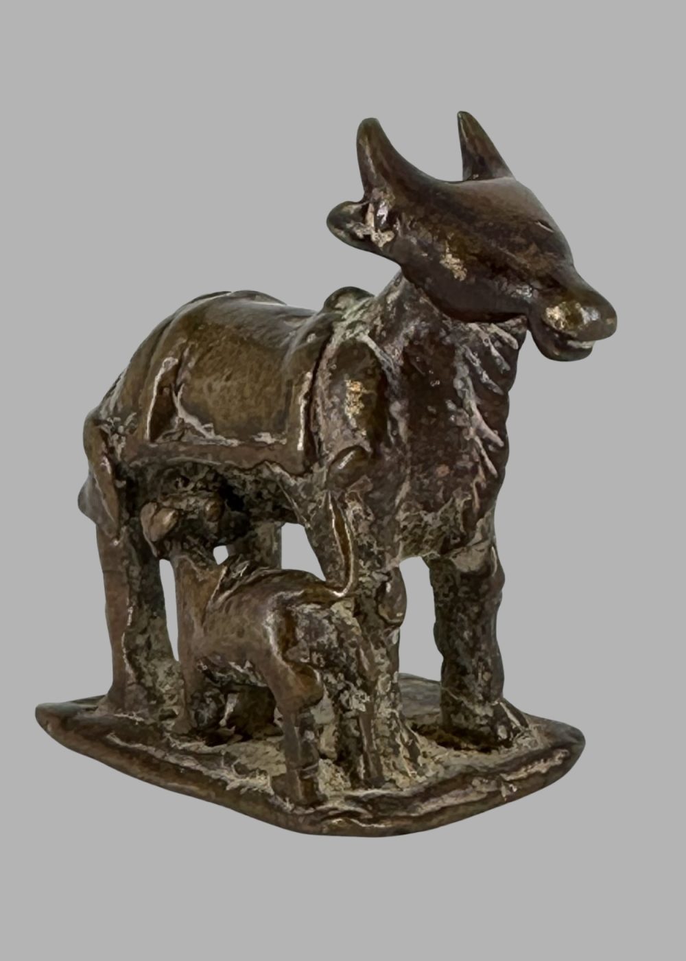This bronze figurine from the Deccan region depicts a nurturing cow with her suckling calf, symbolizing abundance, motherhood, and reverence in Indian culture. Crafted with rustic charm and regional stylistic flair, the piece embodies the Deccan’s unique blend of cultural influences and artistic expression prevalent during the period.