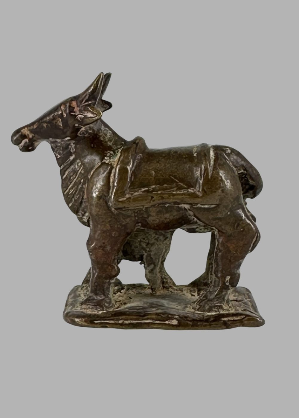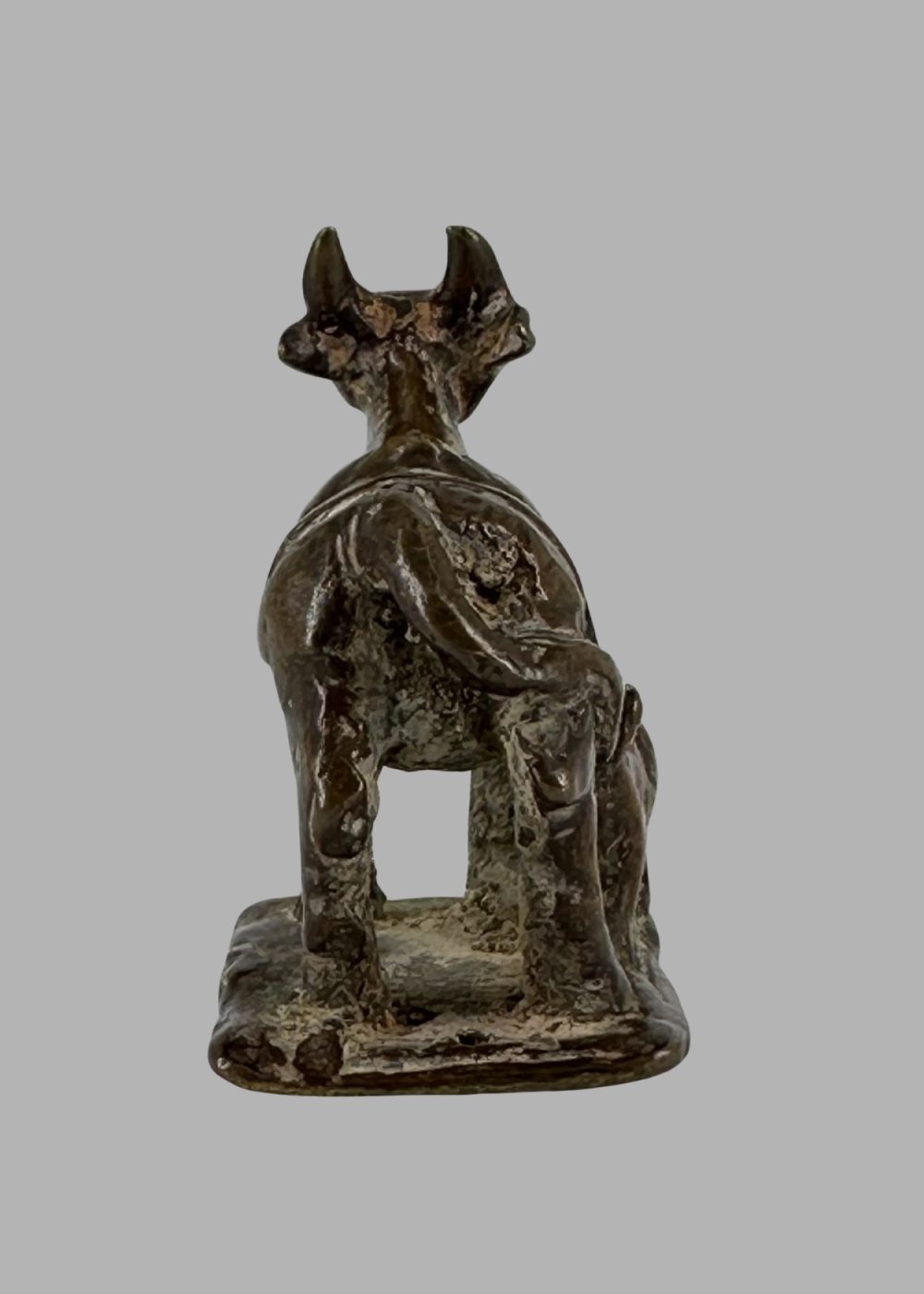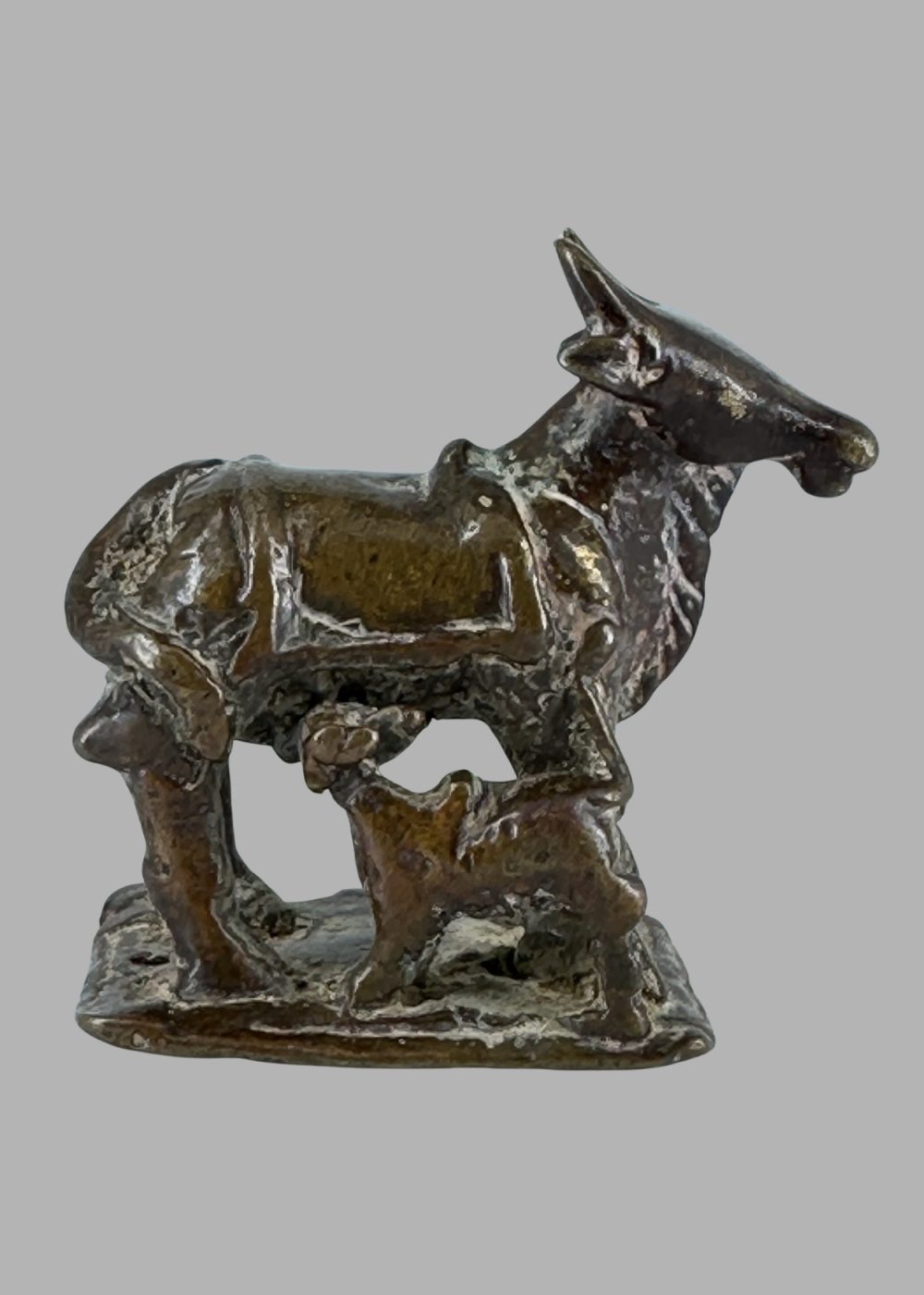 This bronze figurine from the Deccan region depicts a nurturing cow with her suckling calf, symbolizing abundance, motherhood, and reverence in Indian culture. Crafted with rustic charm and regional stylistic flair, the piece embodies the Deccan’s unique blend of cultural influences and artistic expression prevalent during the period.