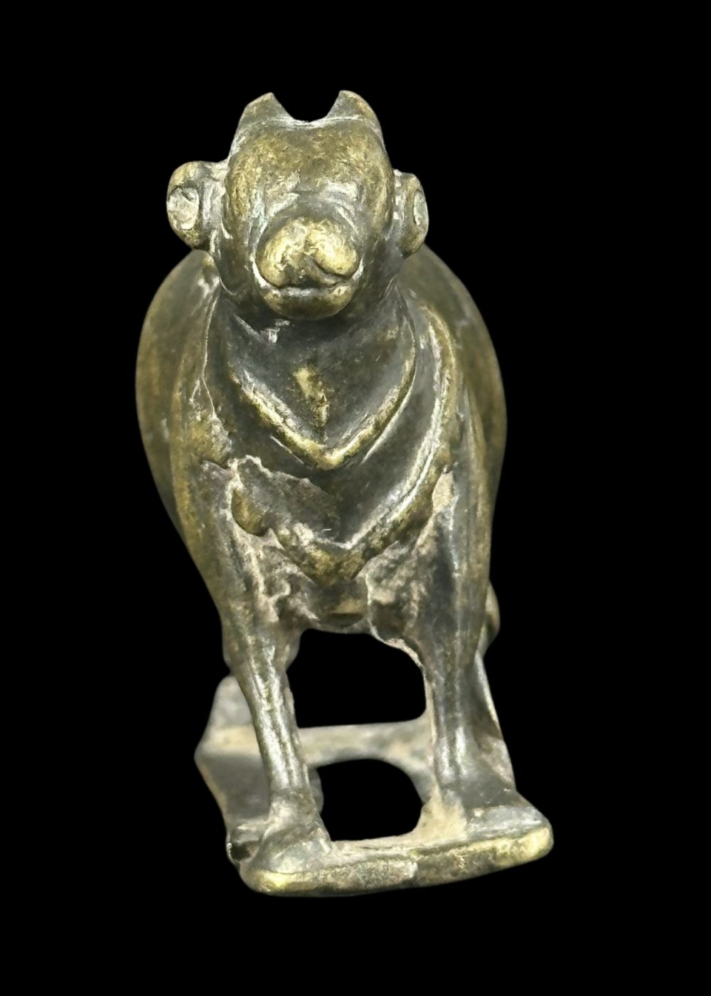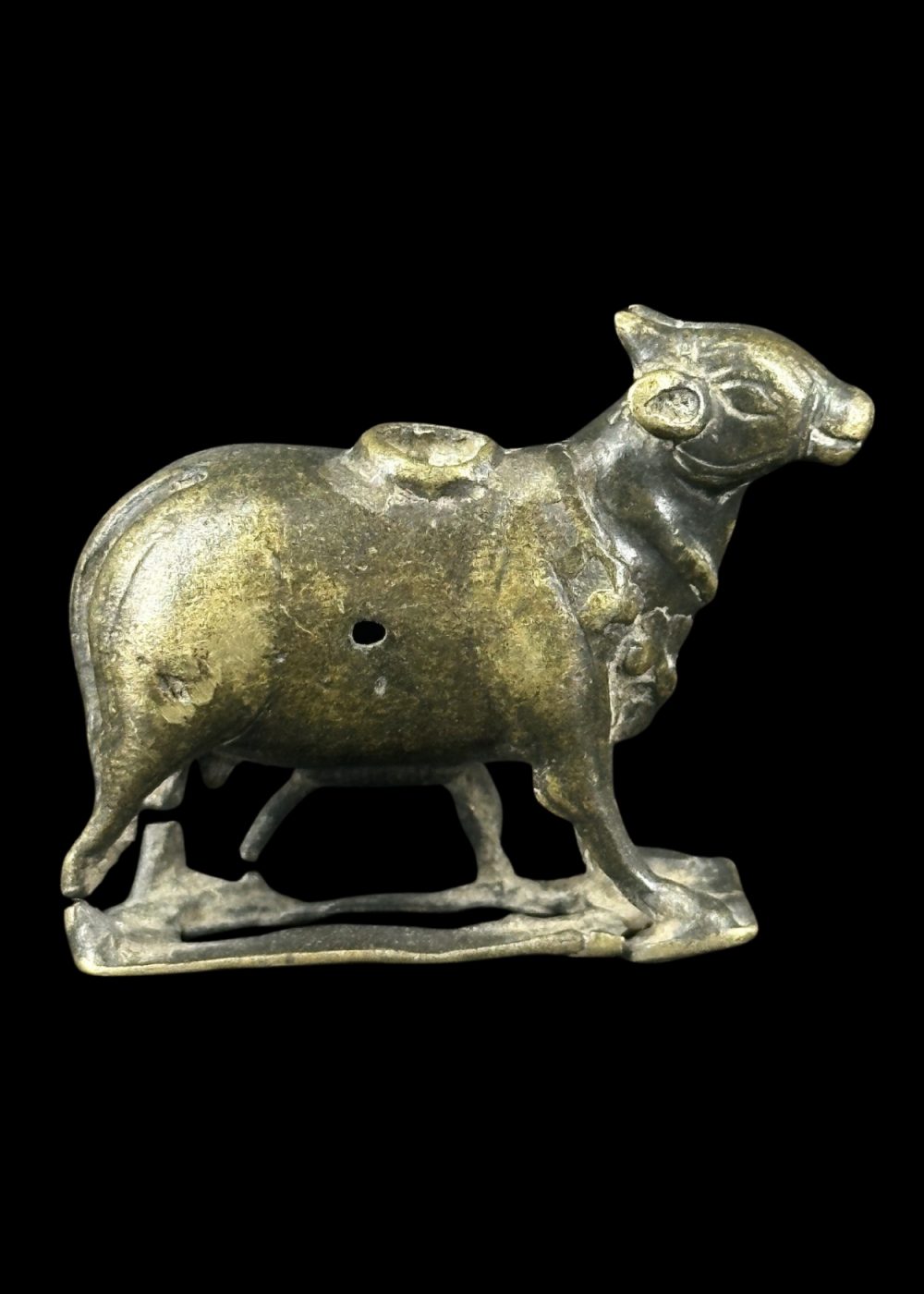 A finely cast bronze figurine depicting a cow standing protectively over a nursing calf. Set on a flat base, the composition captures a tender moment of maternal care with naturalistic detailing in the animals’ features. Crafted in England around the piece reflects both artistic sensitivity and cultural appreciation for agrarian life.