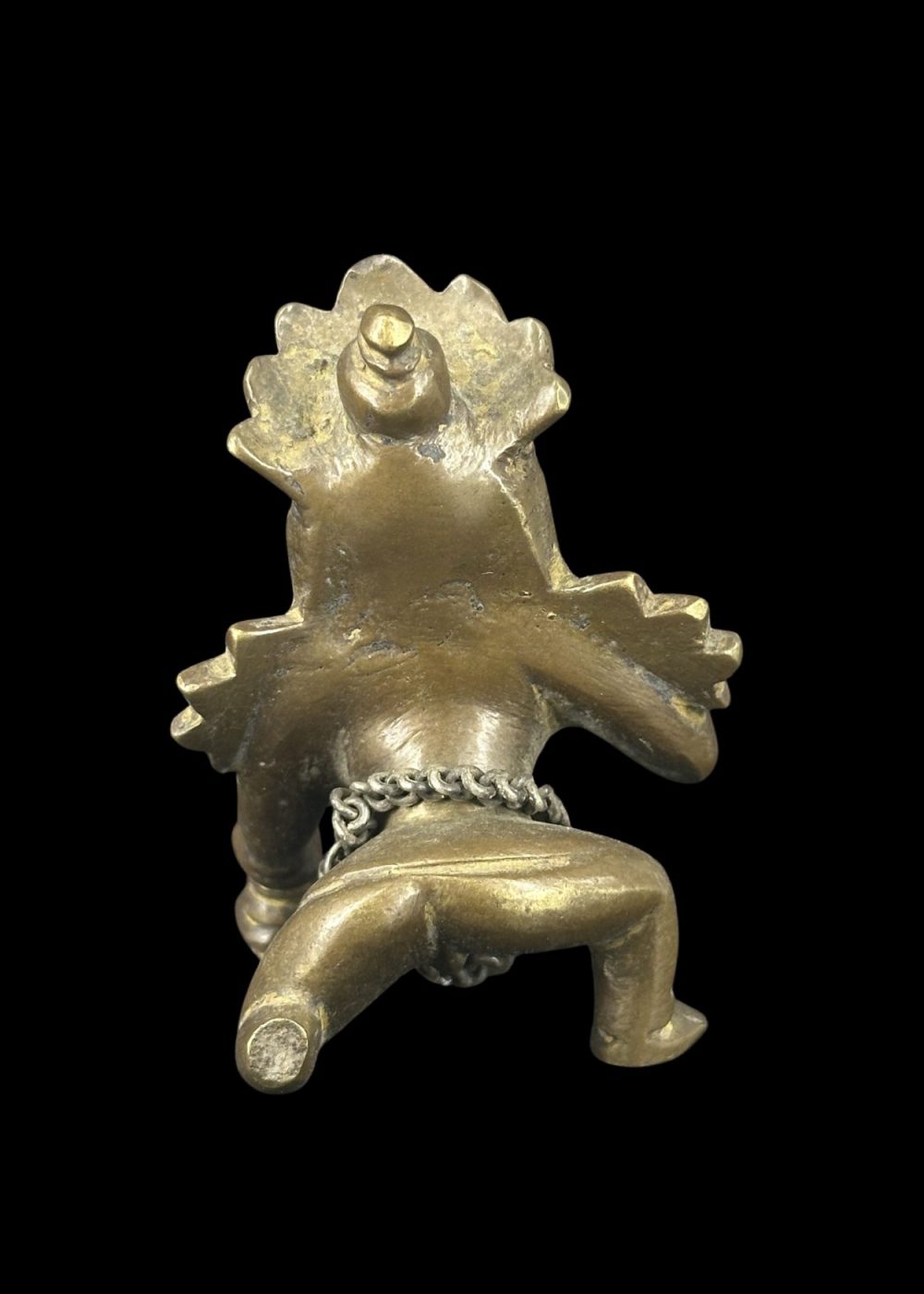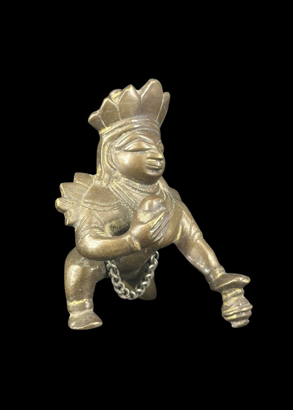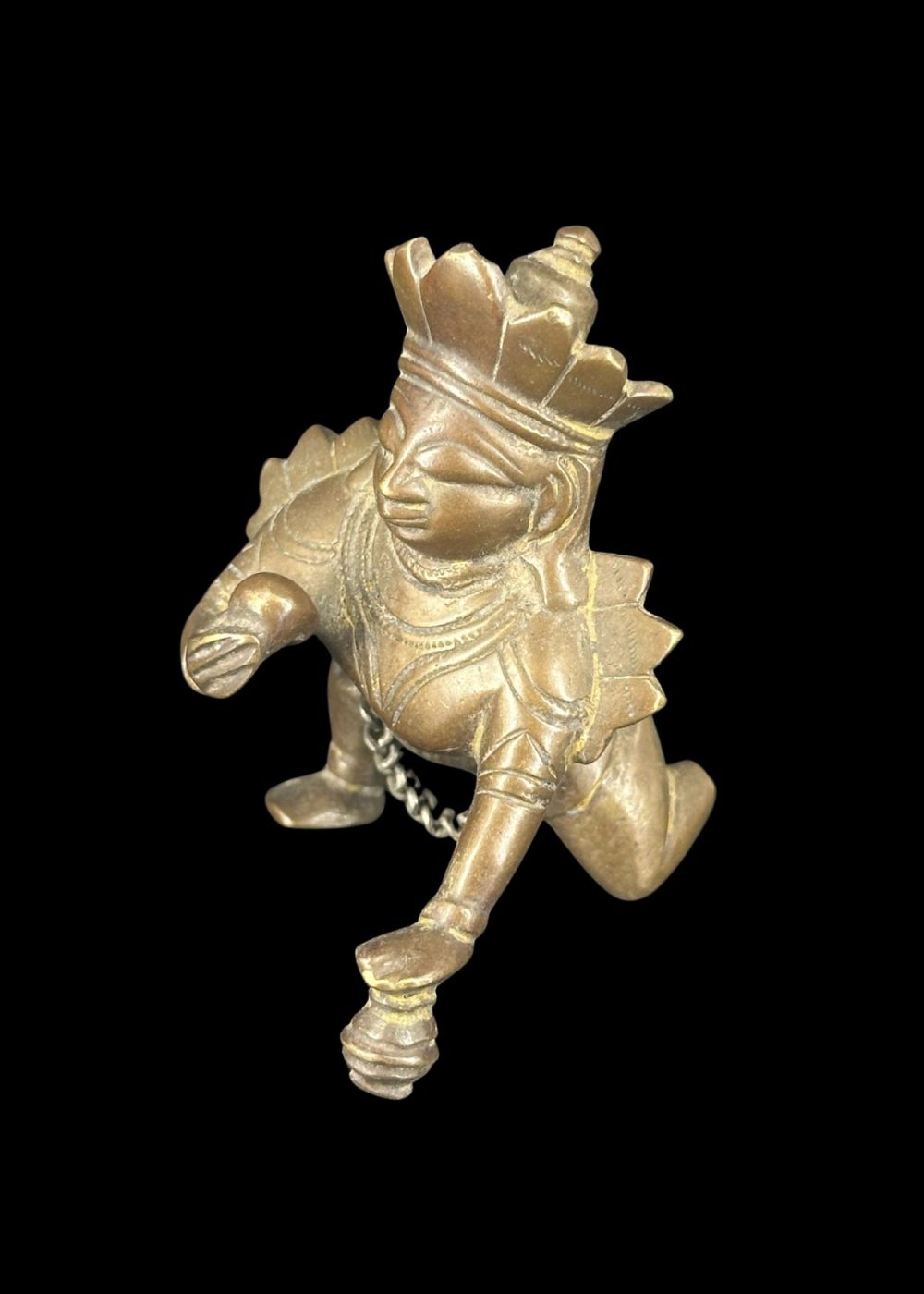 This bronze sculpture depicts Lord Krishna in his child form, known as Bala Krishna, shown crawling on his knees. The figure holds a butter ball in one hand, symbolizing his playful and mischievous nature, while adorned with a crown and jewelry details. A small chain is attached around the waist, enhancing its ornamental appeal. This traditional artwork reflects devotion and cultural artistry, often used in household shrines for worship.