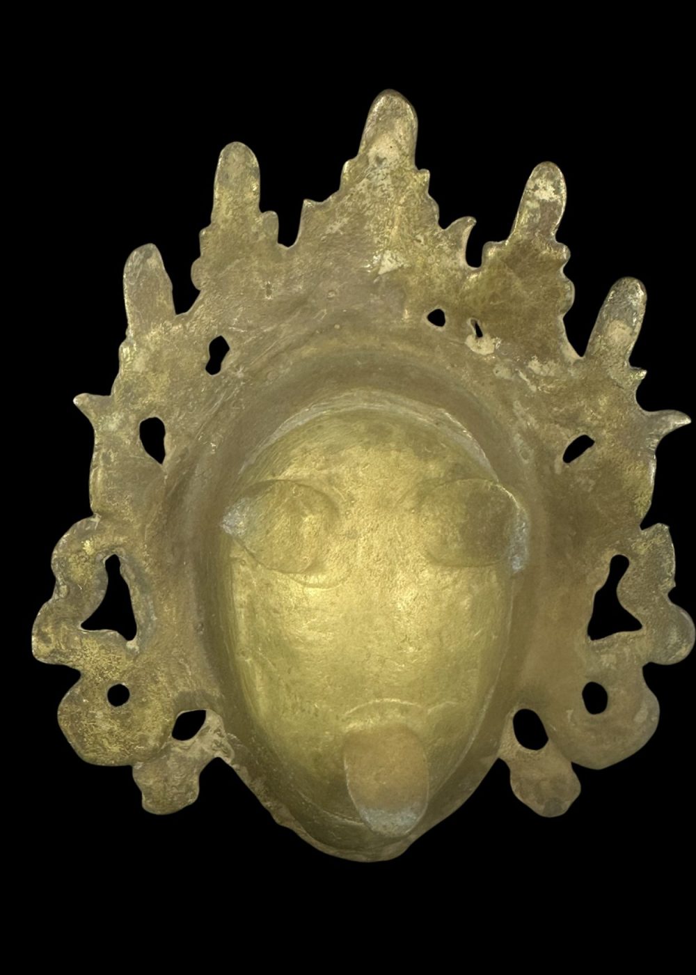 This fierce and intricate bronze mask represents Kirtimukha, a mythological protective face often found in South Asian temple architecture. Characterized by bulging eyes, wide-open mouth, and elaborate headdress, the mask embodies a guardian spirit meant to ward off evil. The presence of serpentine motifs and ornamental detailing reflects its ritual significance and artistic craftsmanship, likely originating from a temple facade or sacred space.