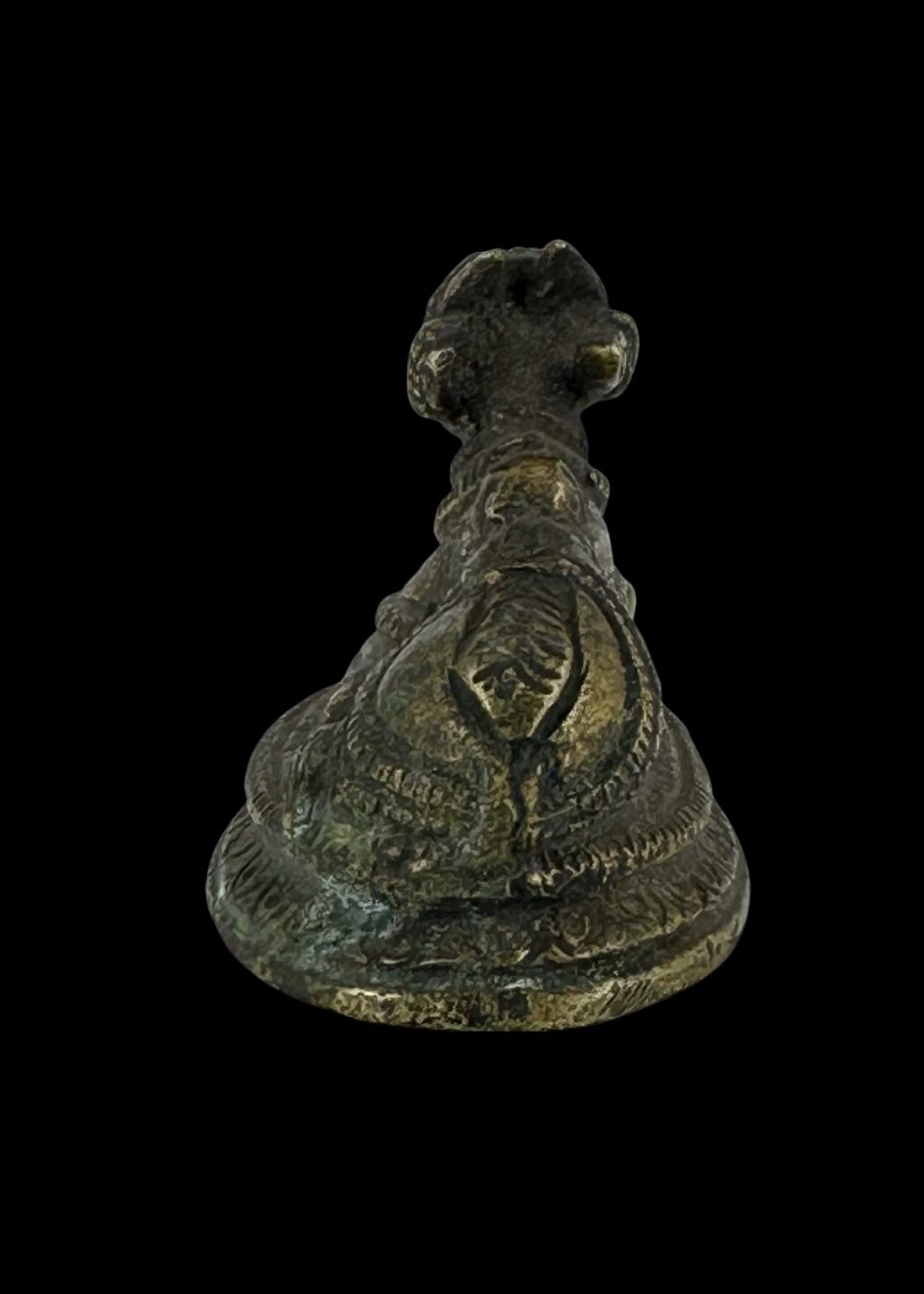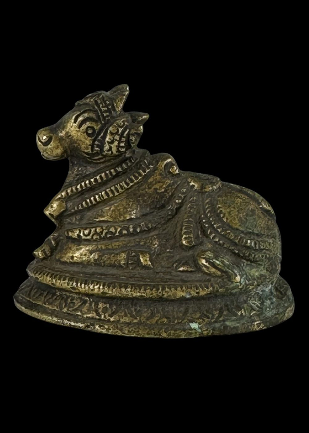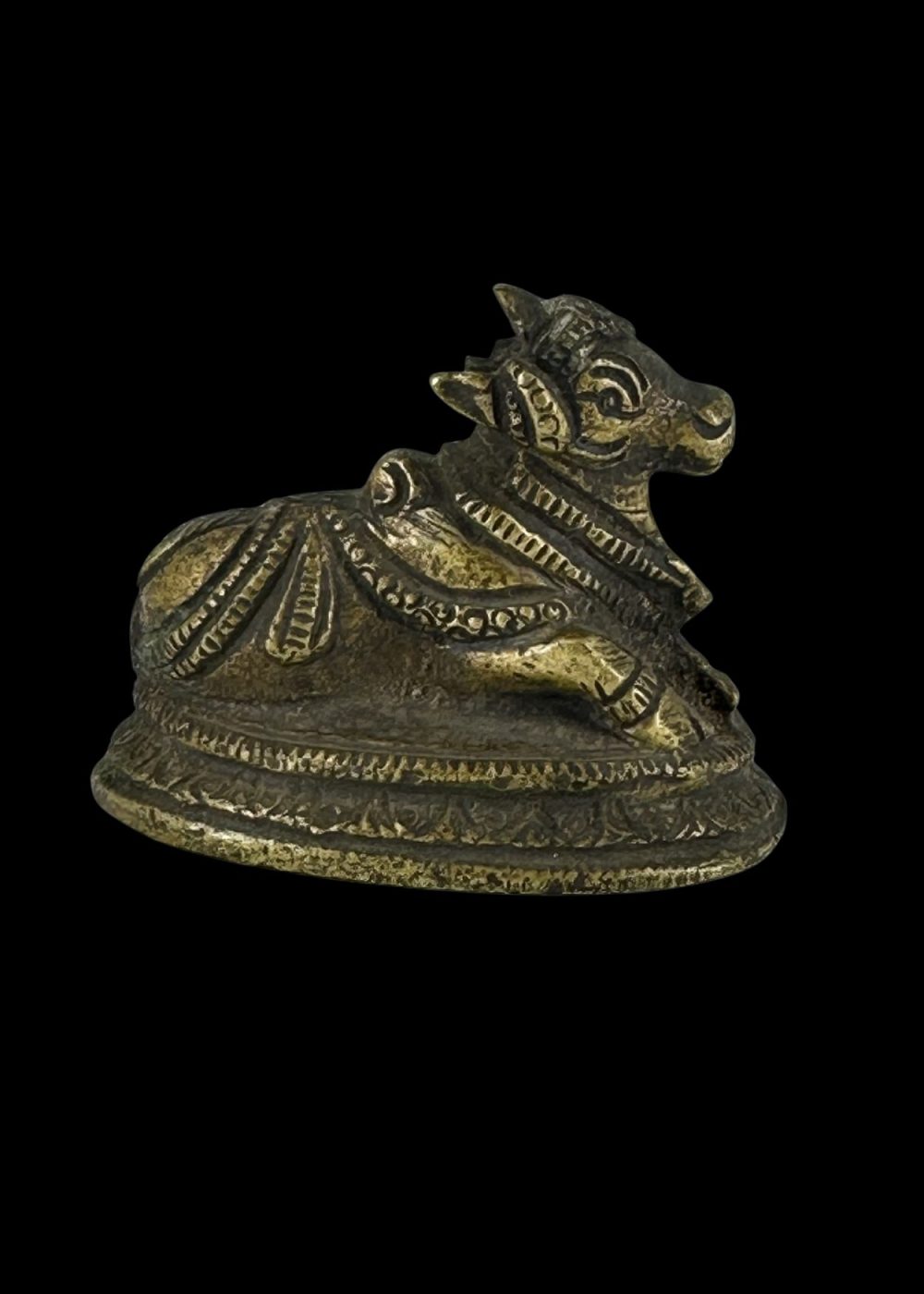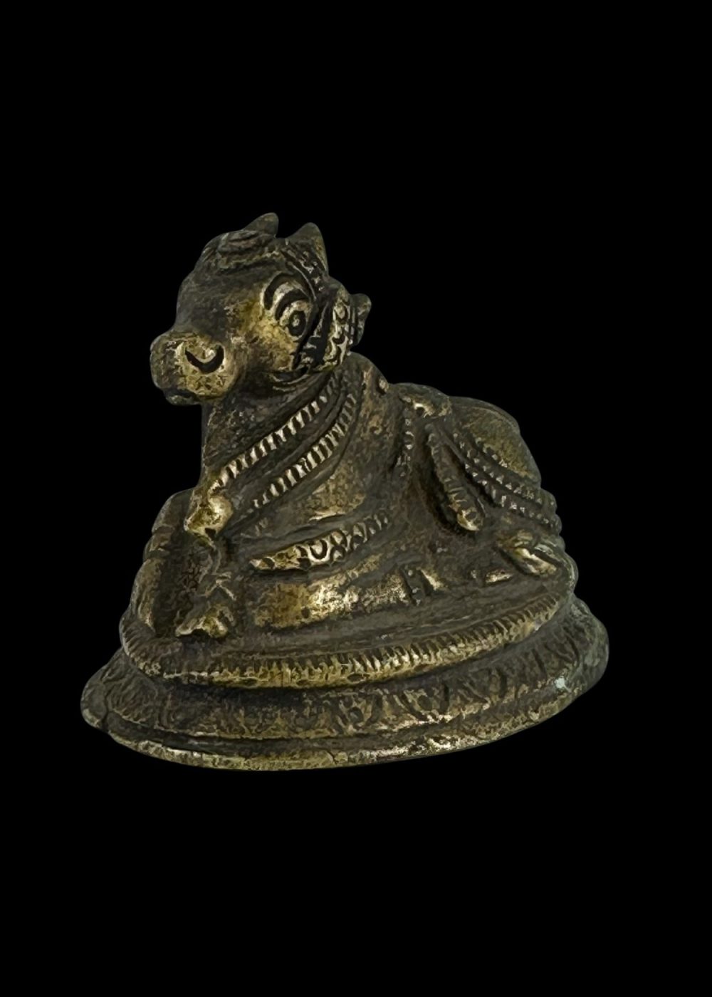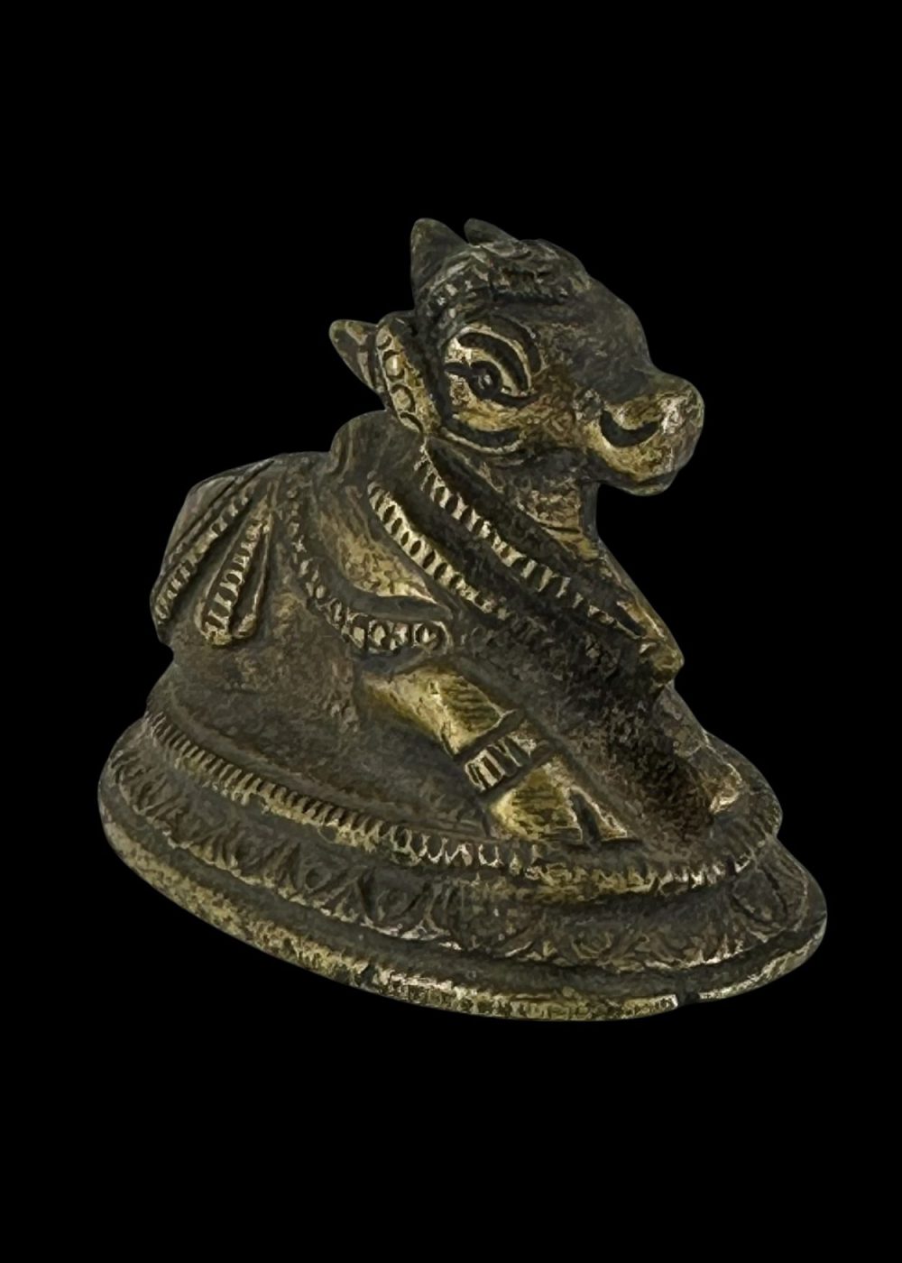 This bronze sculpture from South India features Nandi, the revered bull and divine vehicle of Lord Shiva, in a seated and adorned posture. The piece exemplifies traditional regional craftsmanship with intricate detailing on the body and base, reflecting the deep-rooted practice of metal artistry used in household worship and ritual offerings. Nandi represents loyalty, strength, and spiritual devotion in Shaivite tradition.