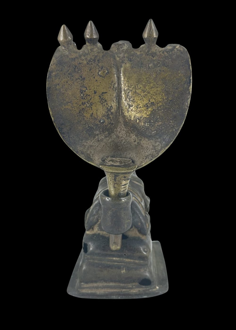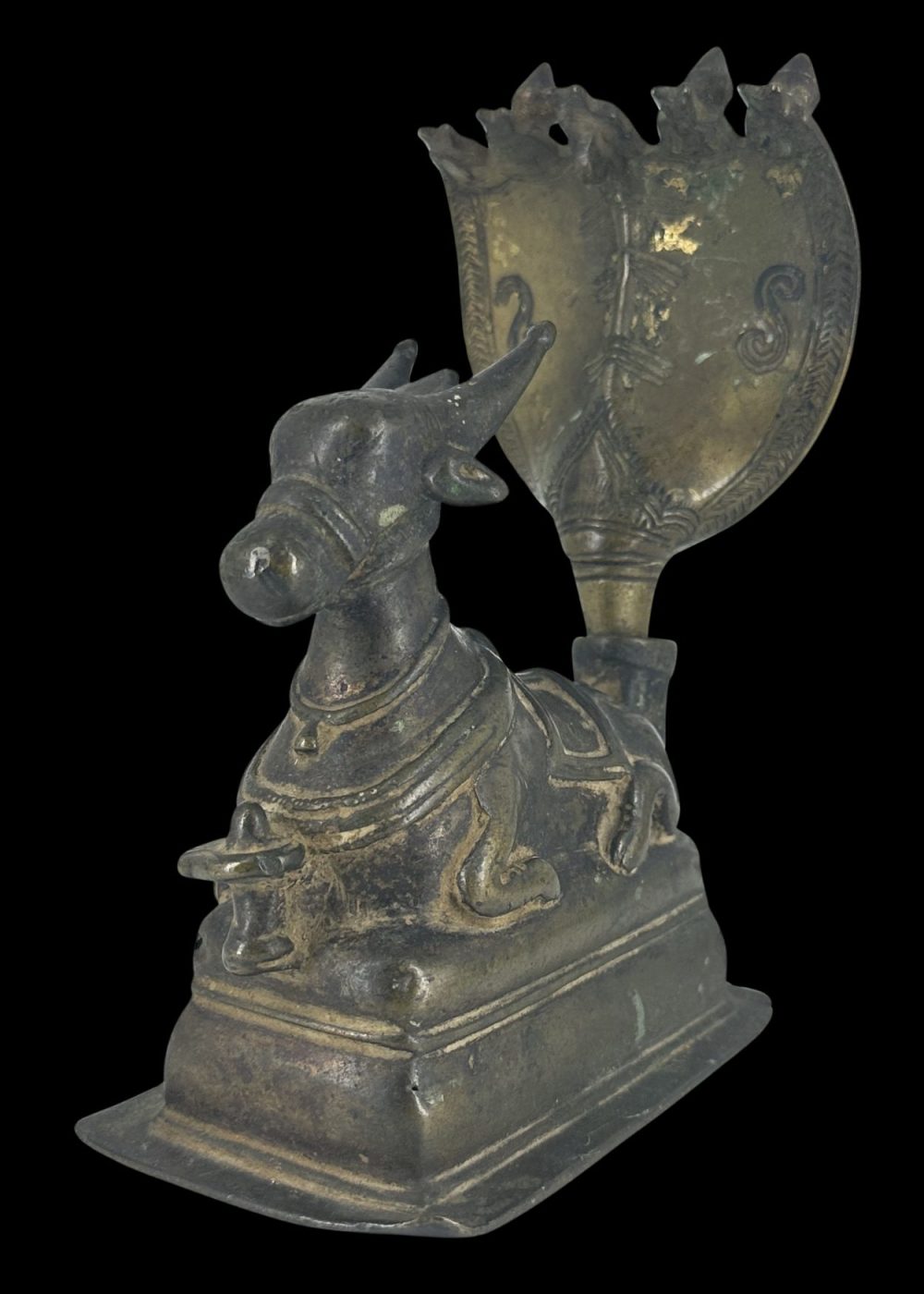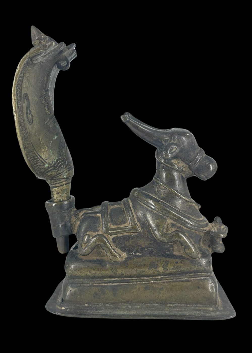 This bronze from Karnataka or Maharashtra portrays Nandi, the sacred bull and mount of Lord Shiva, seated in a composed posture. Adorned with ornate trappings and accompanied by a ceremonial standard (dhwaja), the sculpture reflects the devotional craftsmanship typical of the region. Used in temples or household altars, such pieces symbolize strength, devotion, and divine service in Hindu tradition.