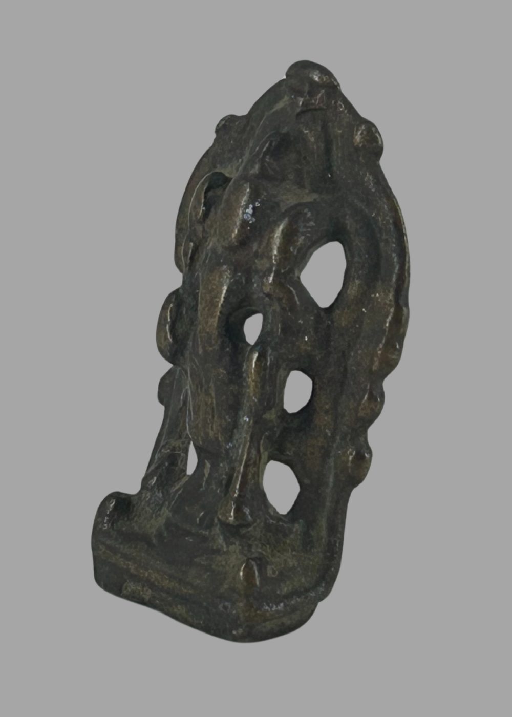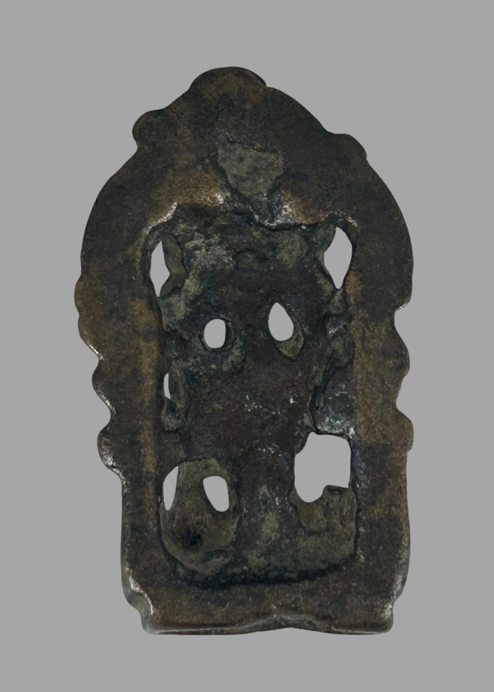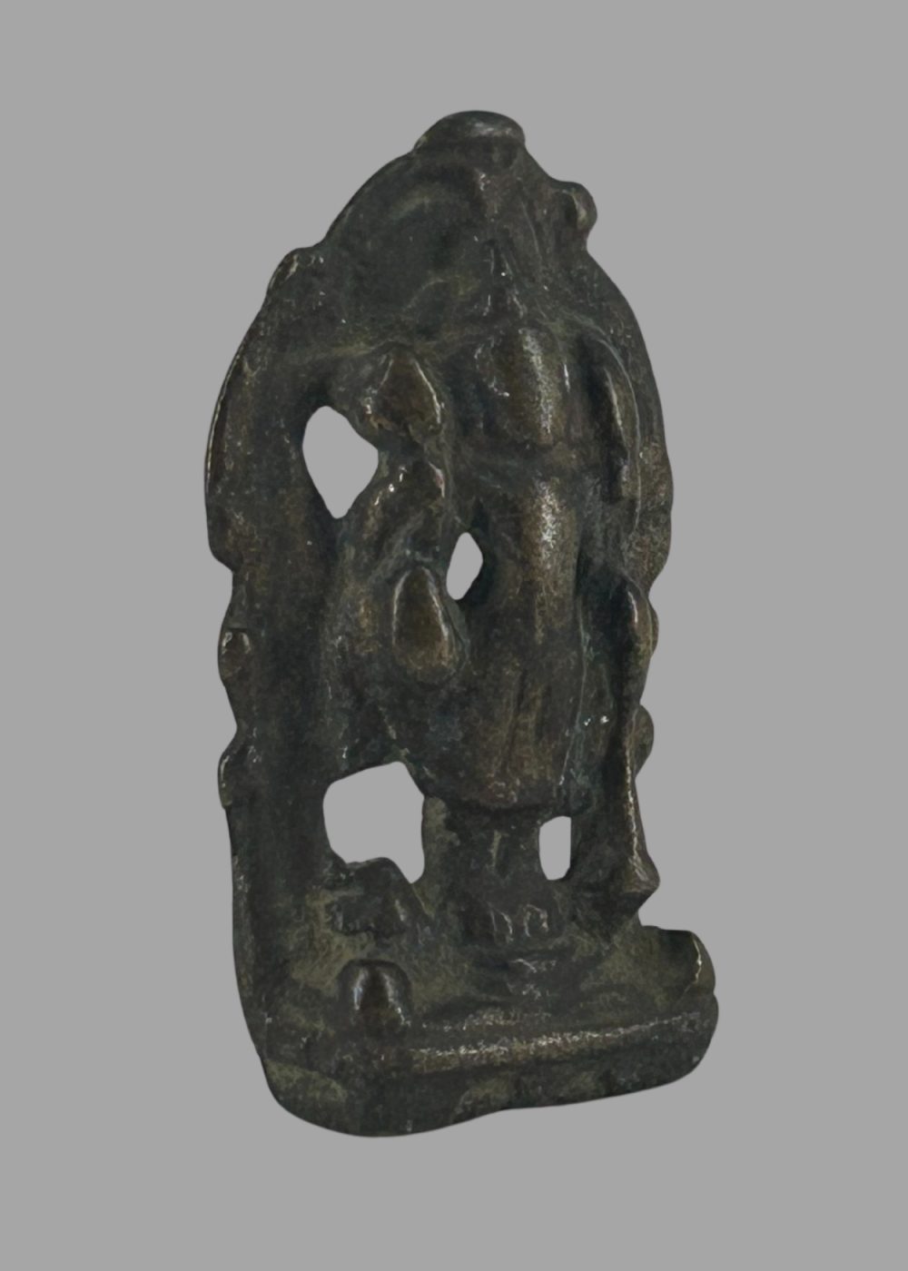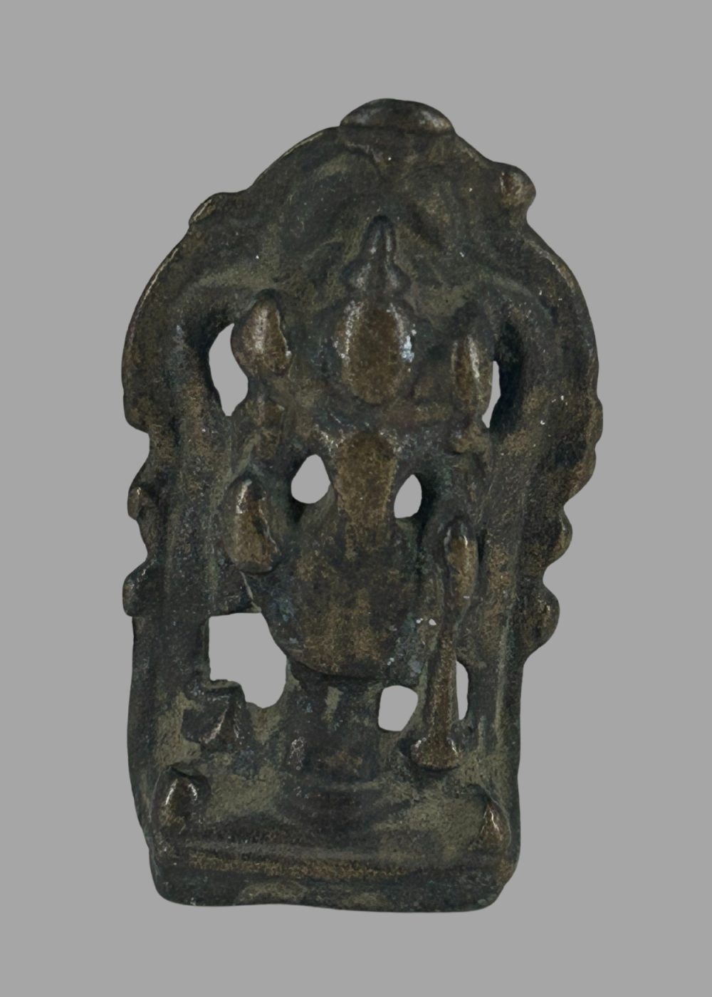 This small bronze shrine plaque depicts a seated deity framed within an ornate prabhavali (arch). The figure is shown with multiple arms, holding symbolic attributes, suggesting divine power and protection. The compact form and worn surface indicate ritual use, likely serving as a household votive piece in South India. Its simplicity and devotional character reflect the intimate nature of personal worship.