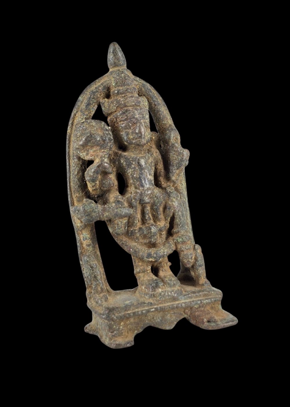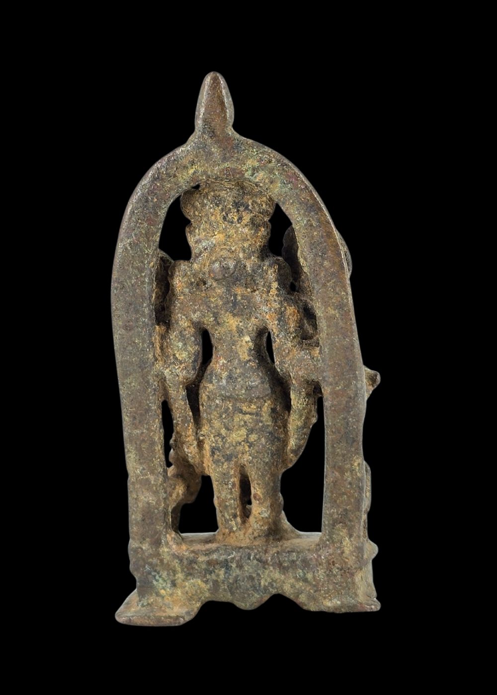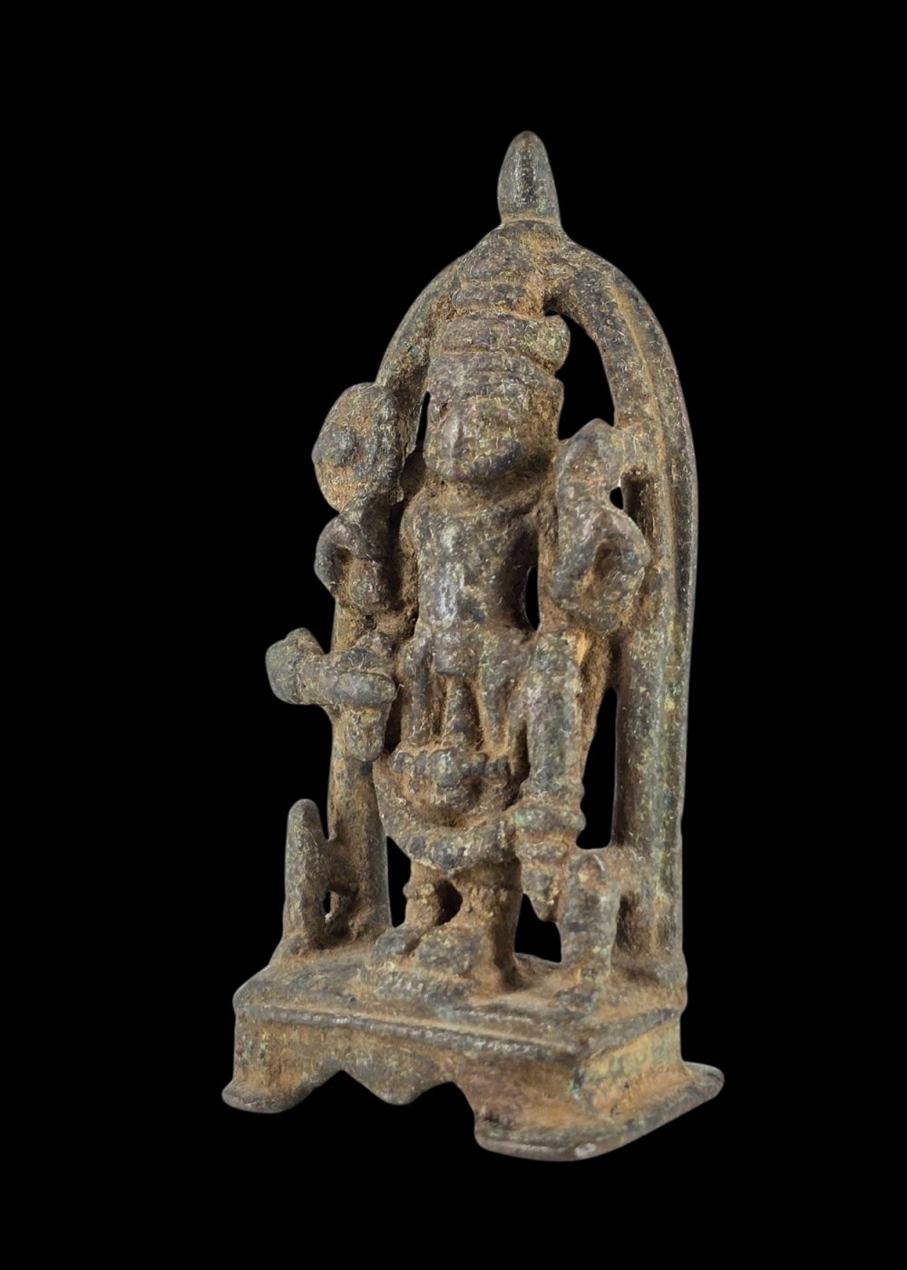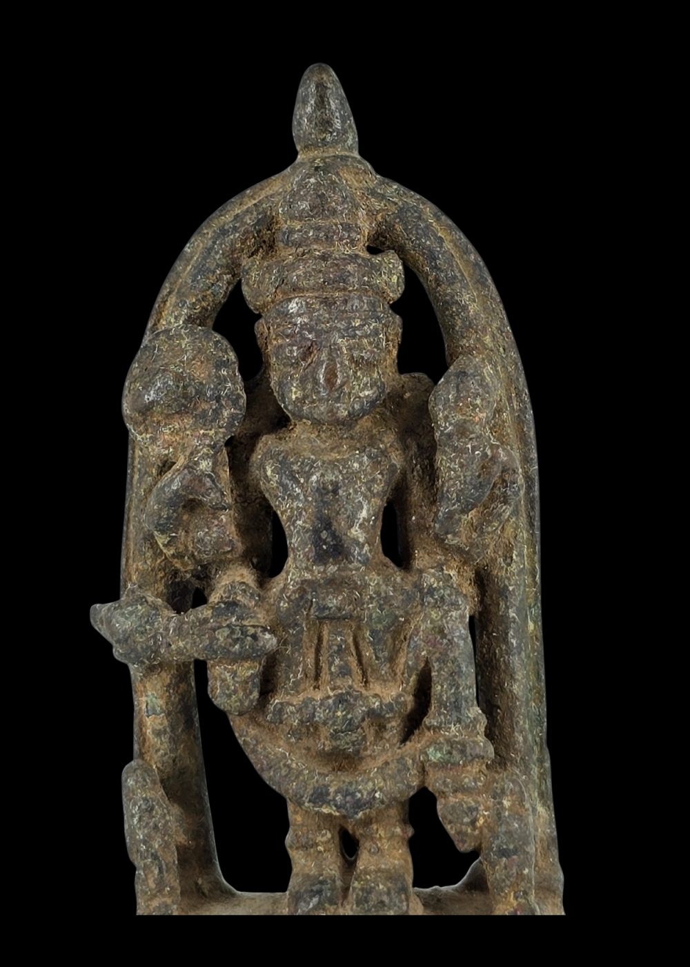 This is an antique bronze idol representing a standing deity within an arched frame, showing significant age and patina. The figure’s upright posture, traditional attire, and ornamentation reflect historic Indian religious art, making this piece a spiritual and collectible artifact.