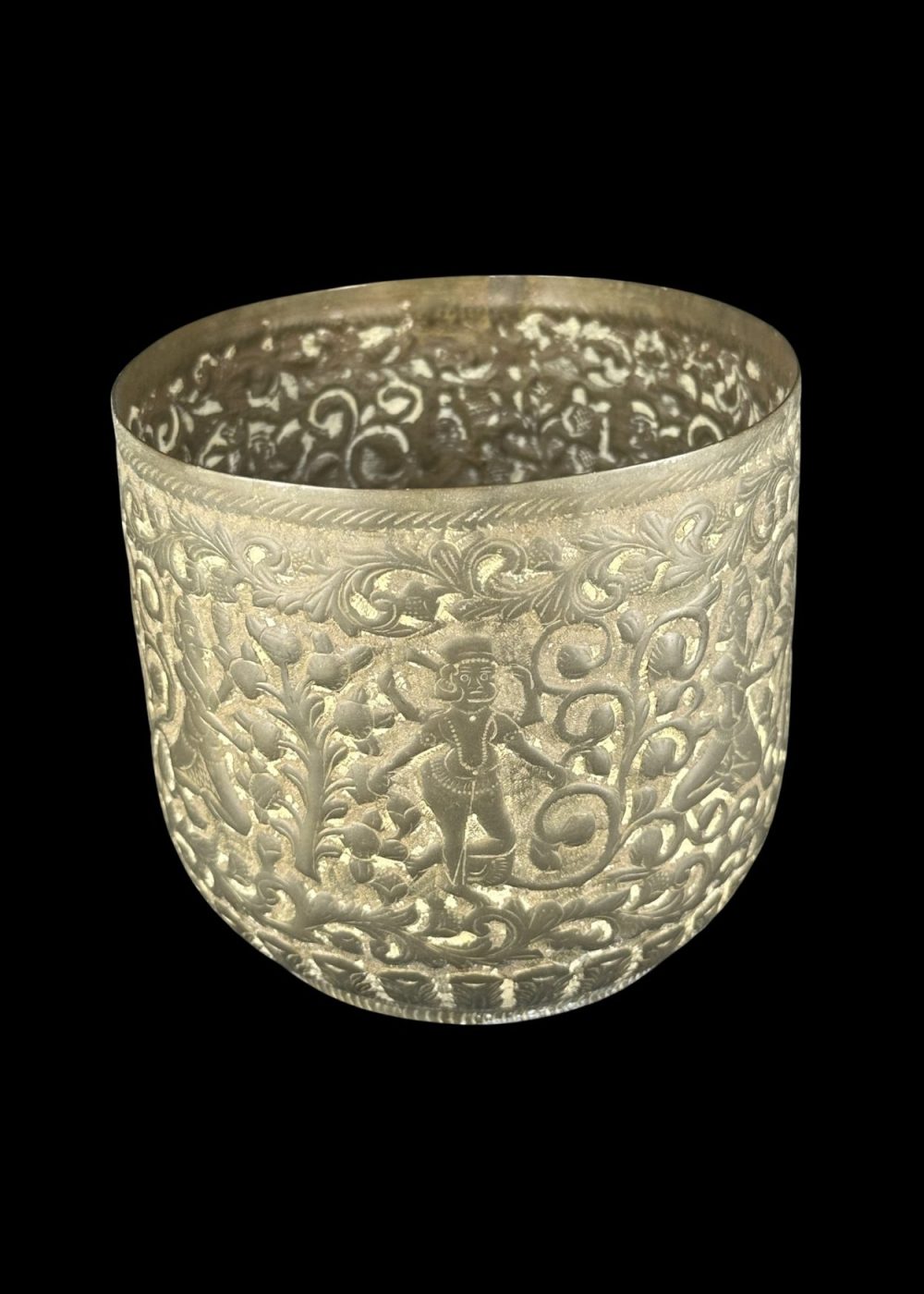 This petite bronze vase presents a continuous band of figural narratives encircling its midsection. Each scene unfolds with human characters rendered in high-relief, their garments and attributes defined through precise chiseling. Interwoven scrolling vines and stylized lotus motifs fill the background, offering a harmonious counterpoint to the dynamic figures. The vase’s gently flared lip and rounded shoulder enhance its balanced silhouette, while the dark patina underscores the depth of the relief work. Such a vessel likely served as a decorative object, reflecting both the artistic prowess and storytelling traditions of its region.