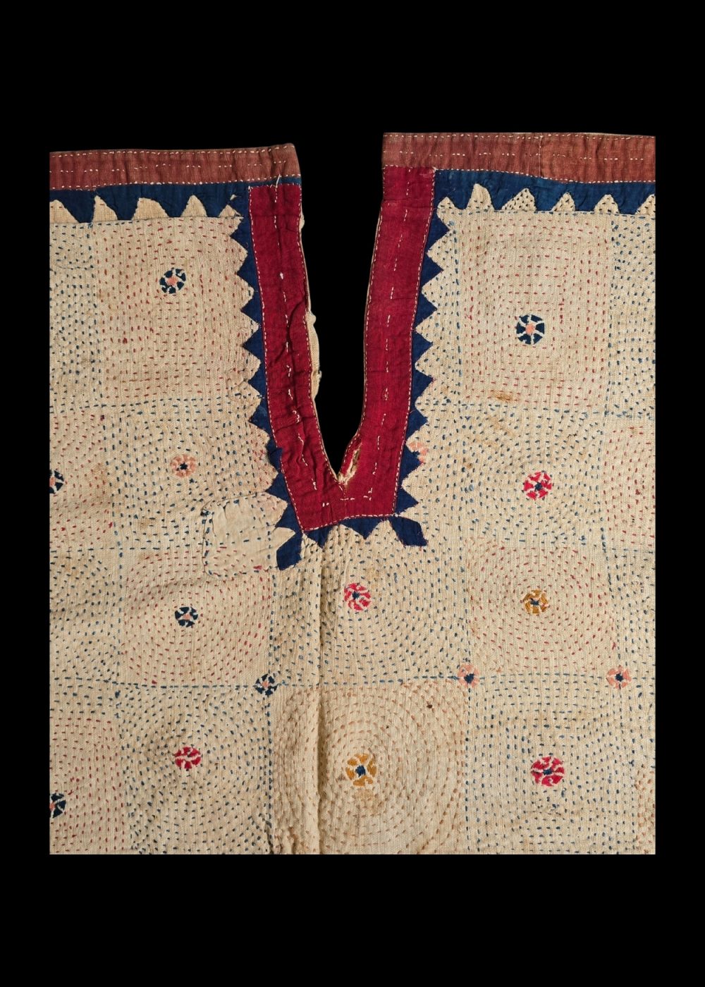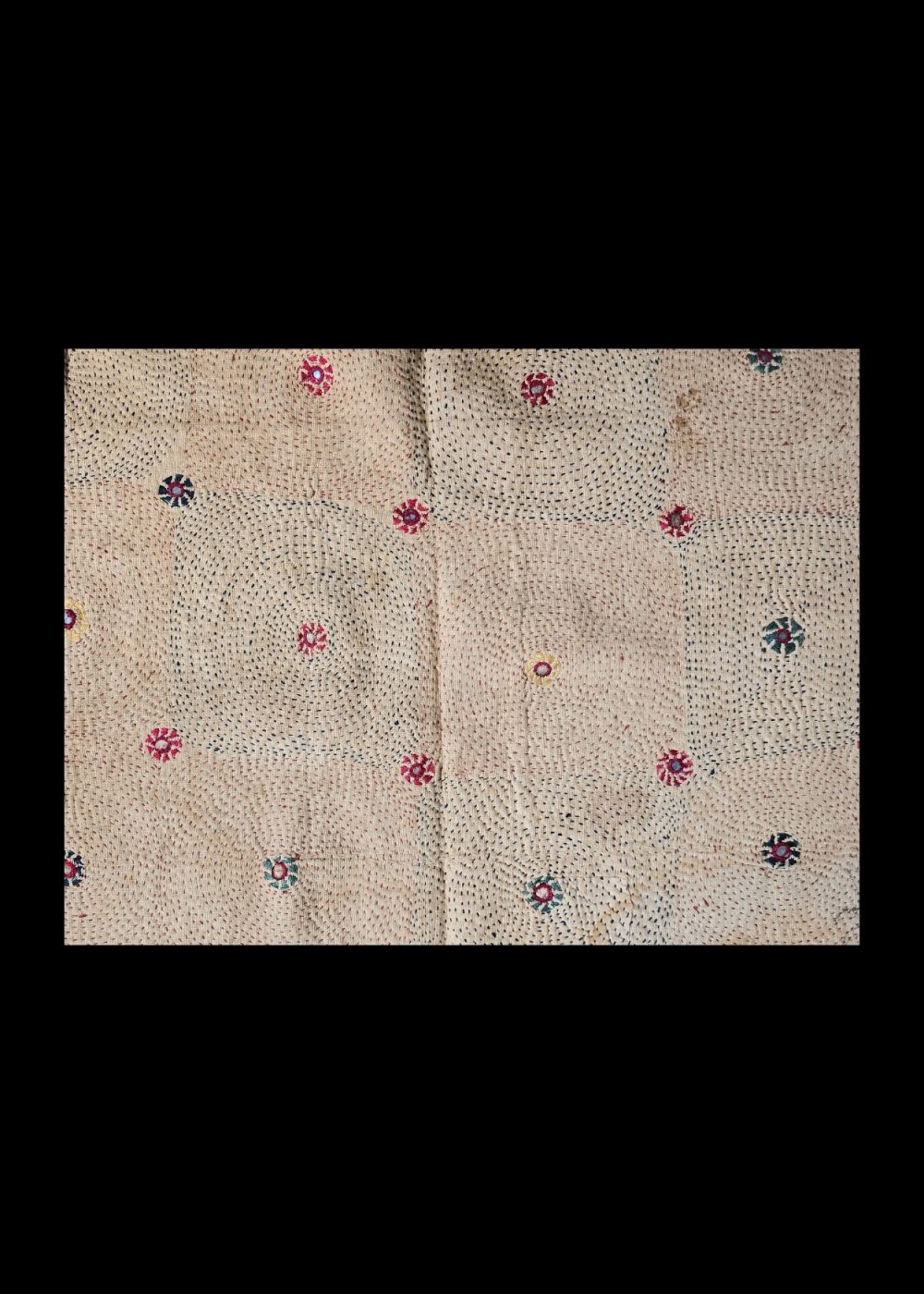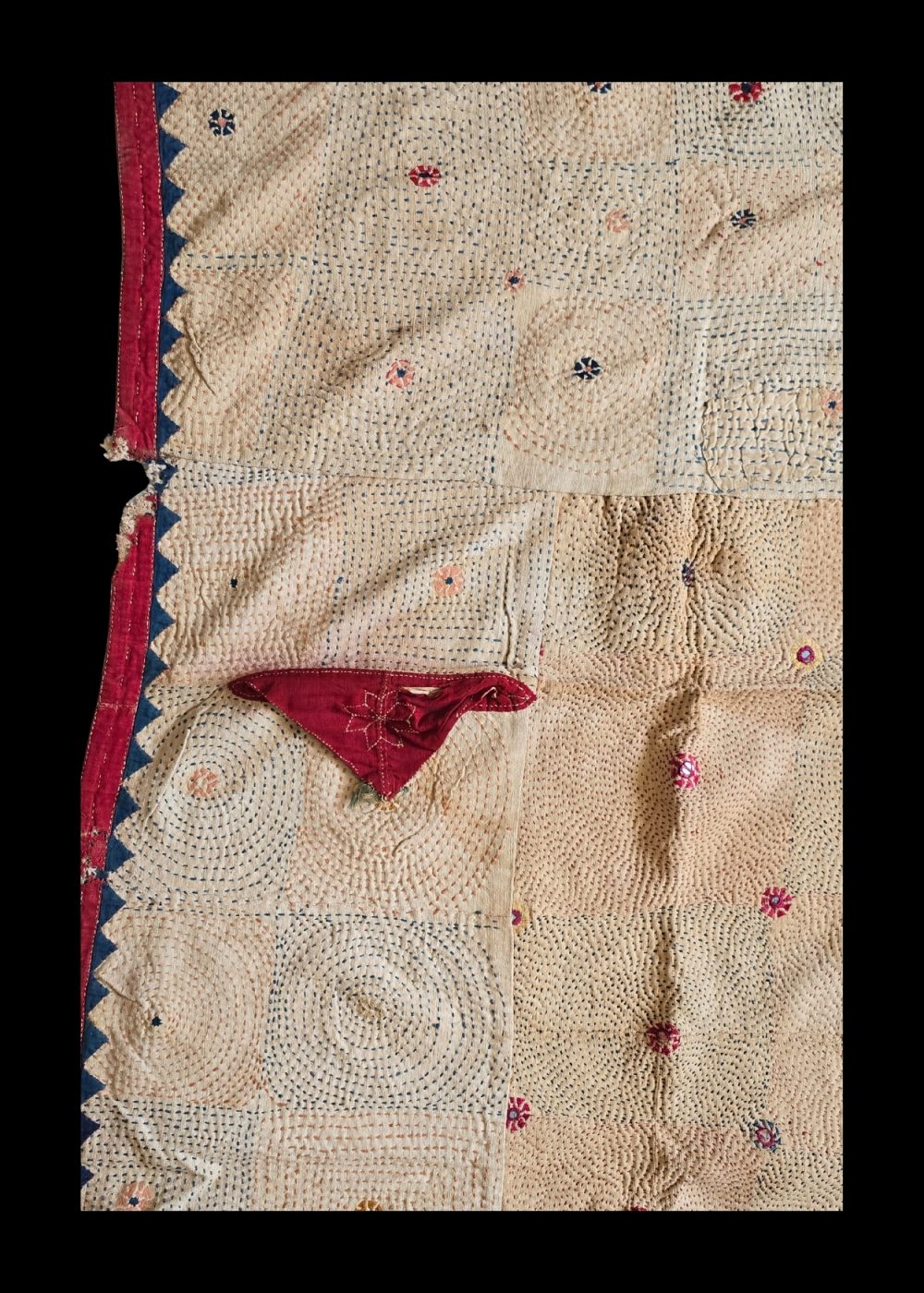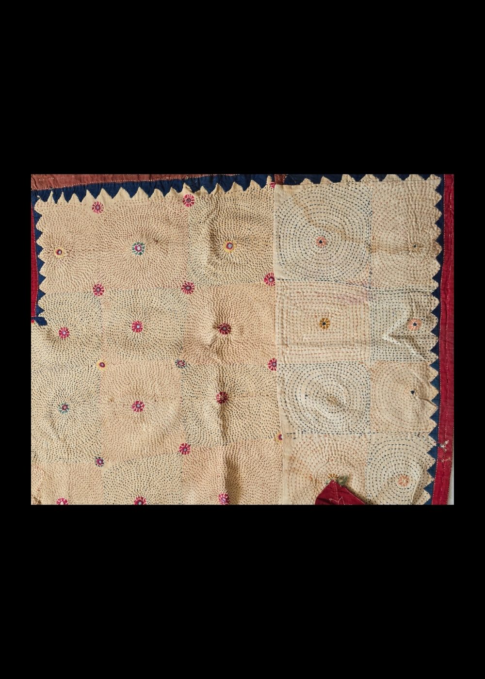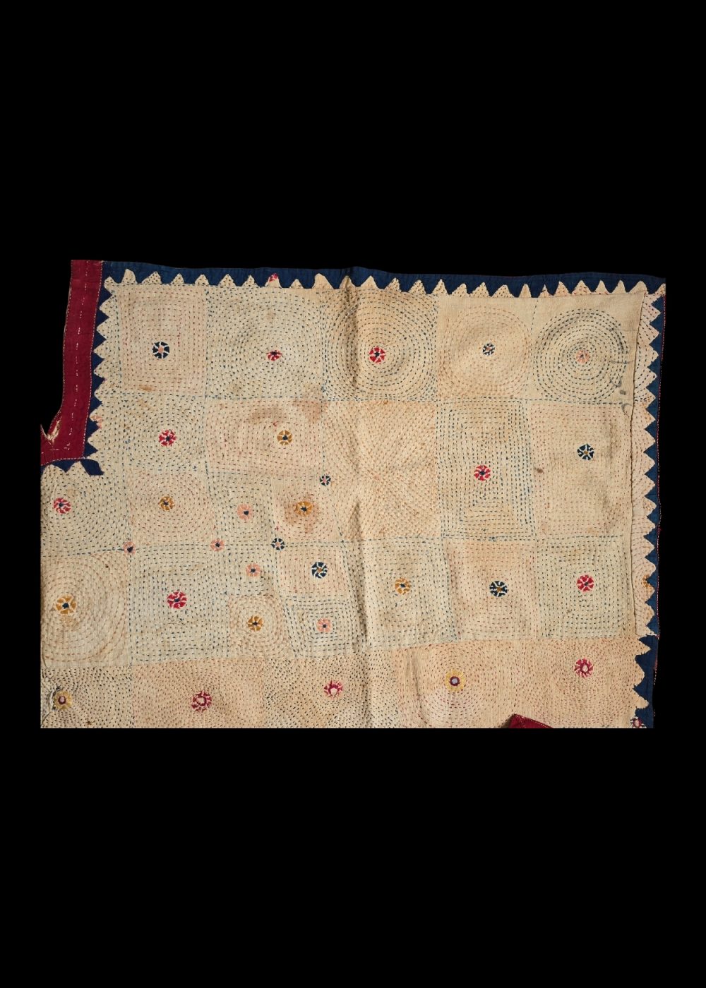 This finely hand-embroidered bullock cart cover from Gujarat exemplifies traditional rural craftsmanship. Worked on a soft beige cotton base, it features intricate running stitches and delicate floral motifs rendered in vibrant threads of red, blue, and yellow. The borders are accentuated with geometric patterns in contrasting shades, adding rhythm and balance to the design. Used as a decorative and protective covering for bullock carts during festive occasions, this textile reflects the artistic flair and cultural heritage of Gujarat’s pastoral communities.