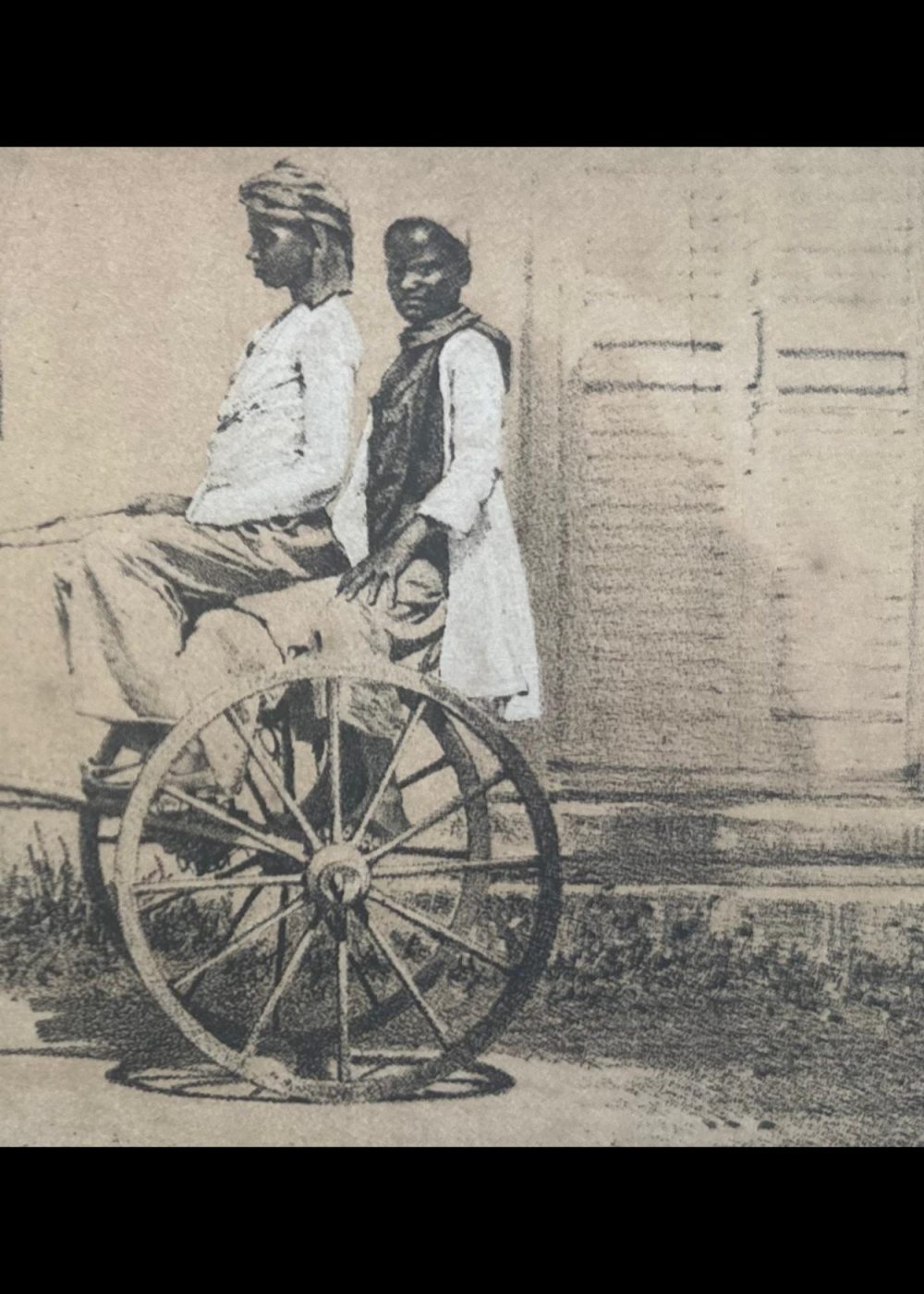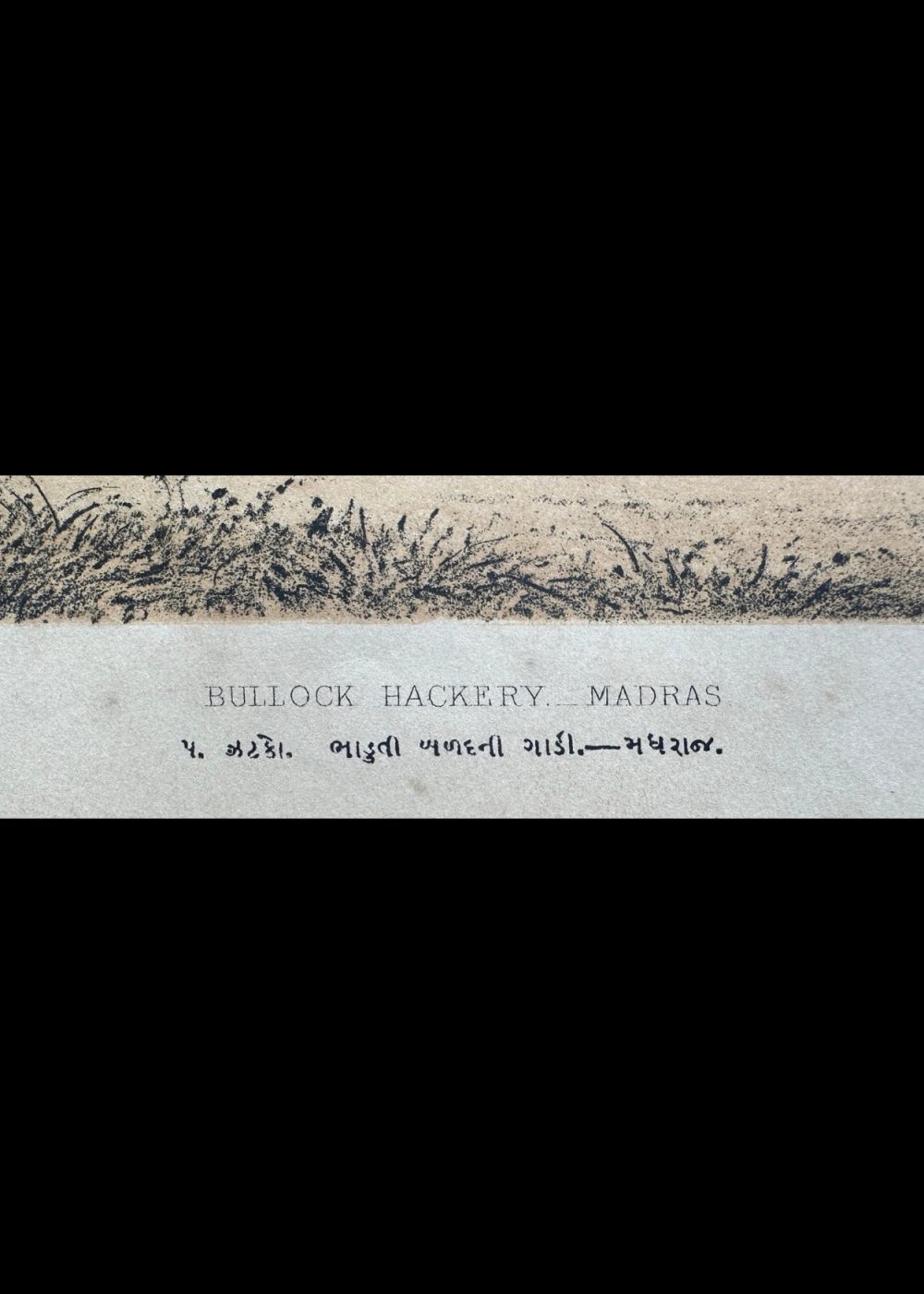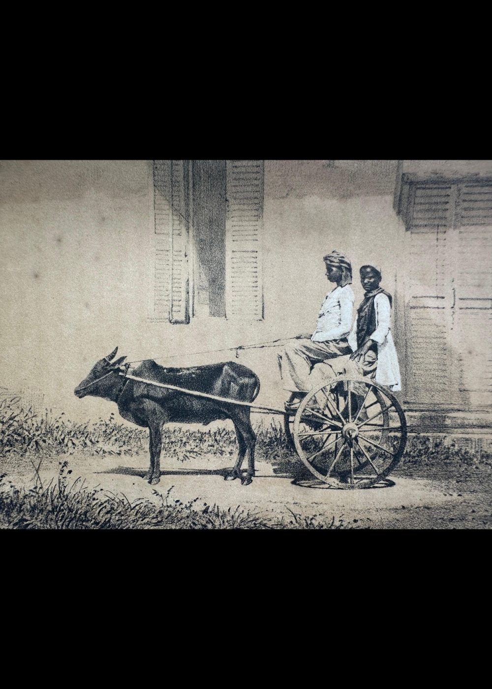 This cromo-lithograph, titled “Bullock Hackery, Madras,” is part of a travel book on India. It depicts a traditional mode of transportation in the region, where a bullock cart (hackery) is used to carry passengers. In the image, a bull is pulling a cart with two individuals, one sitting in the cart, while the other walks beside it. The setting appears to be in Madras (now Chennai), India, during the 19th century. The artwork beautifully captures a moment in time, showcasing both the rural transportation method and the attire of the people during that era. The piece is printed with rich detail and is an excellent example of historical travel documentation through art.