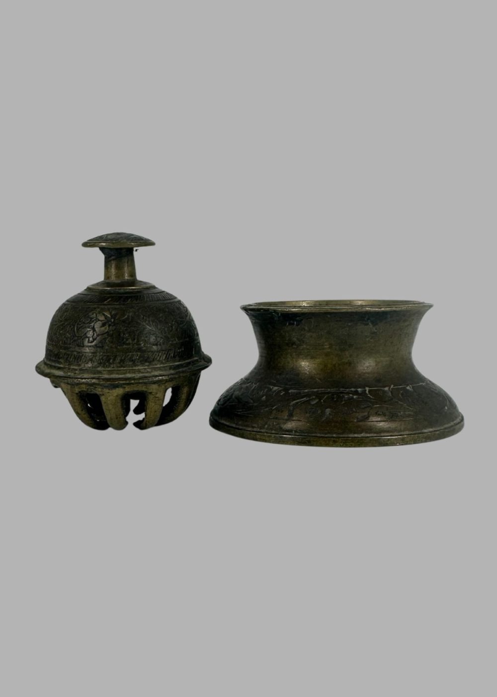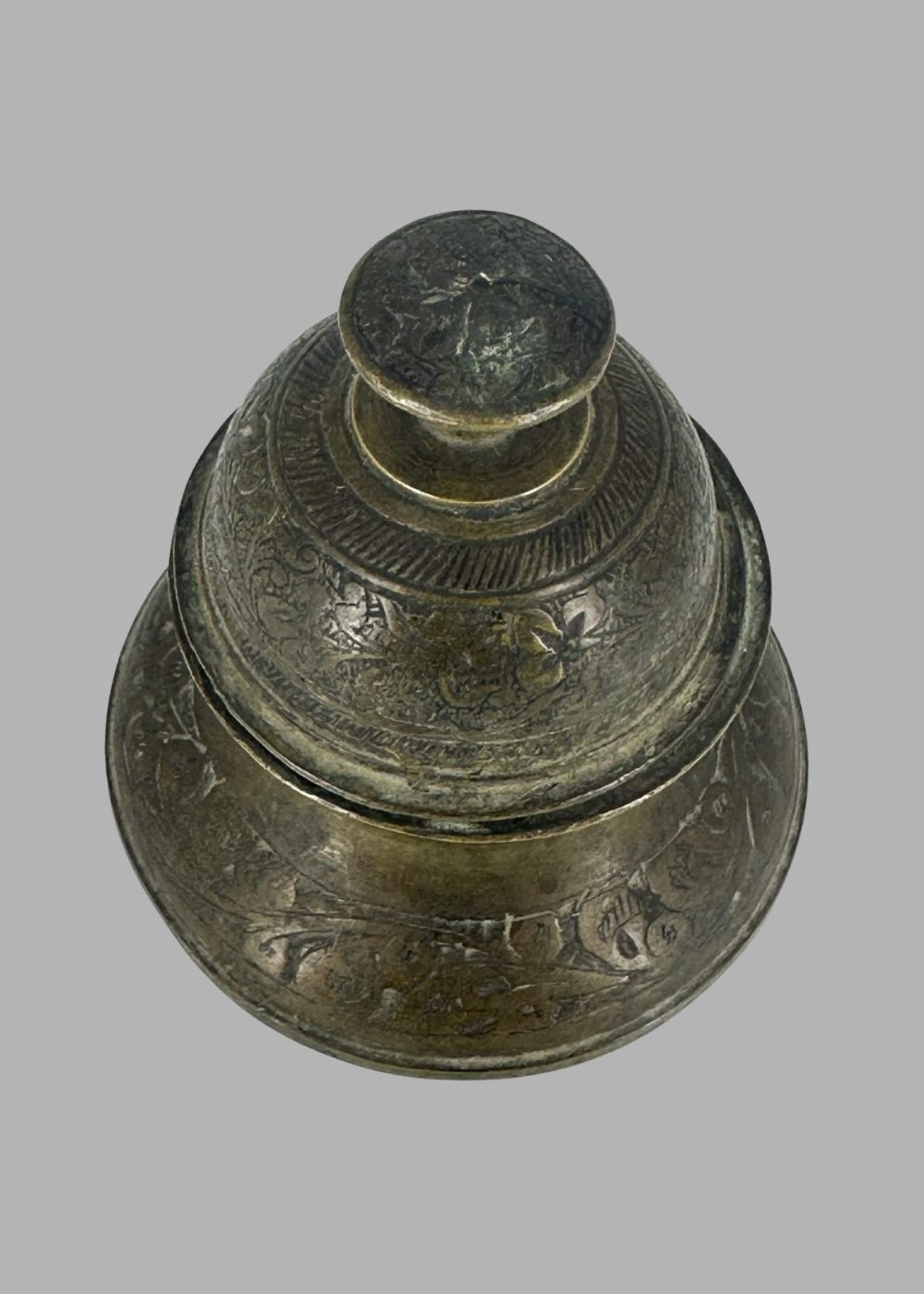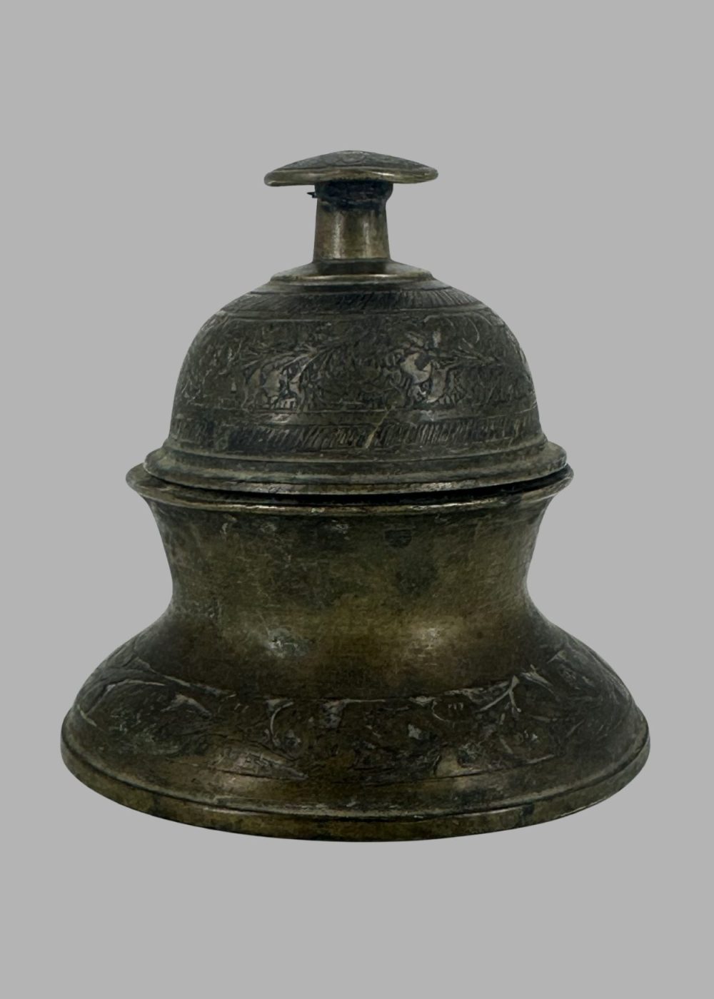 This dome-shaped brass calling bell features a solid handle and pierced slits encircling its lower half, allowing sound to resonate when rung. It rests on a wide circular base with concentric engraved bands, suggesting both aesthetic refinement and structural stability. The handle rises from a central finial, while the bell’s body is subtly faceted, evoking traditional forms found in domestic and ritual settings across North India. The aged patina enhances its tactile charm, underscoring its function as a signaling device in ceremonial or household contexts.