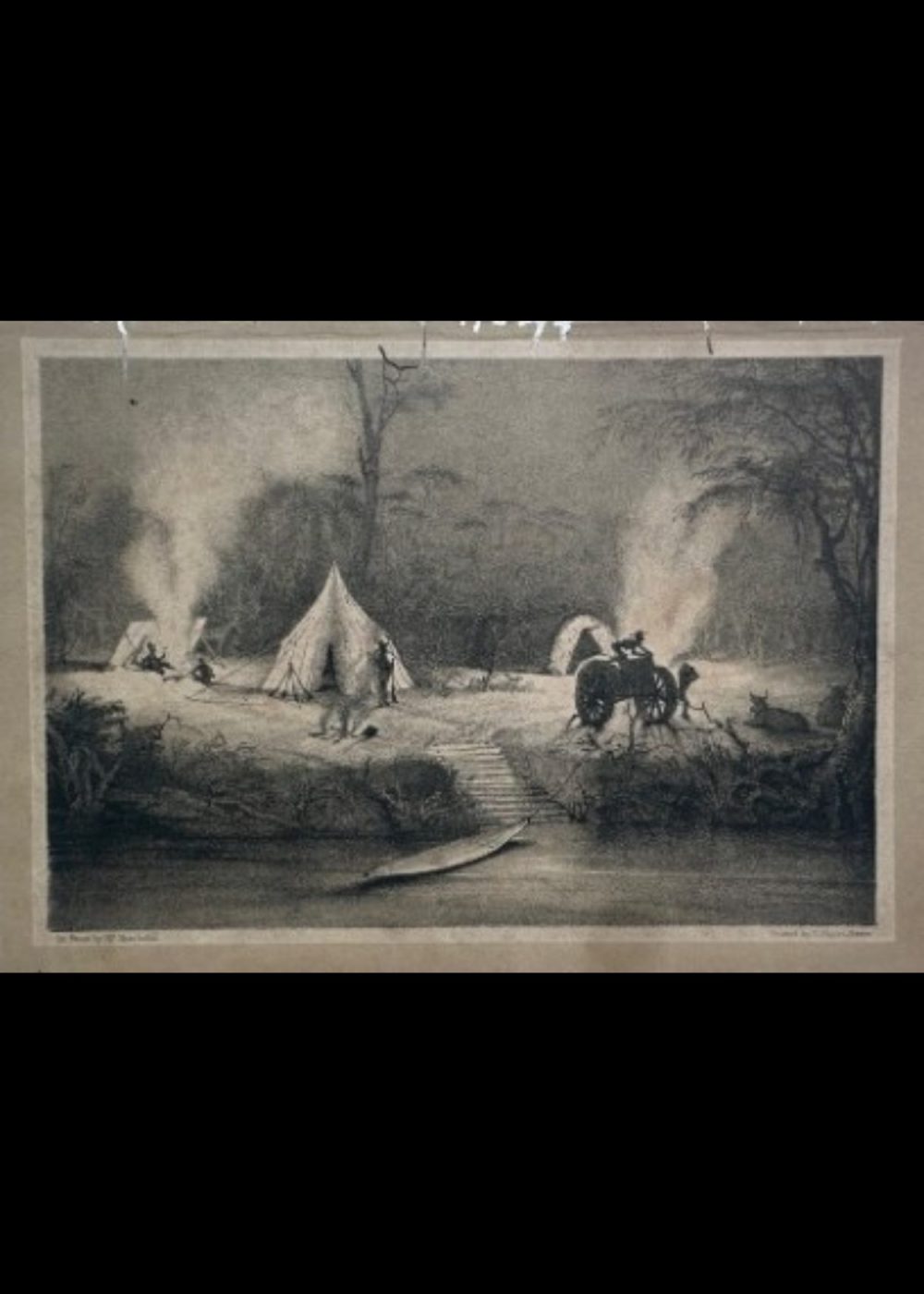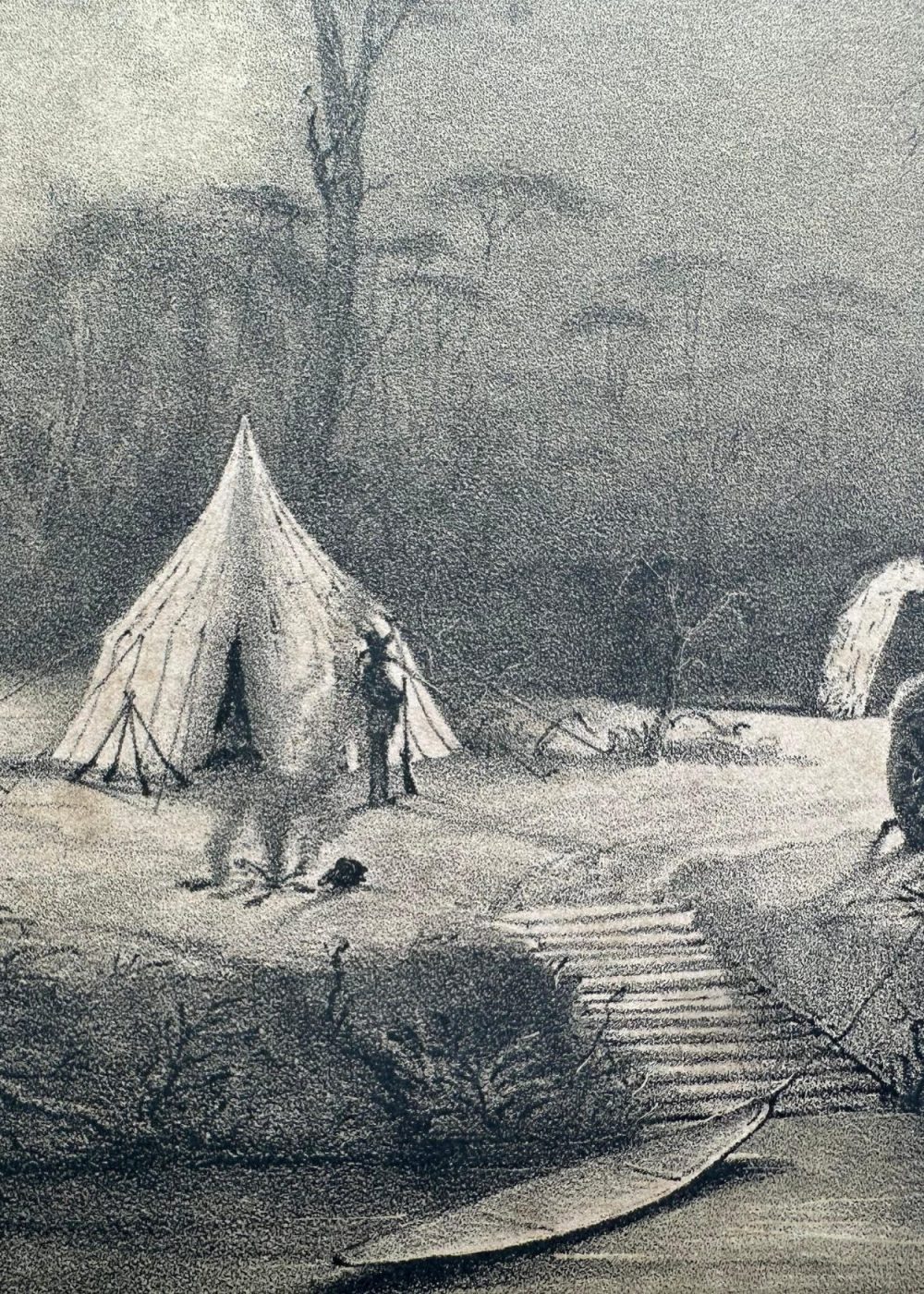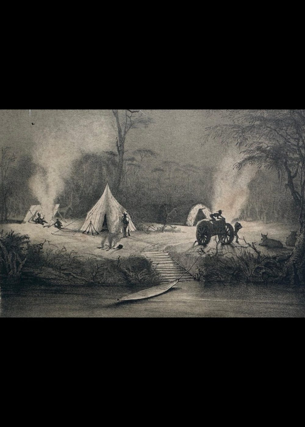 This engraving presents a nighttime camp scene by a riverbank, likely from a 19th-century expedition. Three tents glow with firelight, and figures are seen engaging in various tasks—tending fires, conversing, and watching over animals. In the foreground, a wooden path leads to a canoe resting on the water, while an elephant with a rider stands nearby. The image captures a moment of colonial exploration and settlement in a tropical landscape, blending human activity with the surrounding wilderness.