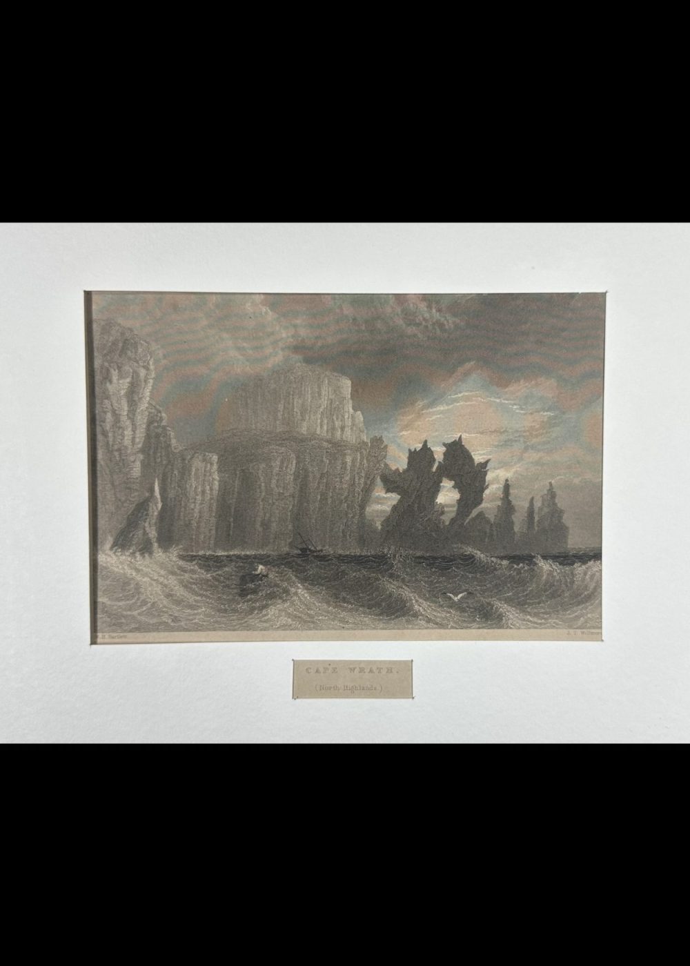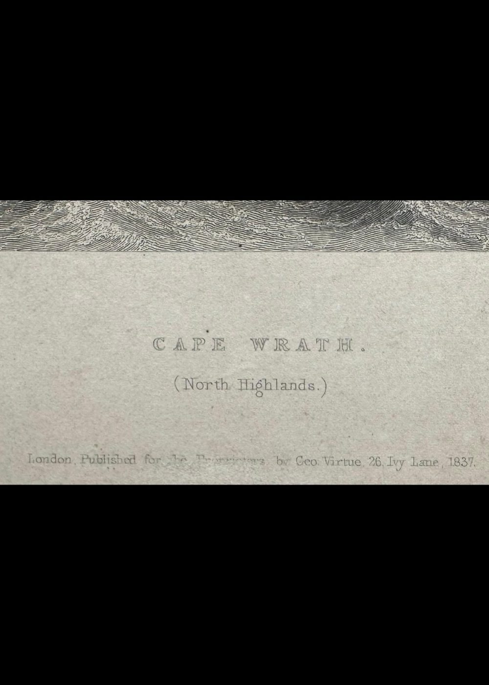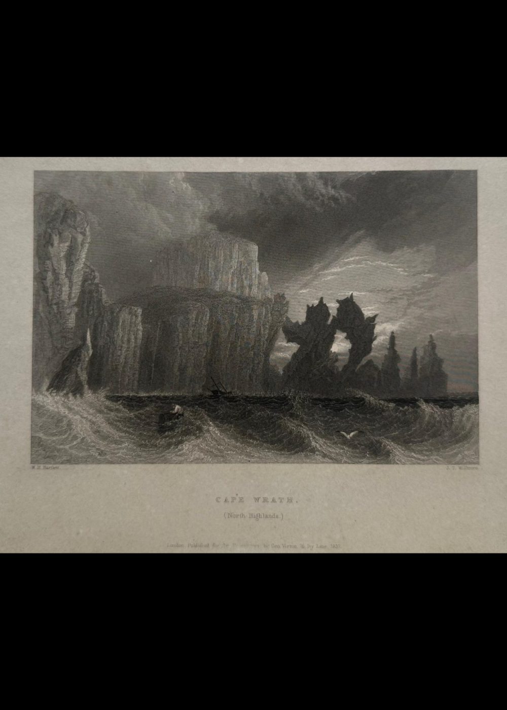 London, Published for the Proprietors, by Geo: Virtue, 26 Ivy Lane, 1837. This powerful seascape engraving depicts Cape Wrath, the remote and rugged headland in the far northwest of Scotland. Towering sea cliffs dominate the scene, their sheer faces rising above a dark, turbulent ocean. To the right, striking sea stacks loom like natural sentinels under a brooding sky. A shipwreck and a struggling figure in the waves evoke the peril faced by seafarers along this wild coast. The composition conveys both the dramatic grandeur and harsh isolation of one of Scotland’s most formidable natural landmarks.