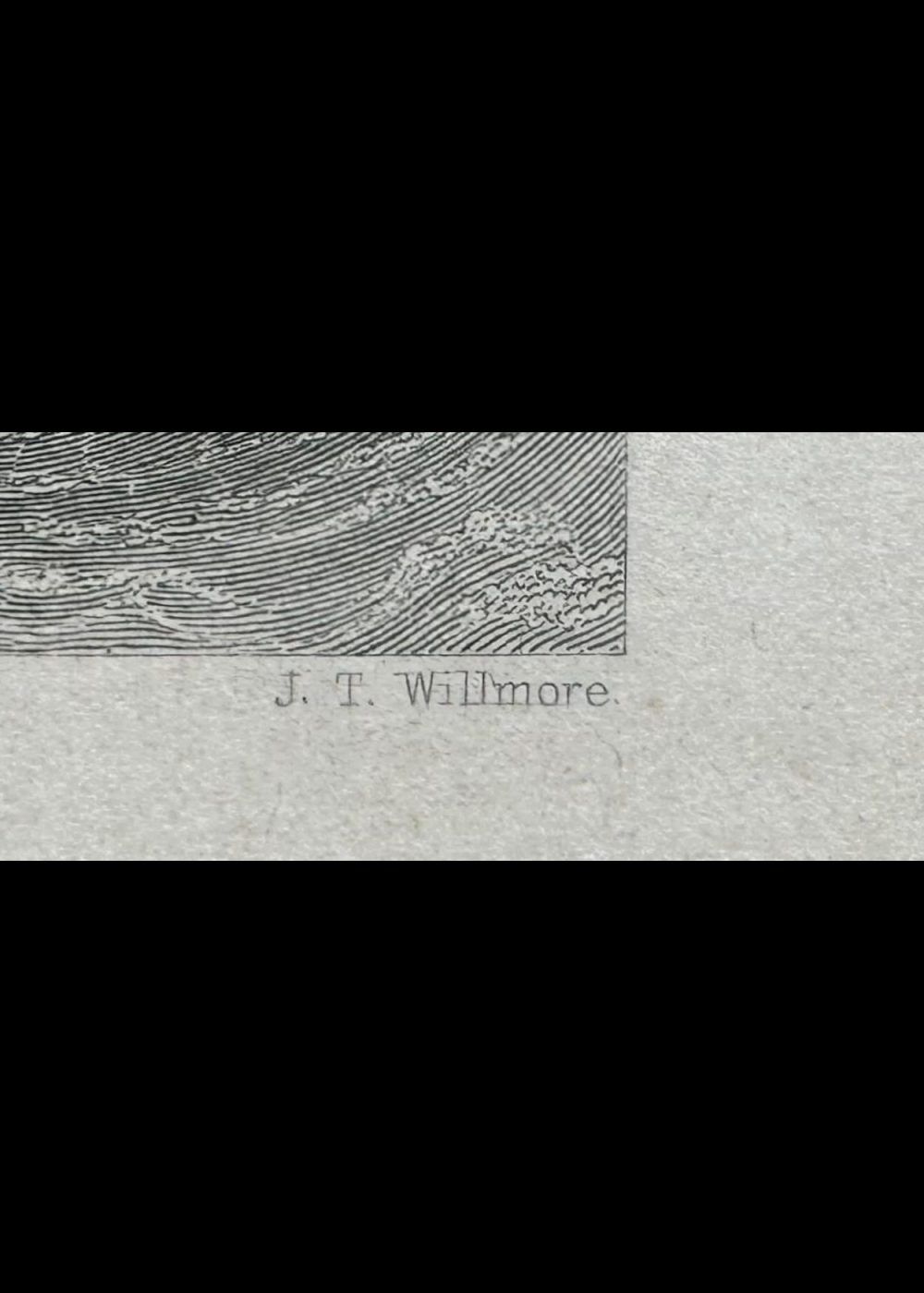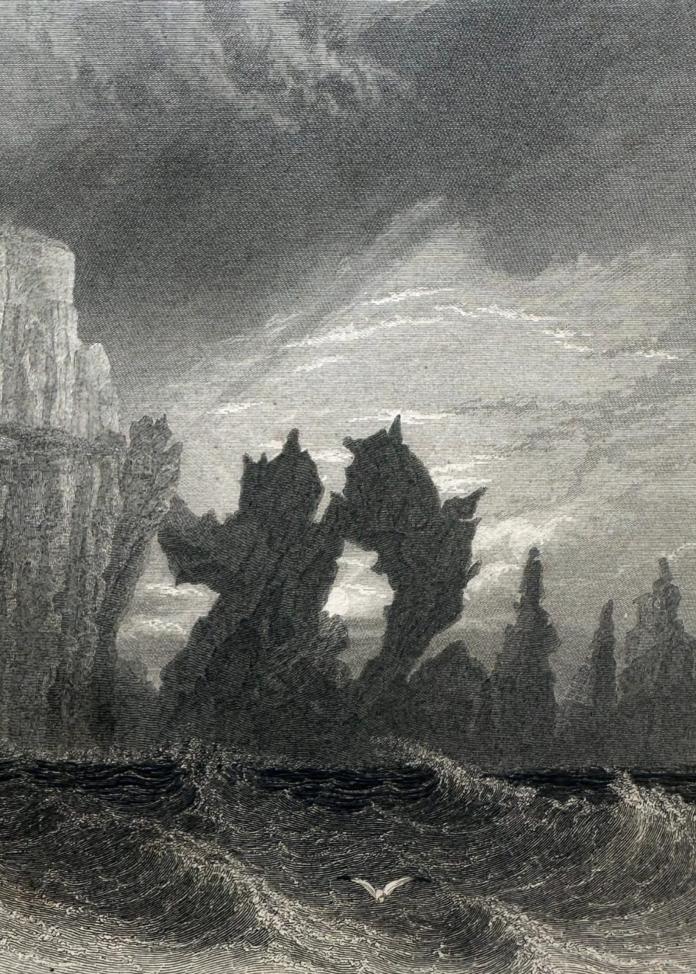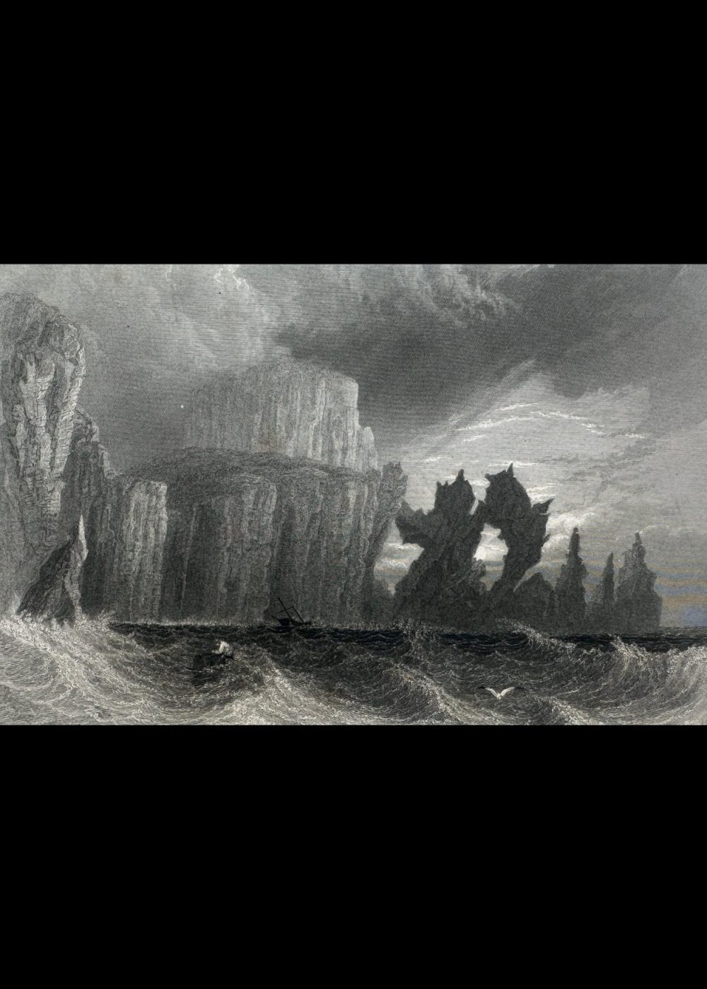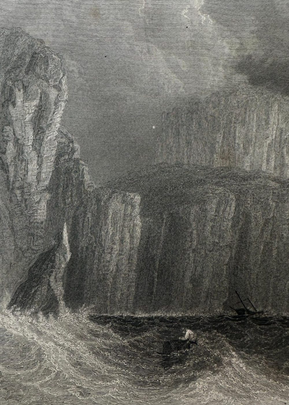 London, Published for the Proprietors, by Geo: Virtue, 26 Ivy Lane, 1837. This powerful seascape engraving depicts Cape Wrath, the remote and rugged headland in the far northwest of Scotland. Towering sea cliffs dominate the scene, their sheer faces rising above a dark, turbulent ocean. To the right, striking sea stacks loom like natural sentinels under a brooding sky. A shipwreck and a struggling figure in the waves evoke the peril faced by seafarers along this wild coast. The composition conveys both the dramatic grandeur and harsh isolation of one of Scotland’s most formidable natural landmarks.