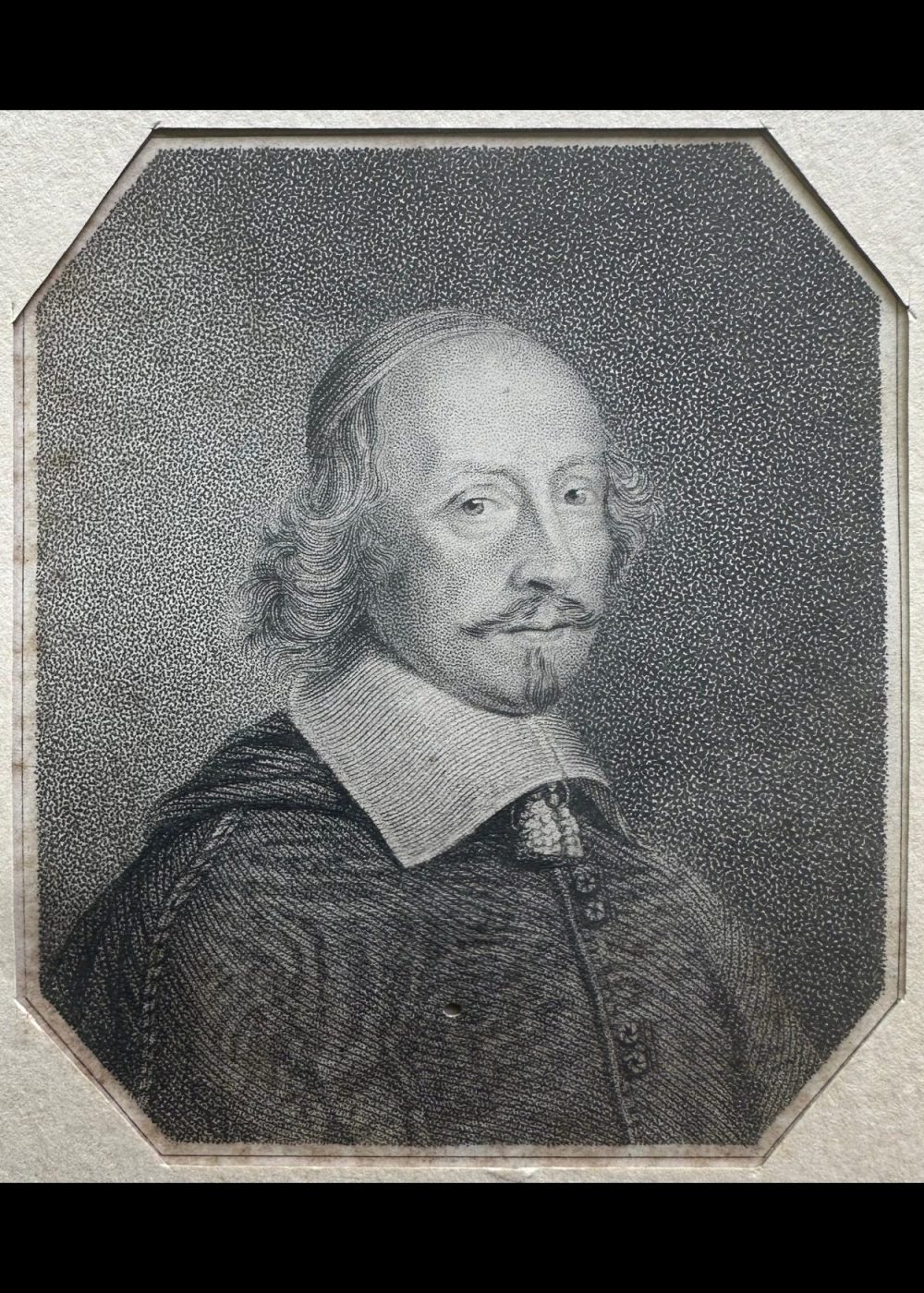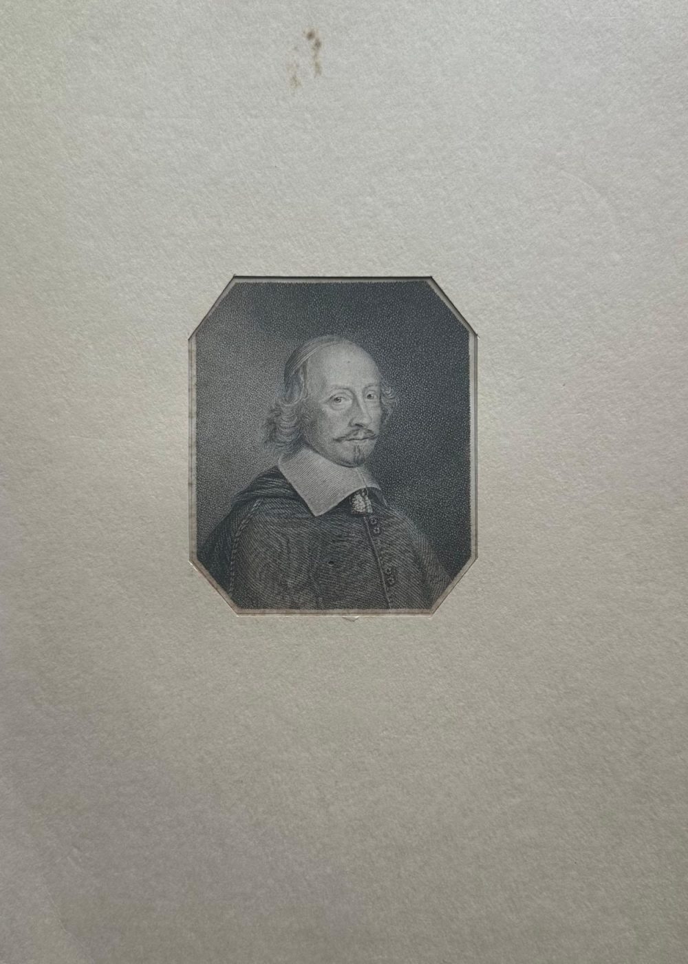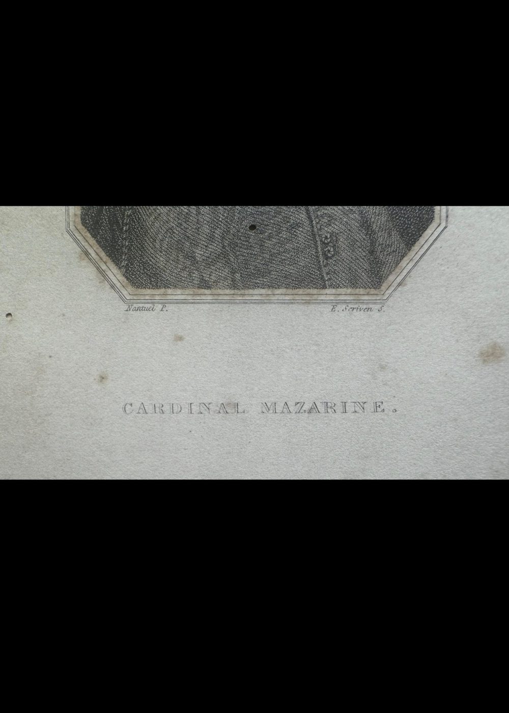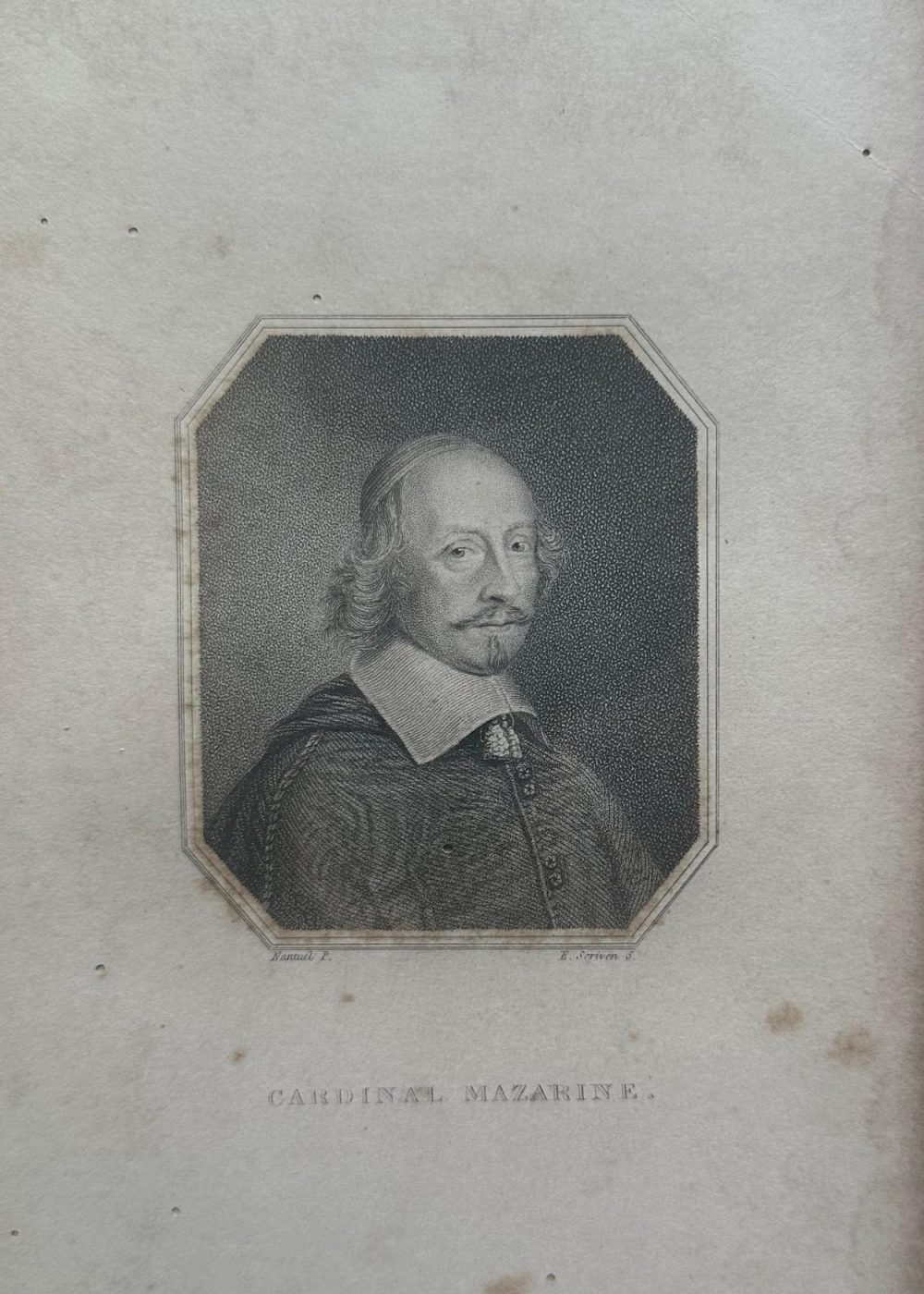 Giulio Raimondo Mazzarino (14 July 1602 – 9TH March 1661), From 1641 known as Cardinal Mazarin, was an Italian Catholic Prelate, diplomat and Politician who served as the chief minister of the King of France Lowis XIII and Louis XIV From 1642 to his death, Published 1810. This portrait engraving features Cardinal Jules Mazarin, chief minister of France under Louis XIV and a key architect of European diplomacy during the mid-17th century. Depicted with a composed gaze and clad in ecclesiastical robes fastened by a prominent clasp, Mazarin’s likeness is framed by a soft stippled background that enhances the sitter’s presence. The engraving balances ornamental precision with subdued tonal contrast, reflecting the stylistic restraint of early 19th-century printmaking. Inscribed below with “CARDINAL MAZARINE,” and bearing attribution to “Nantuel P.” and “E. Morin S.,” the print exemplifies the reverential treatment of state figures in post-revolutionary France.