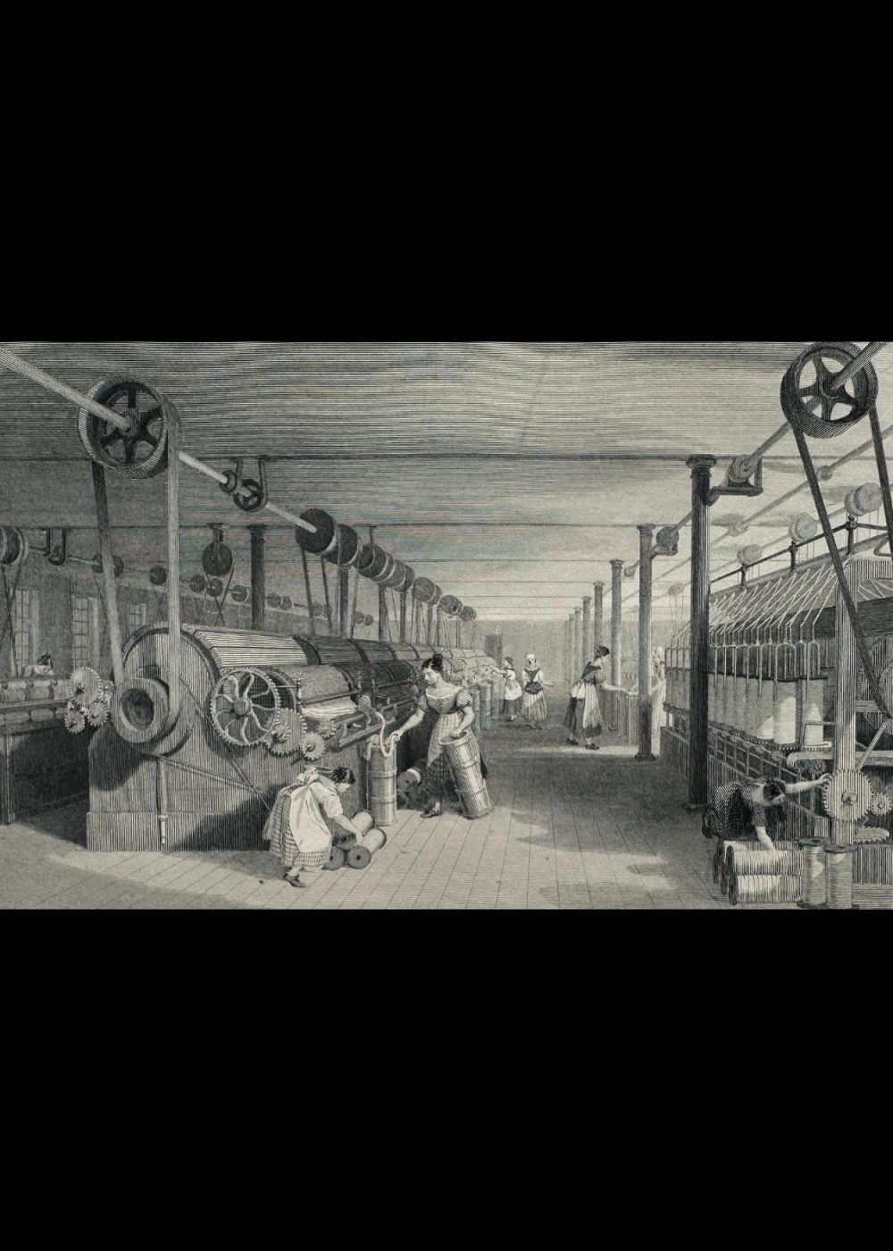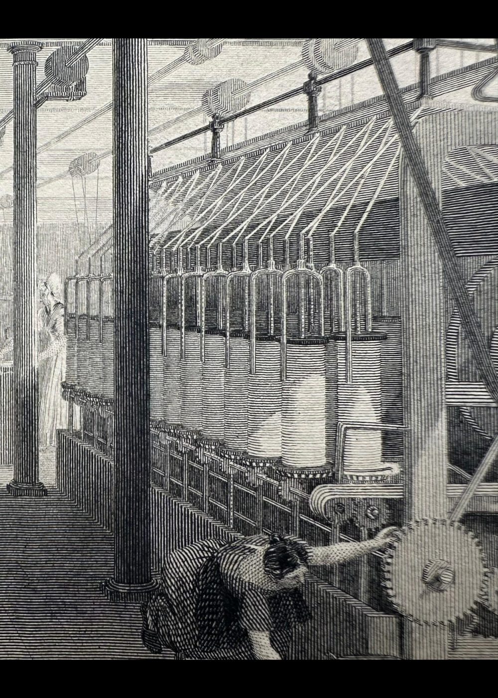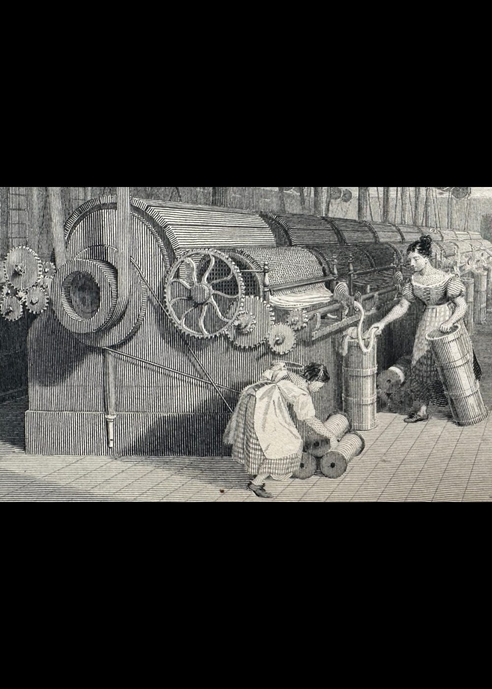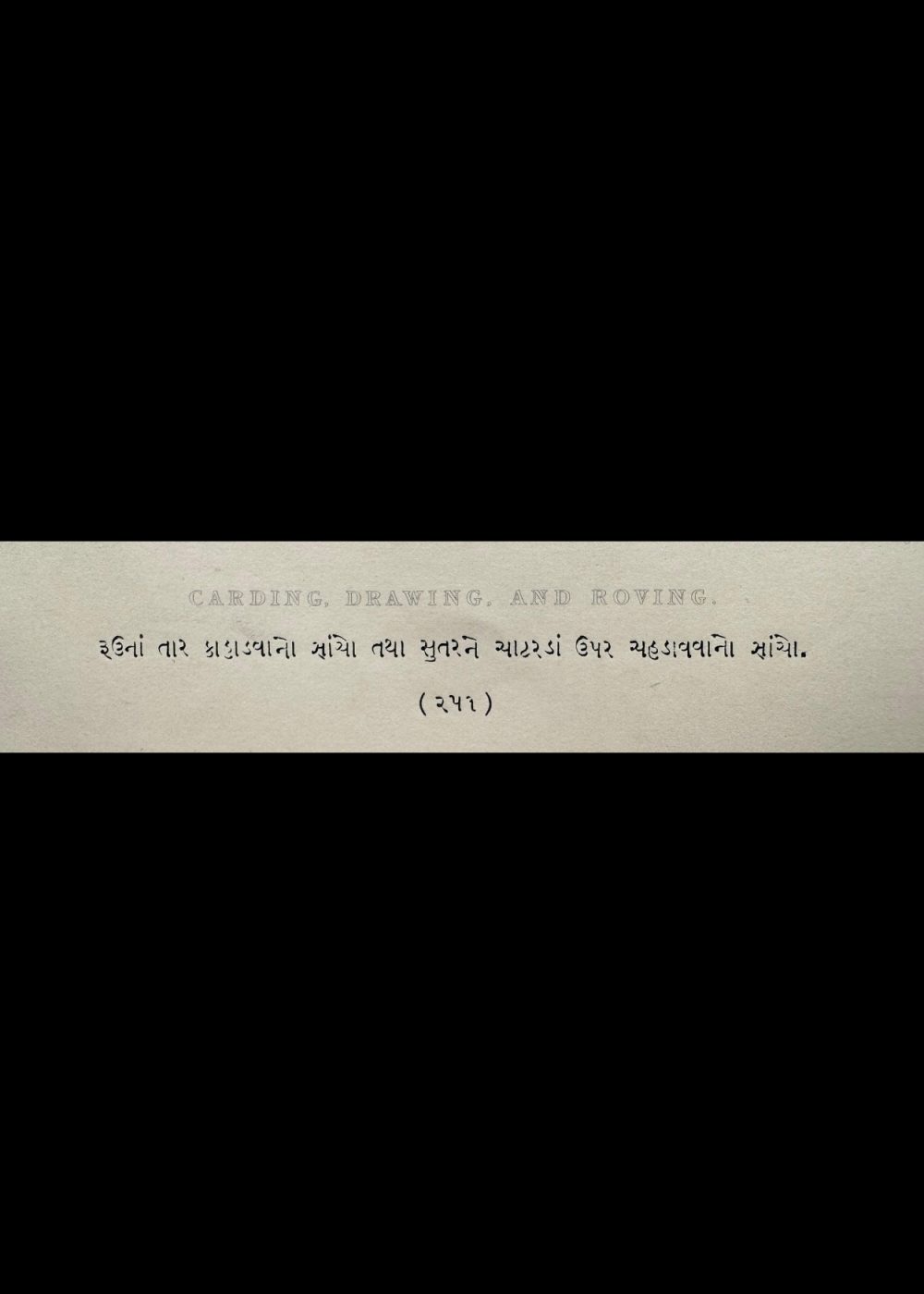 This engraving depicts the process of “Carding, Drawing, and Roving” in a textile factory, showcasing industrial machinery and workers engaged in the preparation of fibers. The scene illustrates the mechanical systems used during the textile manufacturing process in the 19th century, with large spinning machines, gears, and pulleys. The workers, predominantly women, are positioned around the machines, attending to their tasks. The engraving is part of the Crystal Palace book, highlighting the advancements in manufacturing technology during the Industrial Revolution. The caption at the bottom is written in Gujarati, providing a description of the scene and processes.