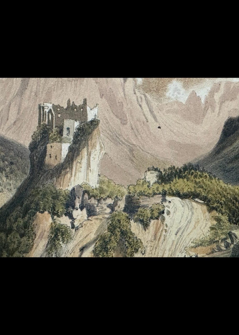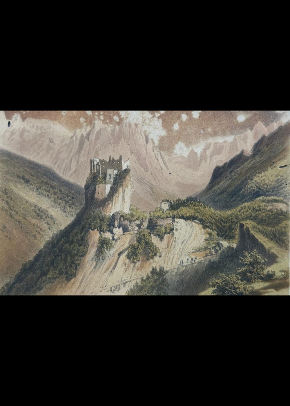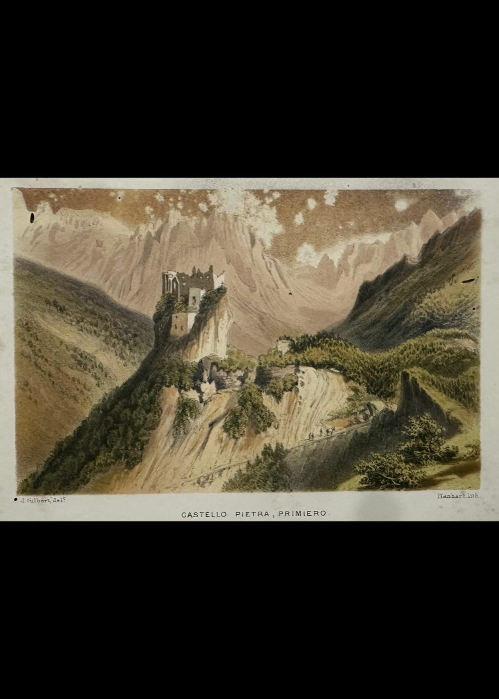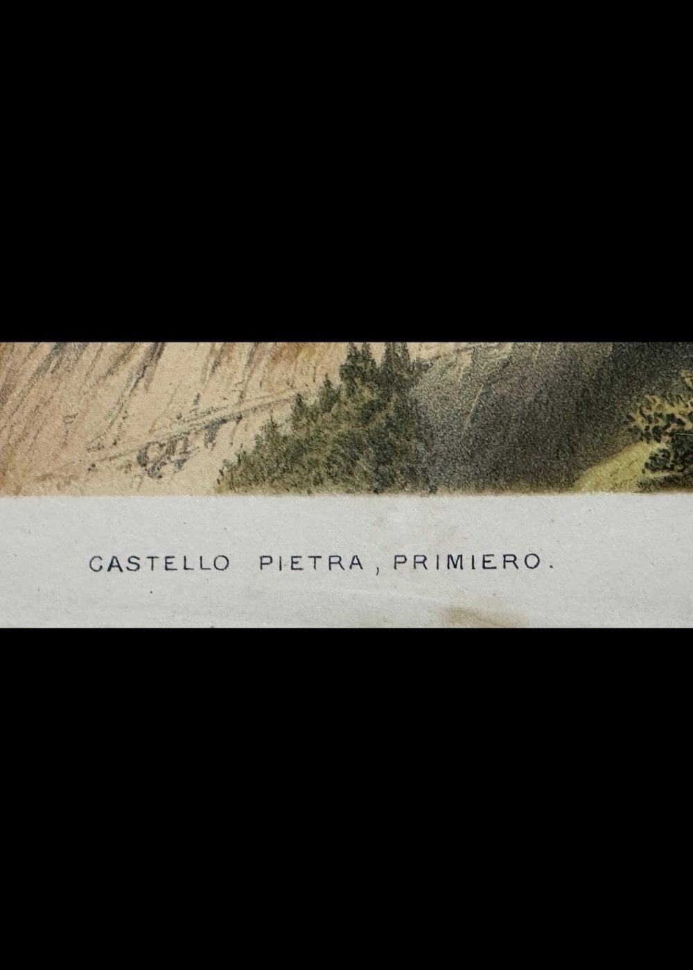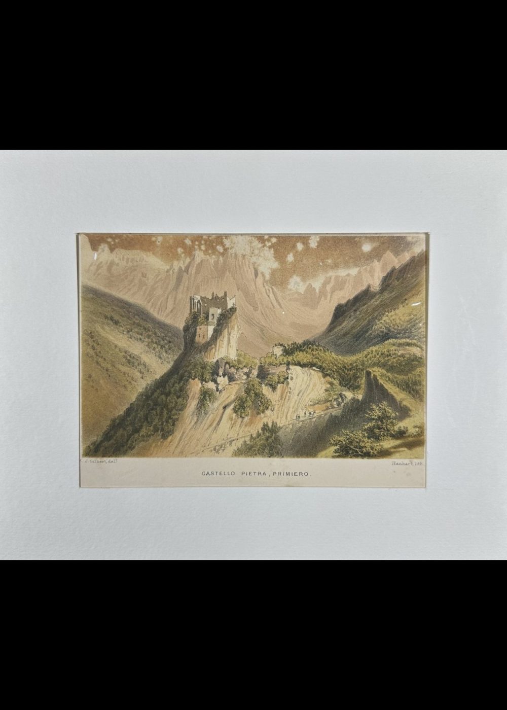 This elegant 19th-century chromolithograph captures the dramatic silhouette of Castello Pietra, perched high above the Primiero Valley in the Italian Dolomites. The castle, seated on a rocky outcrop, commands the landscape with its medieval architecture, surrounded by clustered dwellings and lush alpine slopes. Behind, towering mountain peaks rise into a misty sky, enhancing the romantic and historical atmosphere. The warm earthy tones and intricate detail reflect the charm and majesty of the region, making this a classic example of topographical art from the era.