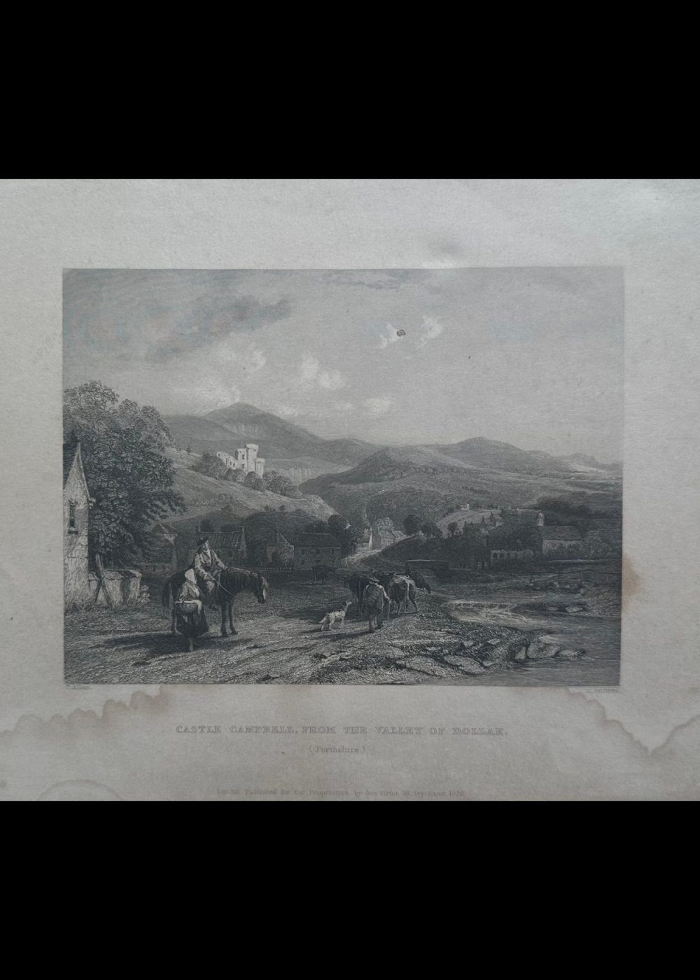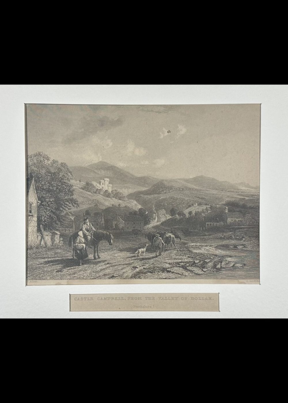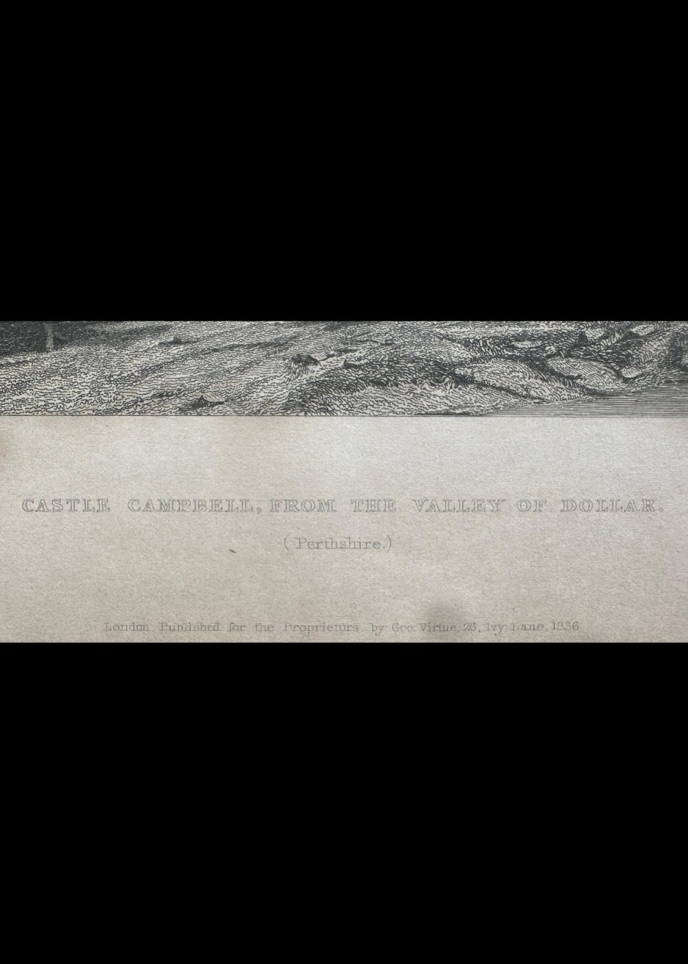 This finely detailed steel engraving depicts Castle Campbell, dramatically perched amidst the Ochil Hills, as seen from the picturesque valley of Dollar in Perthshire, Scotland. The 15th-century fortress, once the stronghold of the powerful Campbell family, dominates the middle ground, its imposing silhouette contrasted against rolling hills and a soft, clouded sky. In the foreground, a tranquil rural scene unfolds: a traveler on horseback, accompanied by a packhorse and dog, journeys along a muddy path toward a cluster of village cottages. The composition harmoniously balances architectural and pastoral elements, offering a romanticized view of Scottish history and landscape, typical of the 19th-century picturesque aesthetic. This engraving was part of a series of topographical views published by George Virtue, showcasing the scenic beauty of Great Britain.