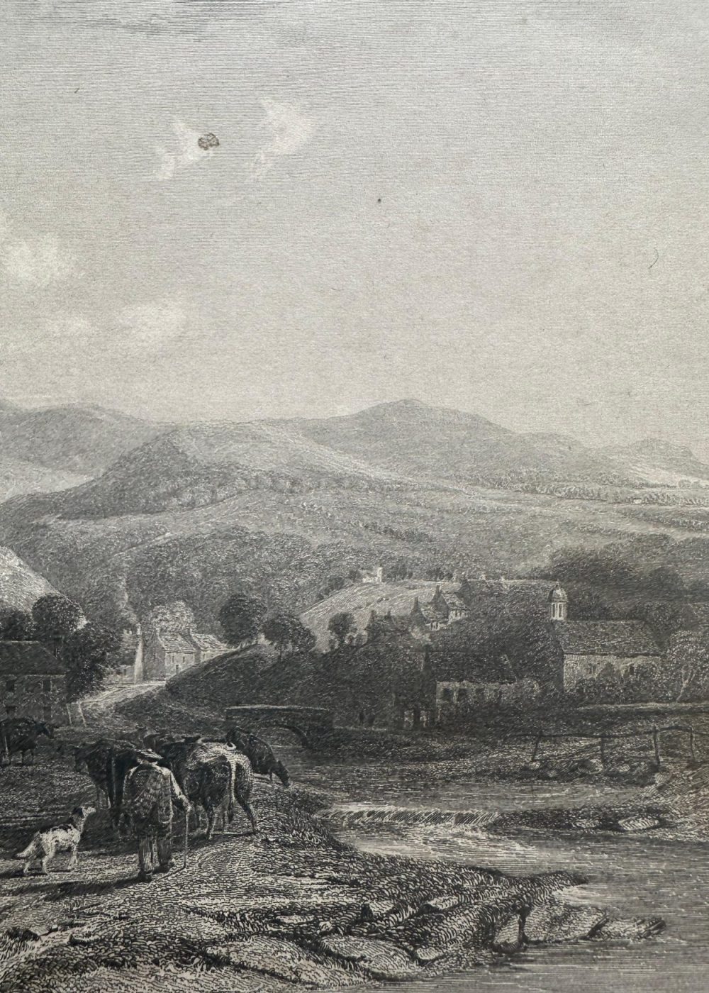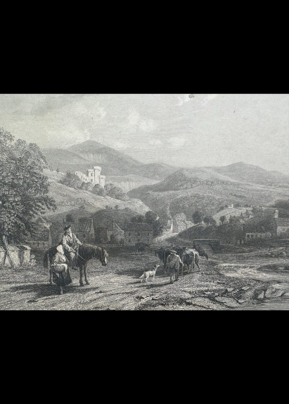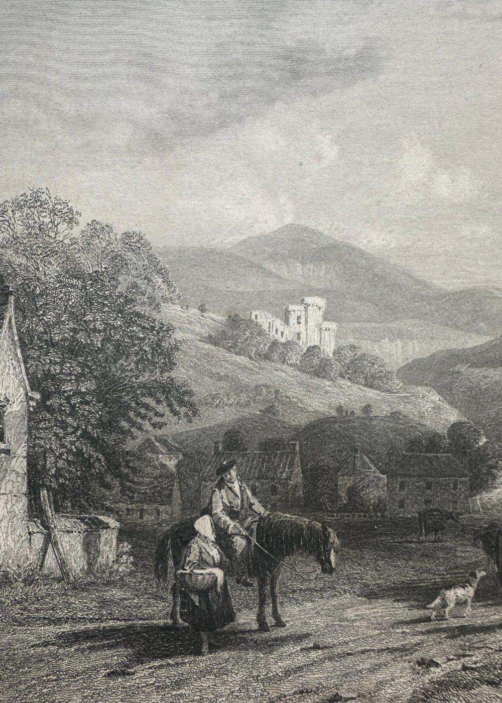 This finely detailed steel engraving depicts Castle Campbell, dramatically perched amidst the Ochil Hills, as seen from the picturesque valley of Dollar in Perthshire, Scotland. The 15th-century fortress, once the stronghold of the powerful Campbell family, dominates the middle ground, its imposing silhouette contrasted against rolling hills and a soft, clouded sky. In the foreground, a tranquil rural scene unfolds: a traveler on horseback, accompanied by a packhorse and dog, journeys along a muddy path toward a cluster of village cottages. The composition harmoniously balances architectural and pastoral elements, offering a romanticized view of Scottish history and landscape, typical of the 19th-century picturesque aesthetic. This engraving was part of a series of topographical views published by George Virtue, showcasing the scenic beauty of Great Britain.