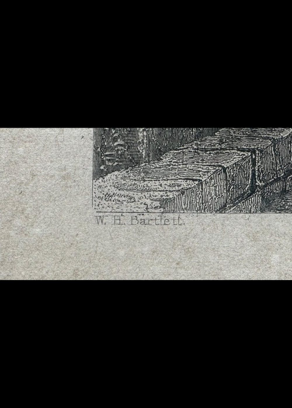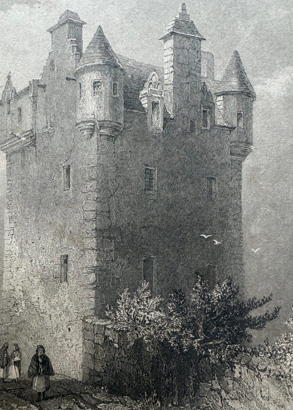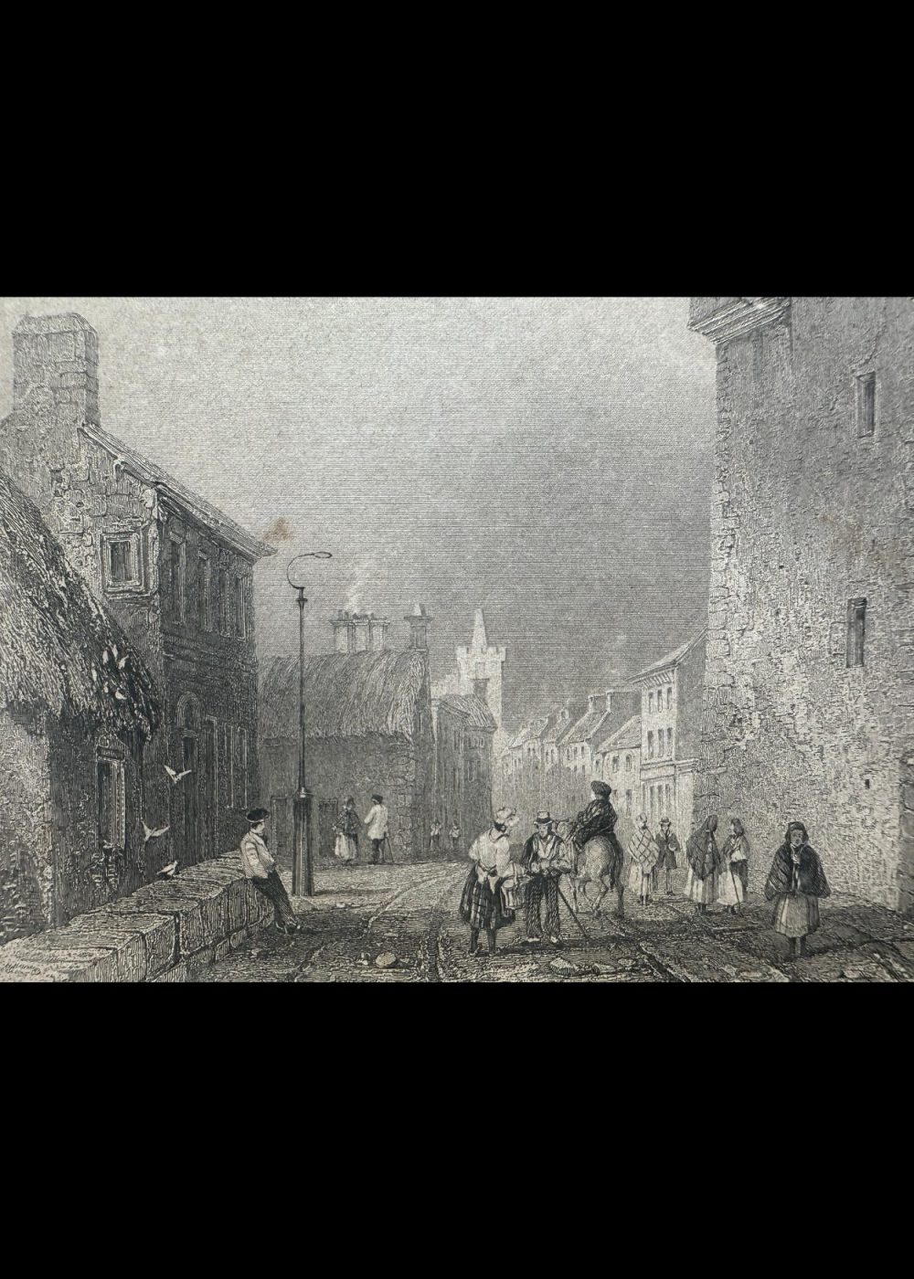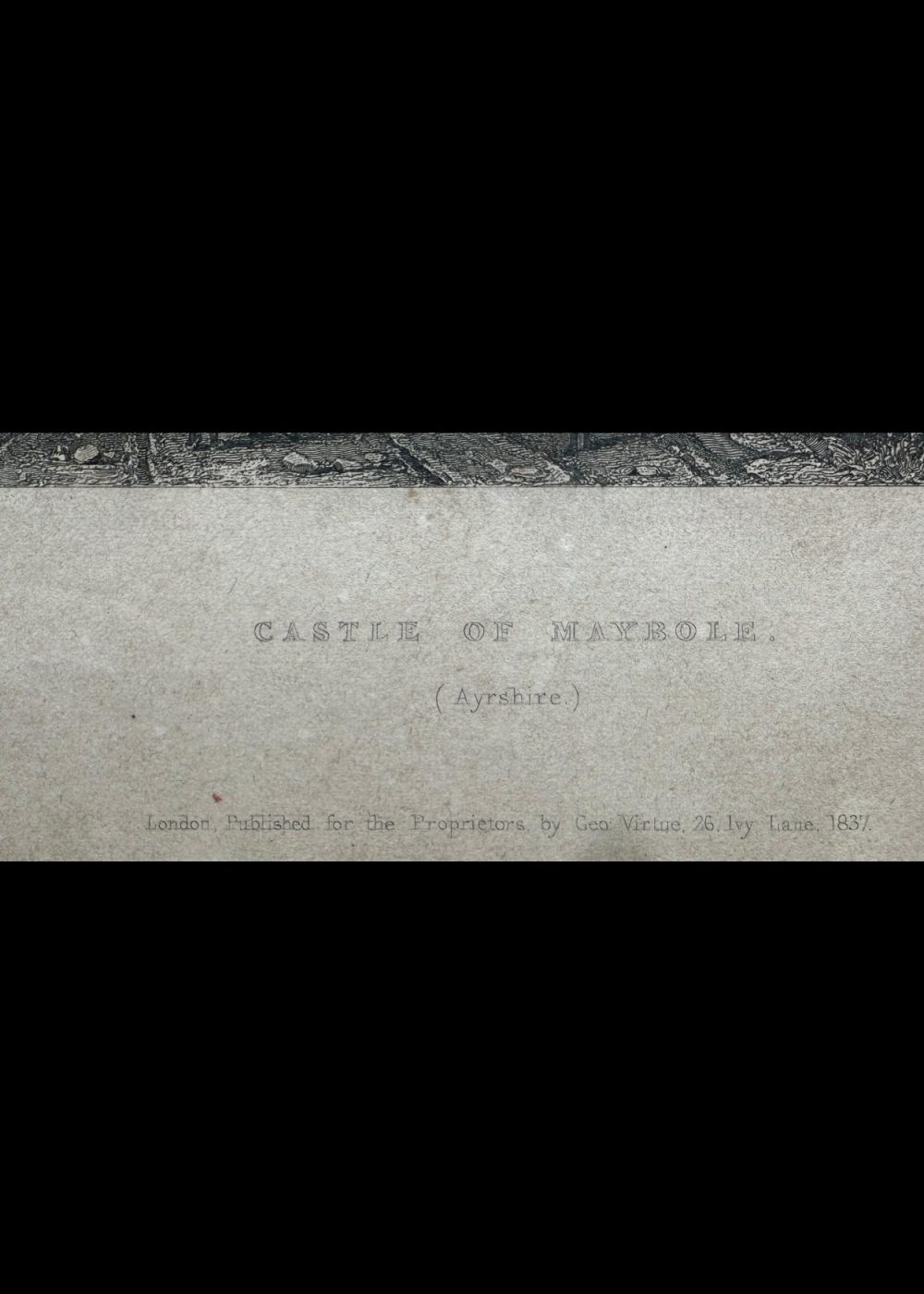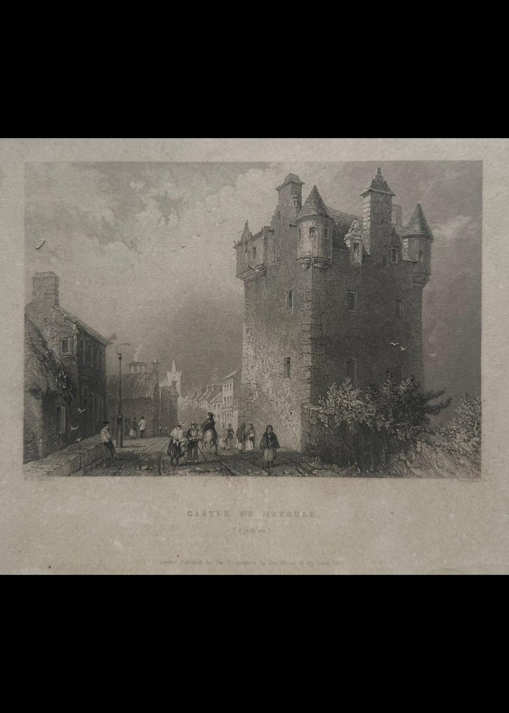 This richly detailed engraving titled “Castle of Maybole (Ayrshire)” was drawn by W. H. Bartlett and engraved by H. Adlard. It offers a striking view of the Castle of Maybole, a historic tower house located in the town of Maybole, Ayrshire, Scotland. Dominating the right side of the composition is the tall, turreted castle with its sturdy stone walls, narrow windows, and crow-stepped gables. Its strong vertical presence and fortified design speak to its medieval origins and noble past—once the seat of the Earls of Cassillis, a powerful Lowland family. The street in front of the castle is lively with everyday village activity. Townspeople stroll, converse, and ride horseback along a rustic, cobbled lane lined with thatched cottages and stone buildings. A man leans casually on a low wall, while children and women dressed in period attire bring a sense of warmth and realism to the scene. The mood of the engraving balances the grandeur of feudal architecture with the charm of small-town life. In the background, the spire of another church or civic building adds depth to the village skyline. Published in 1837 by Geo. Virtue, 26 Ivy Lane, London, this engraving captures both the historical significance and the enduring character of Ayrshire’s rural heritage.