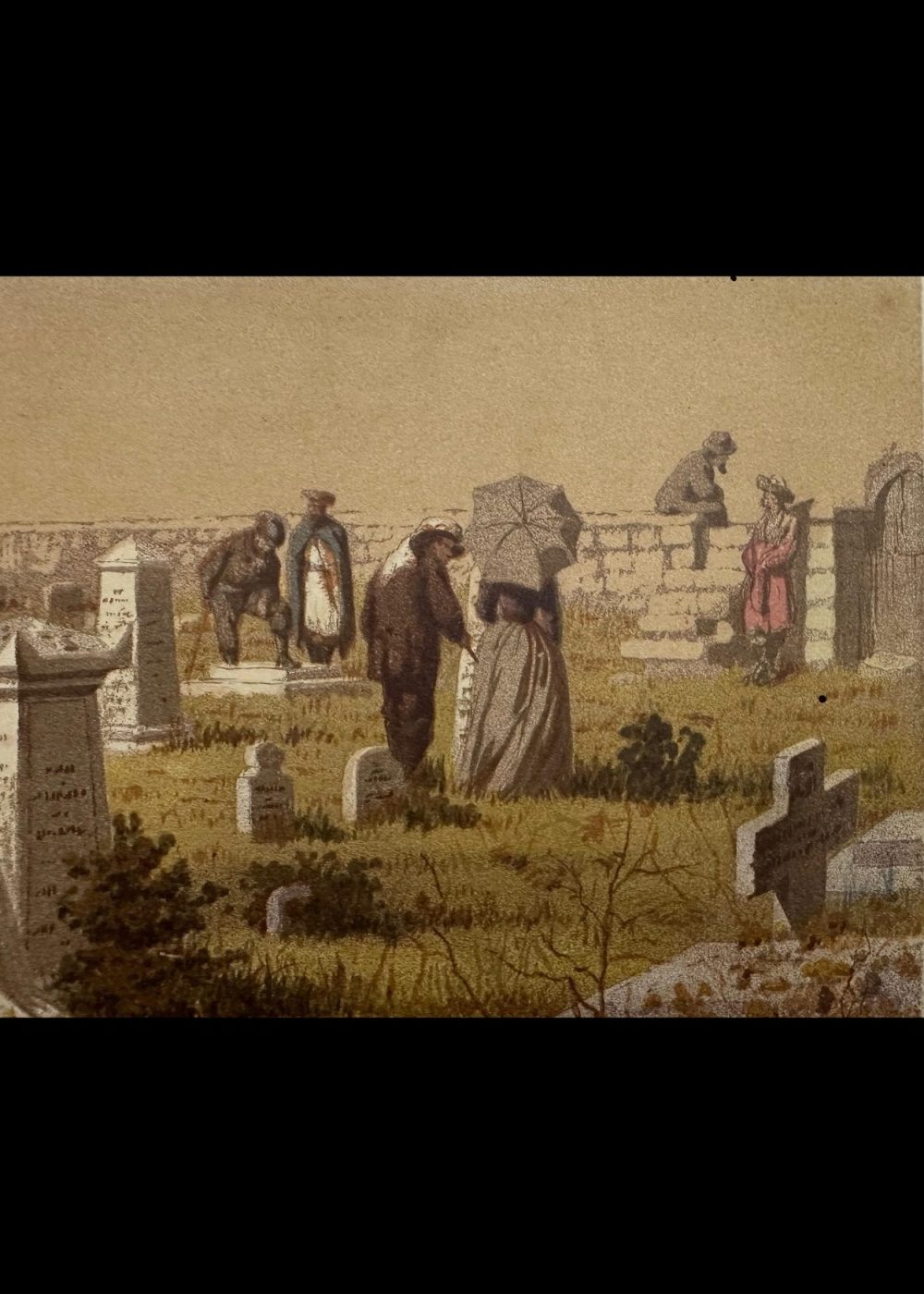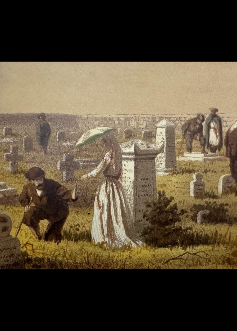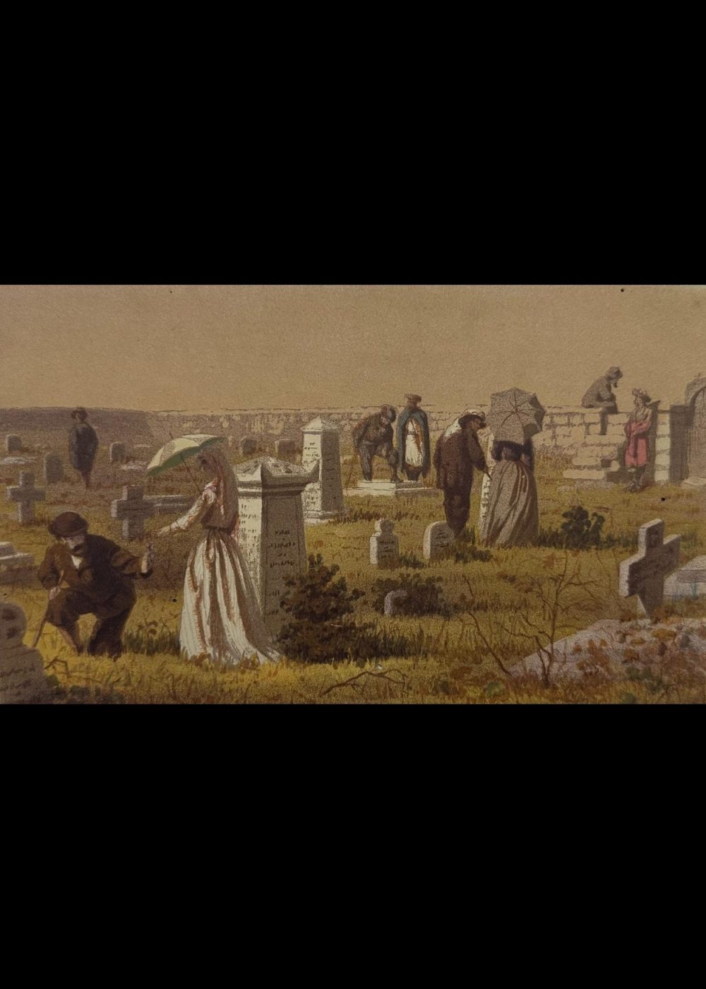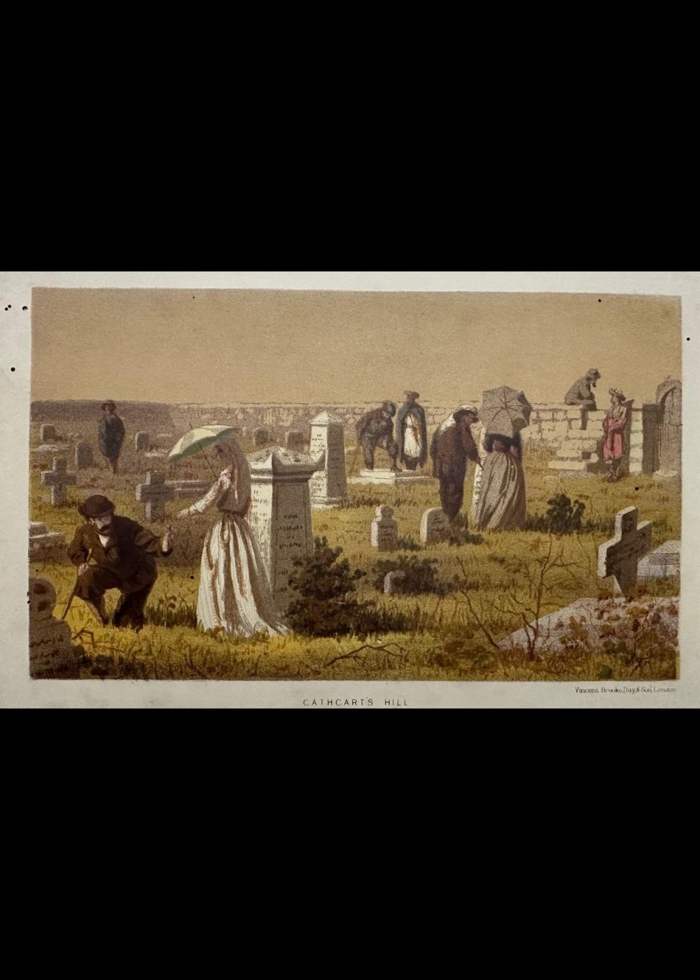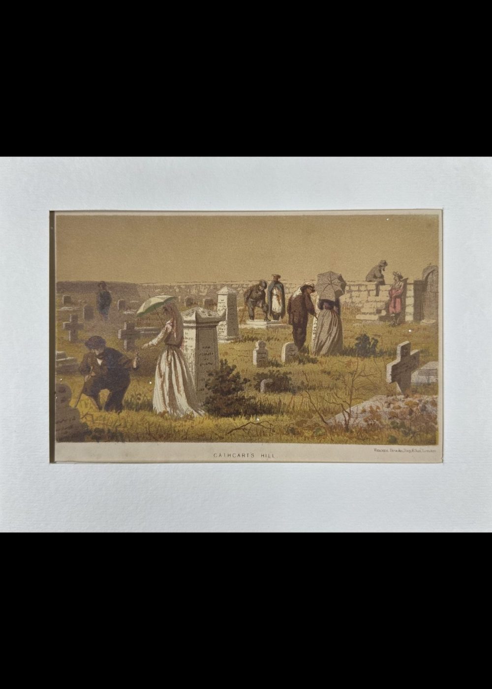 This poignant 19th-century lithograph titled “Cathcart’s Hill” depicts a military cemetery scene likely associated with the aftermath of the Crimean War. Cathcart’s Hill, near Sevastopol in Crimea, served both as a strategic British position during the war and later as a prominent burial ground for fallen soldiers.