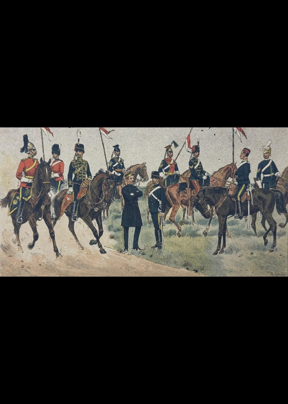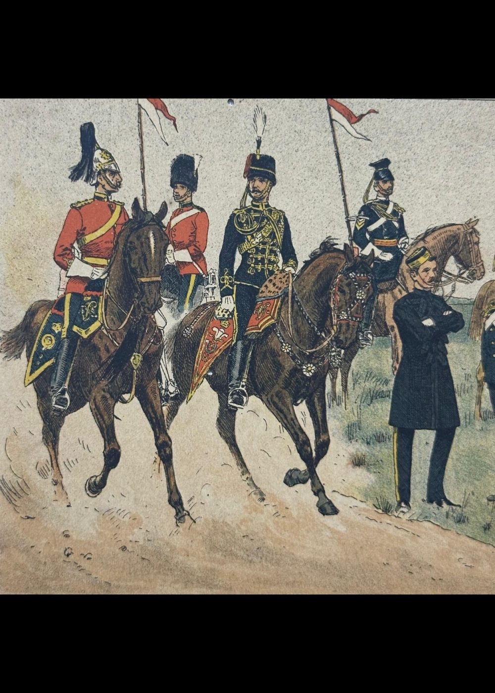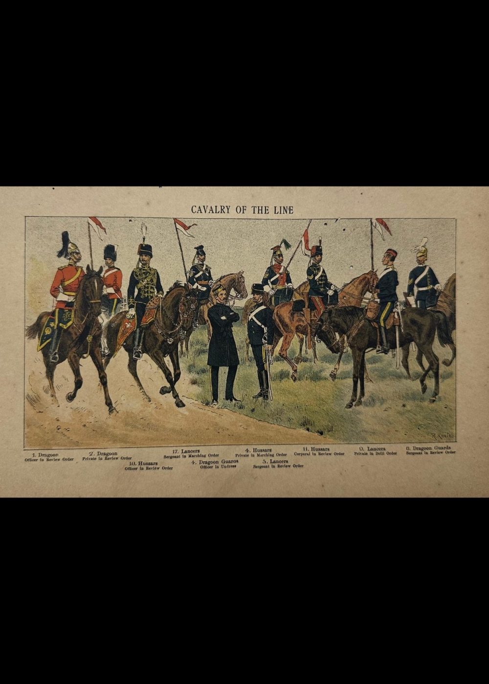 This vibrant 19th-century illustration depicts various regiments of the British Army’s line cavalry in full dress uniform. Shown mounted and in formation are troopers from distinguished units including the Dragoon Guards, Lancers, and Hussars. Each regiment is identifiable by its unique attire, headgear, and lance pennons, reflecting the prestige and pageantry of Britain’s mounted forces. Such visual records served both as reference material and patriotic celebration of the army’s proud traditions in the age of empire.