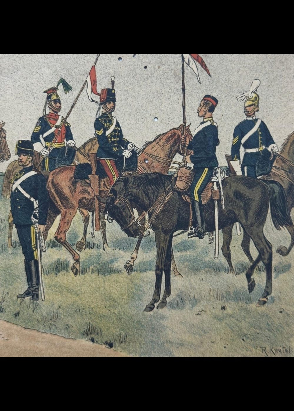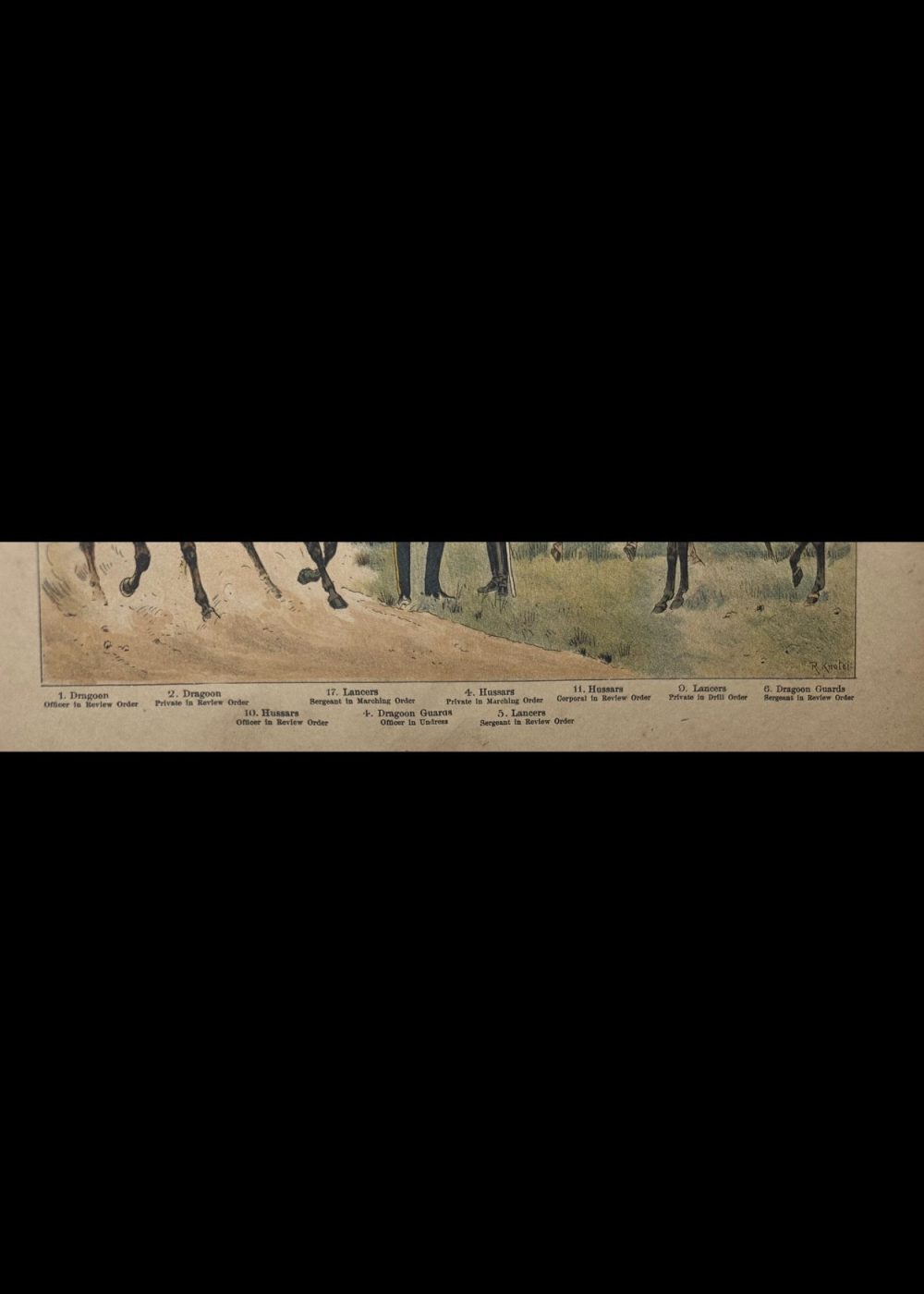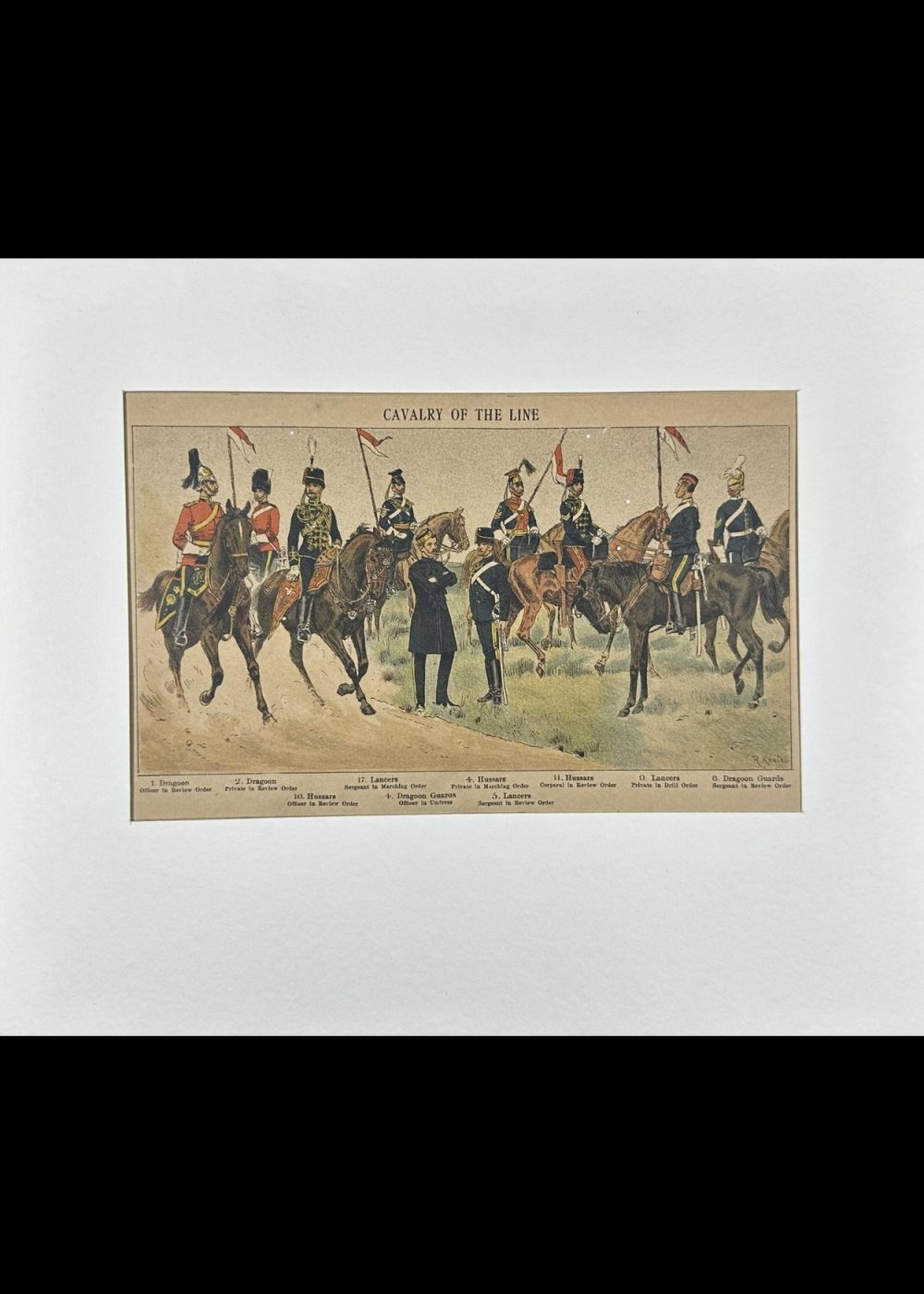 This vibrant 19th-century illustration depicts various regiments of the British Army’s line cavalry in full dress uniform. Shown mounted and in formation are troopers from distinguished units including the Dragoon Guards, Lancers, and Hussars. Each regiment is identifiable by its unique attire, headgear, and lance pennons, reflecting the prestige and pageantry of Britain’s mounted forces. Such visual records served both as reference material and patriotic celebration of the army’s proud traditions in the age of empire.