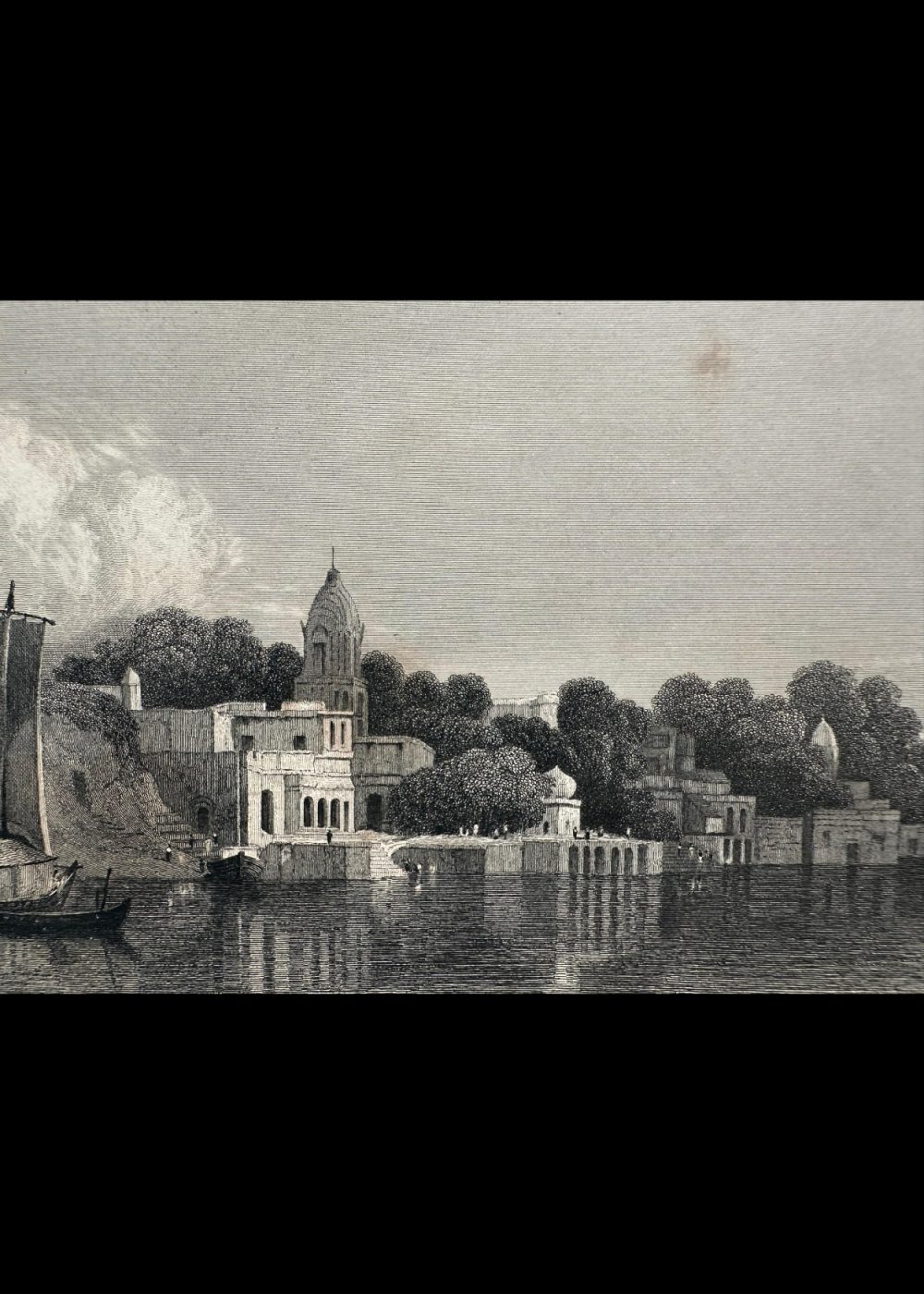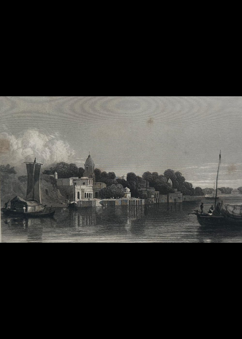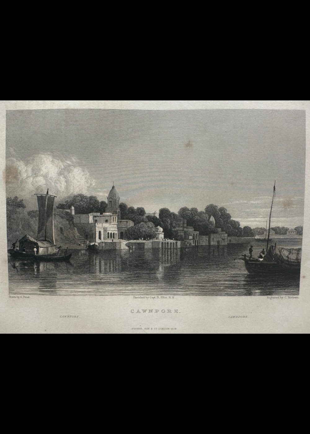 This engraving showcases a scenic view of Cawnpore (now Kanpur) in India, capturing the peaceful riverside scene with boats on the water and architectural structures lining the shore. The artwork, part of the India China book, highlights the tranquil beauty and historical charm of the region.The scene was drawn by S. Prout, with the sketch by Captain R. Elliot of the Royal Navy (R.N.), and engraved by C. Mottram. The detailed lines and shading emphasize the architectural details of the buildings and the reflection in the water, offering a glimpse into life in 19th-century India. Published by Fisher, Son & Co. in London in 1844, this engraving is a testament to the artistic documentation of India’s landscape during that time.