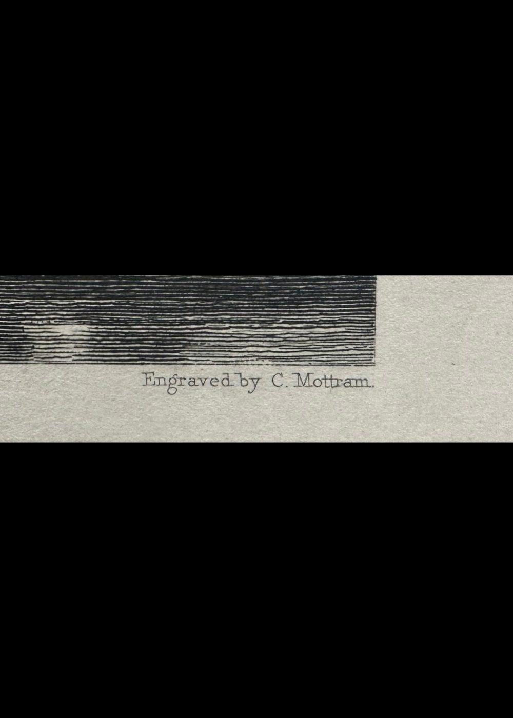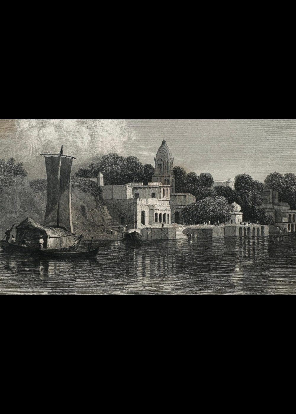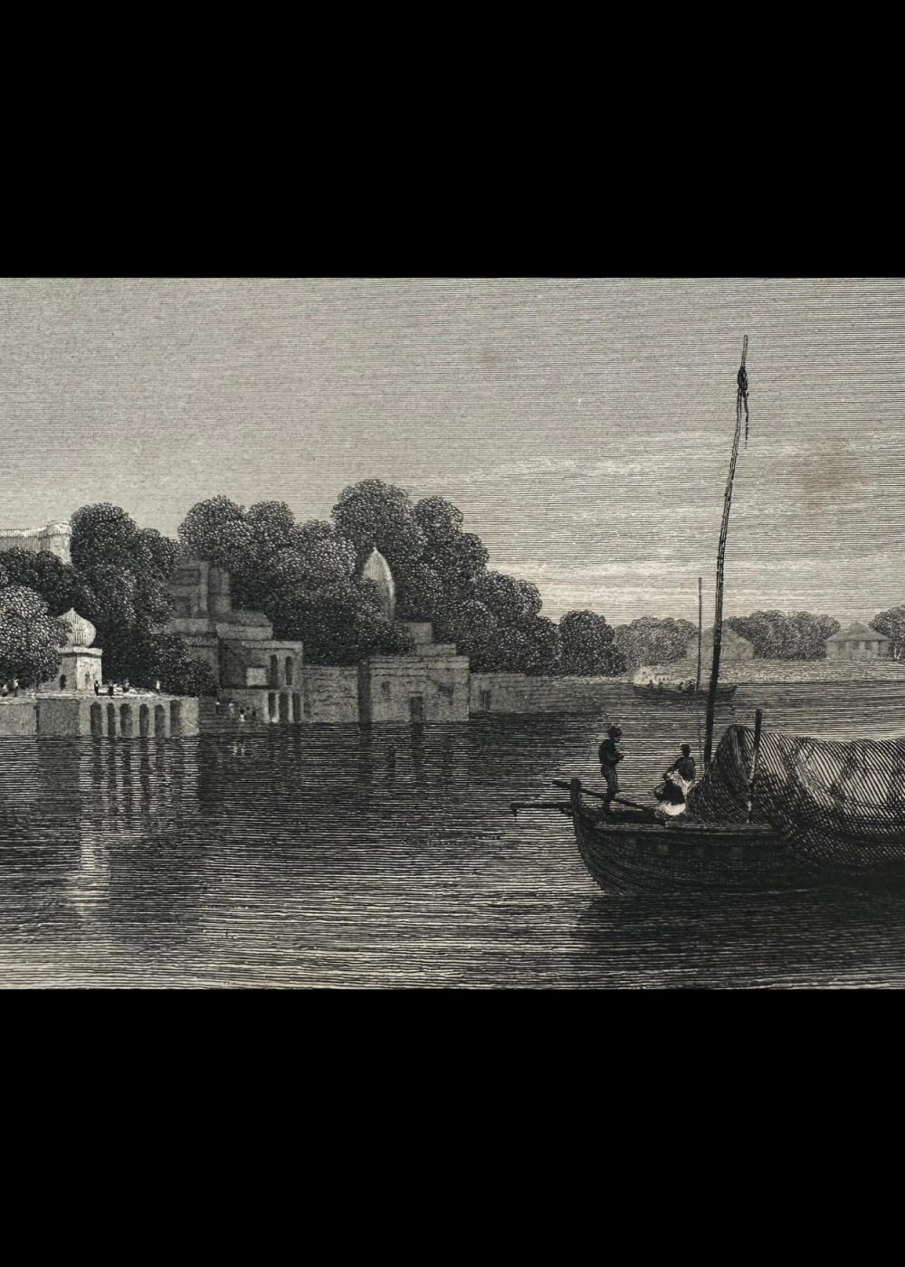 This engraving showcases a scenic view of Cawnpore (now Kanpur) in India, capturing the peaceful riverside scene with boats on the water and architectural structures lining the shore. The artwork, part of the India China book, highlights the tranquil beauty and historical charm of the region.The scene was drawn by S. Prout, with the sketch by Captain R. Elliot of the Royal Navy (R.N.), and engraved by C. Mottram. The detailed lines and shading emphasize the architectural details of the buildings and the reflection in the water, offering a glimpse into life in 19th-century India. Published by Fisher, Son & Co. in London in 1844, this engraving is a testament to the artistic documentation of India’s landscape during that time.