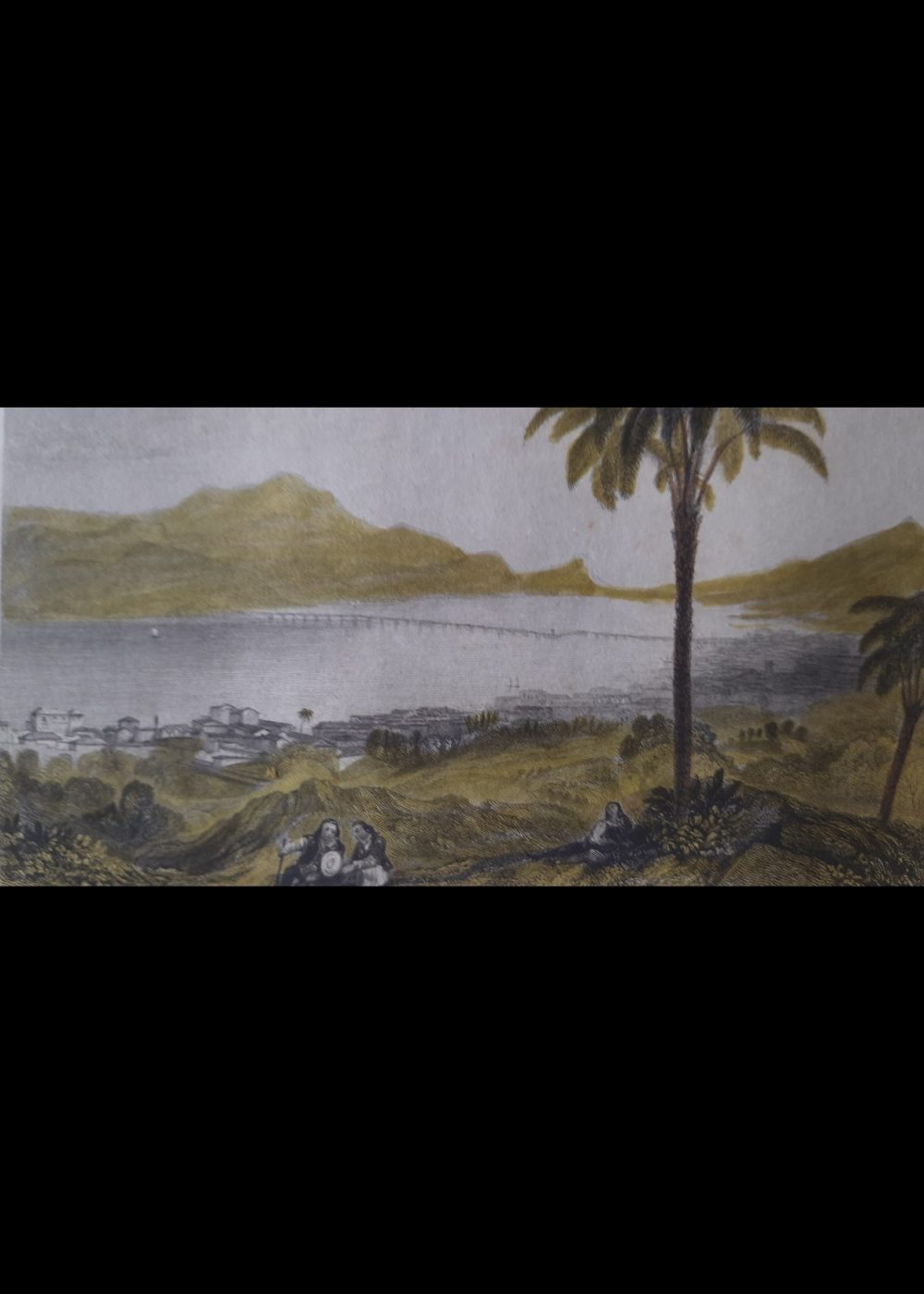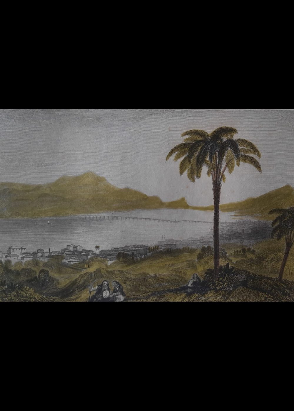 This picturesque engraving titled Consolação portrays a serene coastal landscape with a sweeping view of a bay, distant mountains, and a long bridge or causeway stretching across the water. In the foreground, two women in traditional attire rest under a pair of tall palm trees, overlooking a small town with whitewashed buildings and lush greenery. The scene was drawn by Lt. R. Temple, R.N., from a sketch by W. Smyth and engraved by E. Finden. Published in 1833 by J. Murray, this tranquil vista likely depicts a view from Brazil or Portugal, capturing the natural beauty and colonial charm of the location.