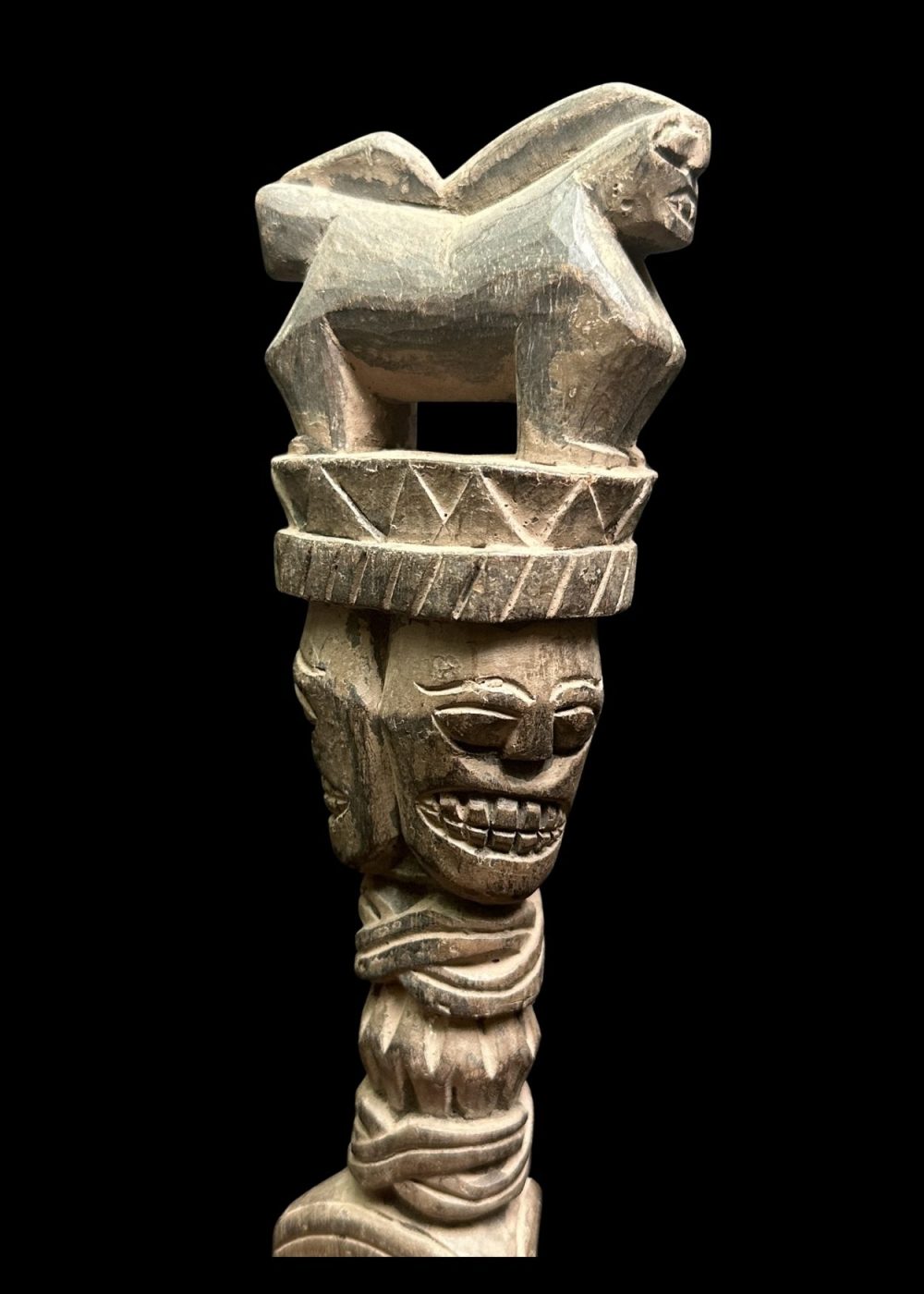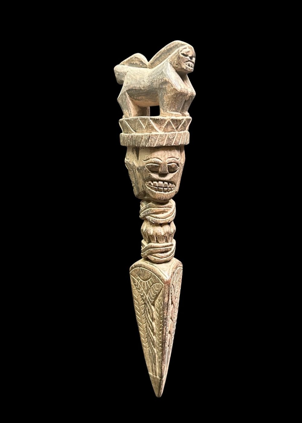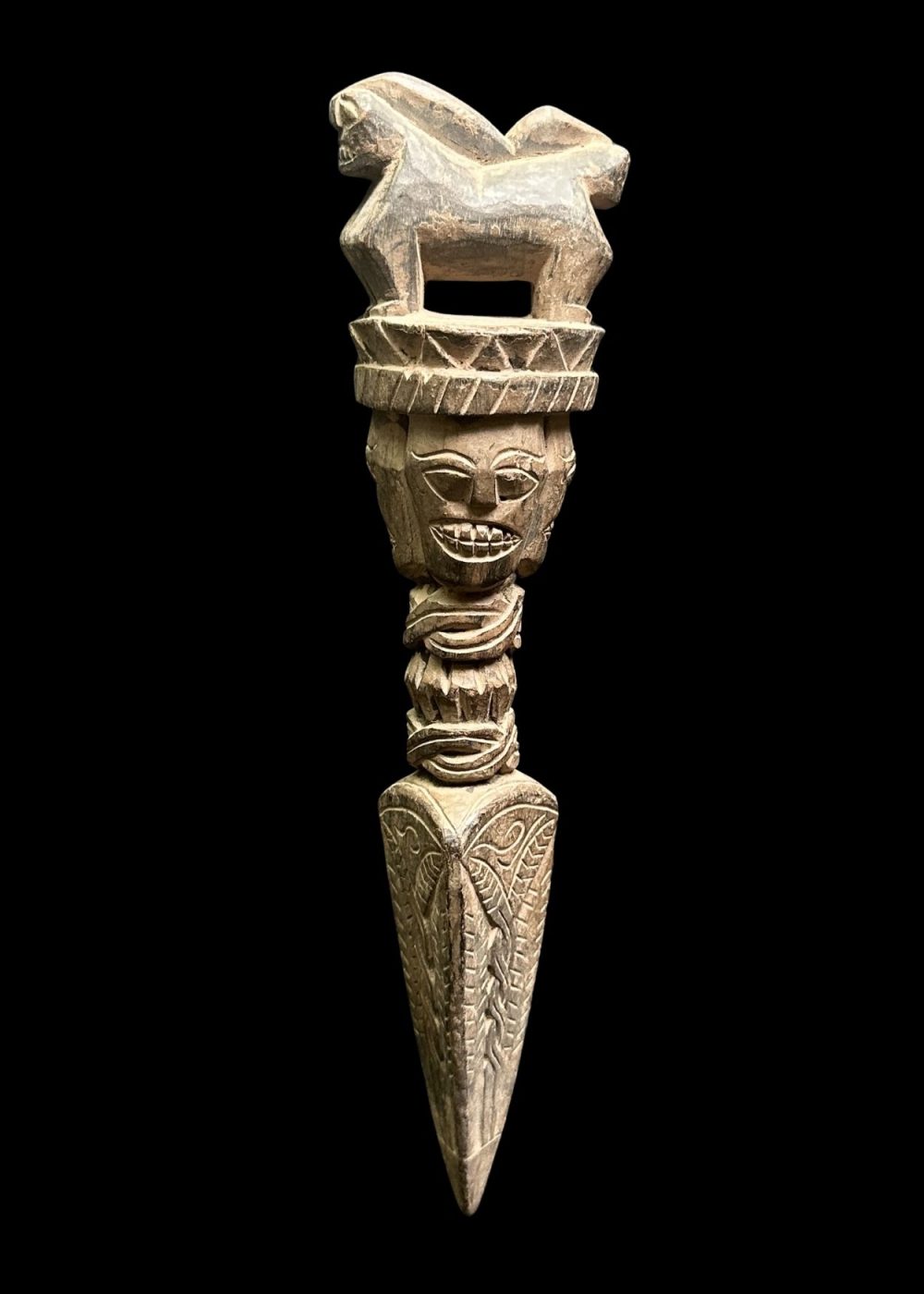 CEREMONIAL WOODEN FIGURE WITH CROWN AND BEAST MOTIF