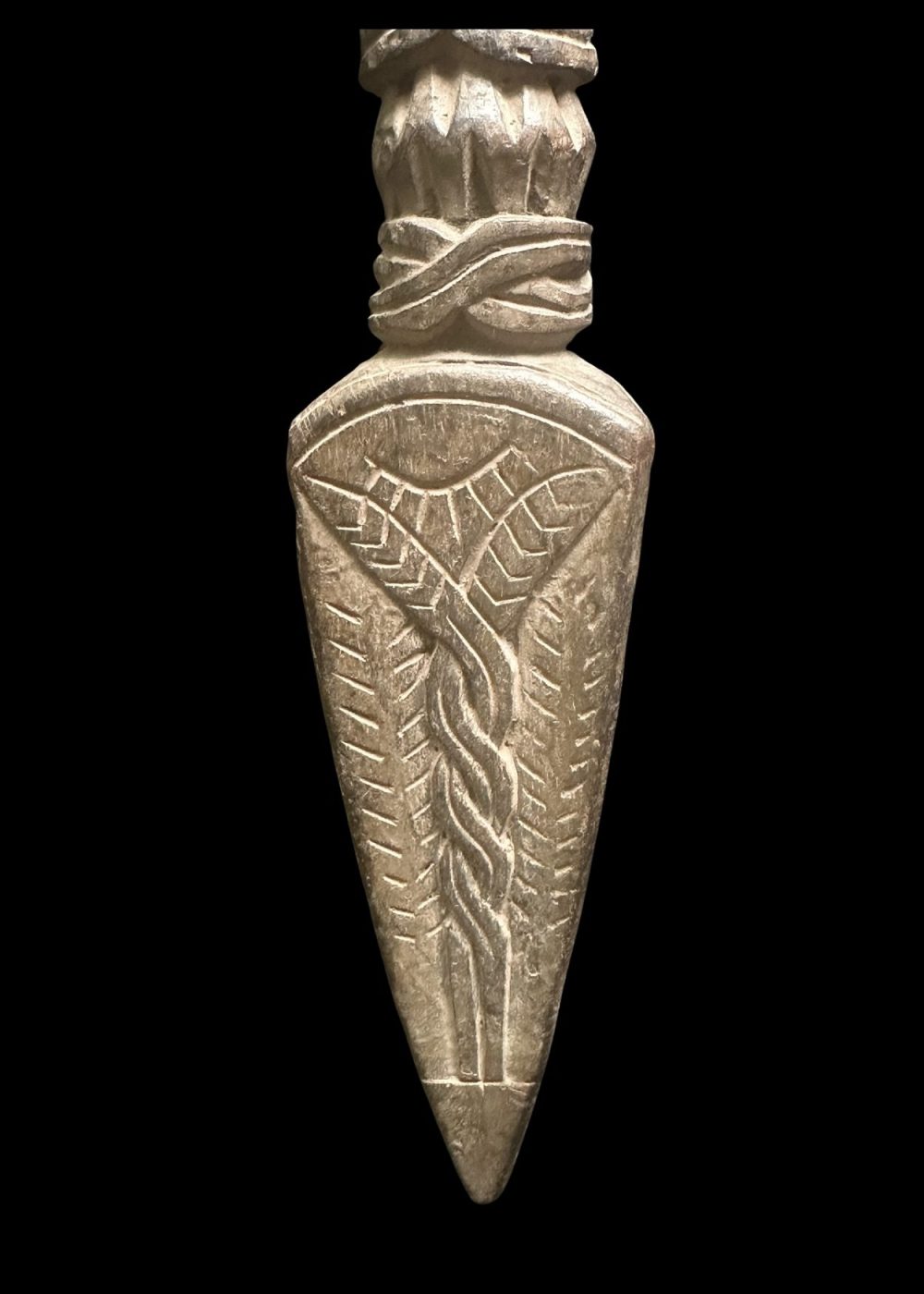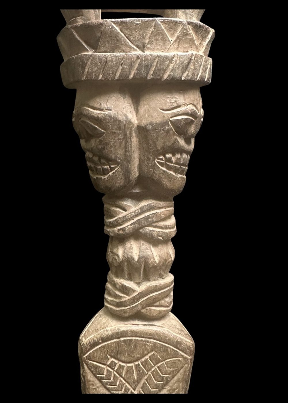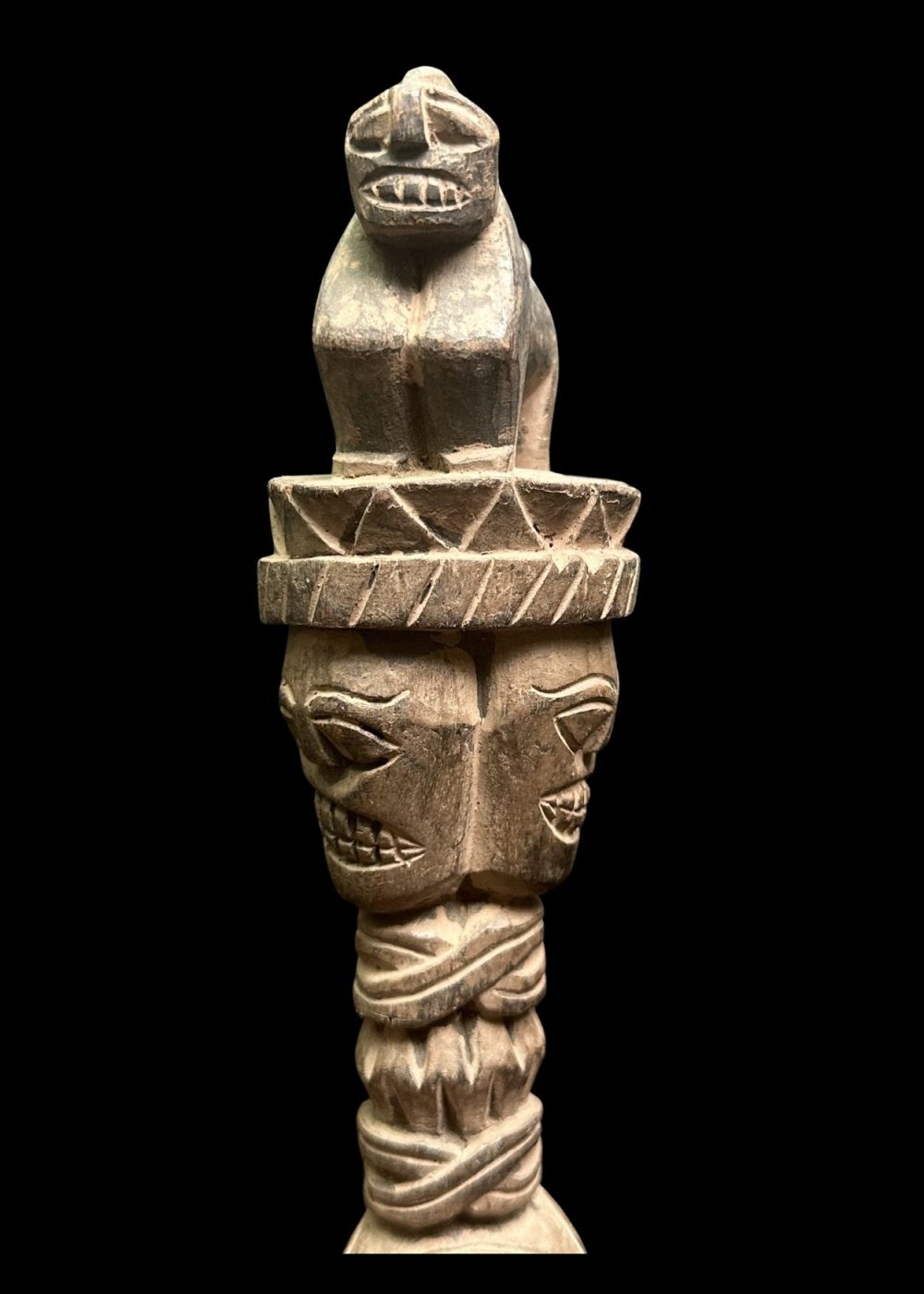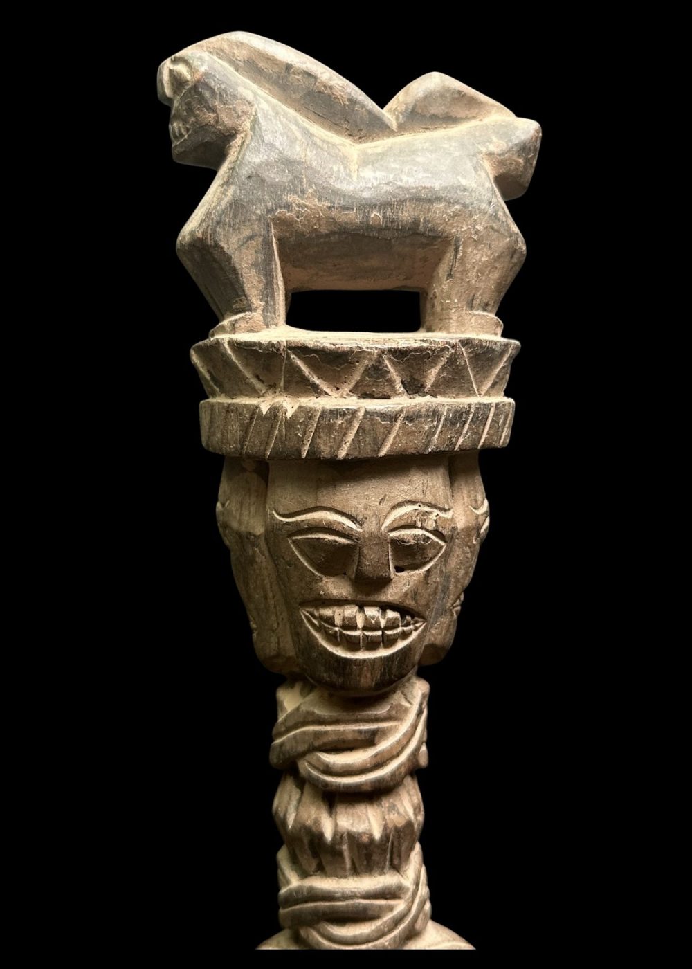 CEREMONIAL WOODEN FIGURE WITH CROWN AND BEAST MOTIF
