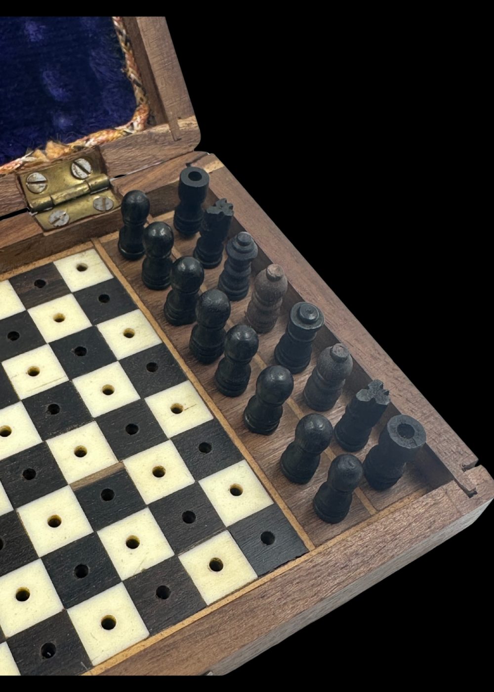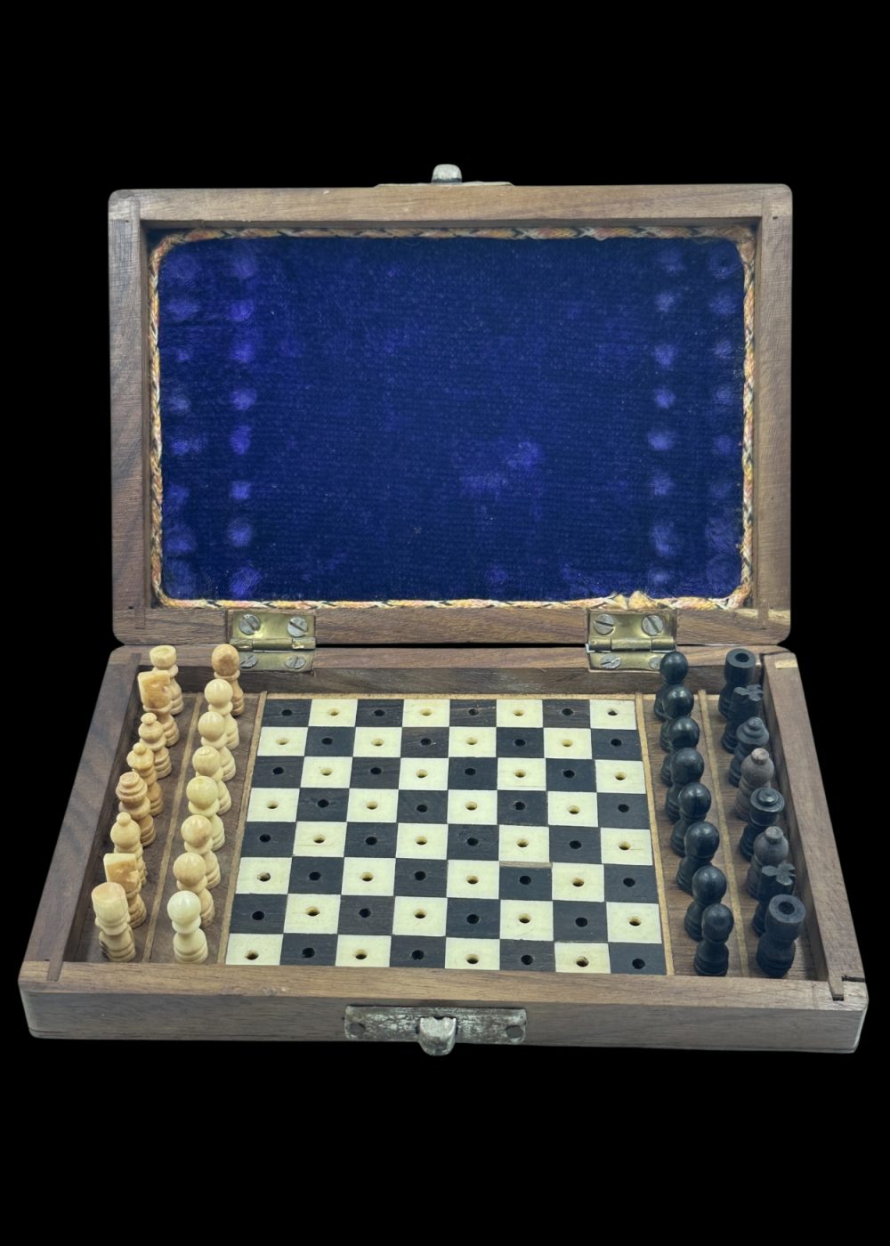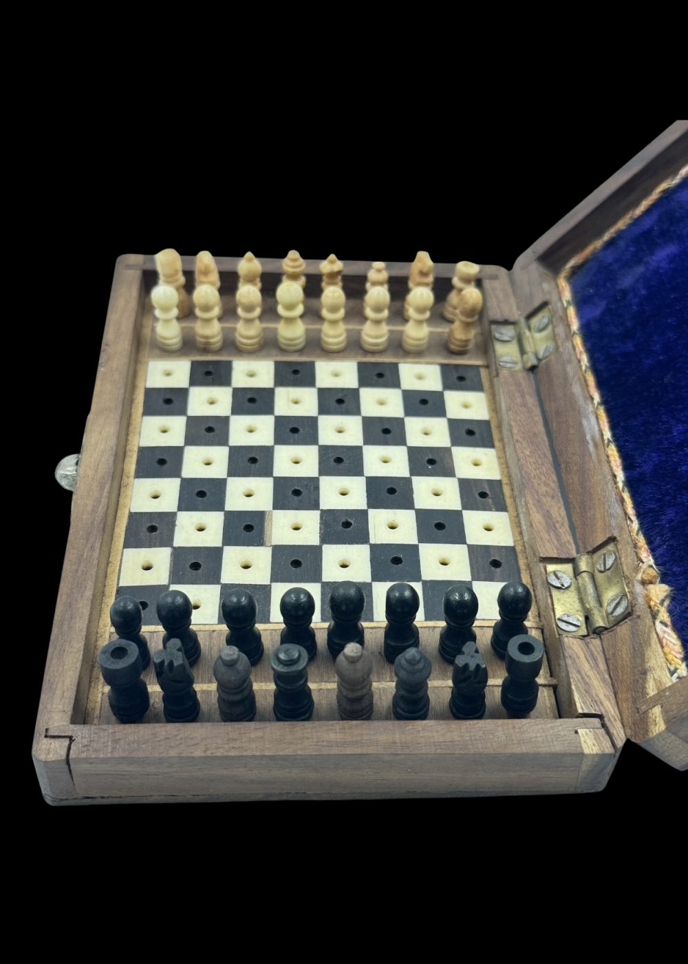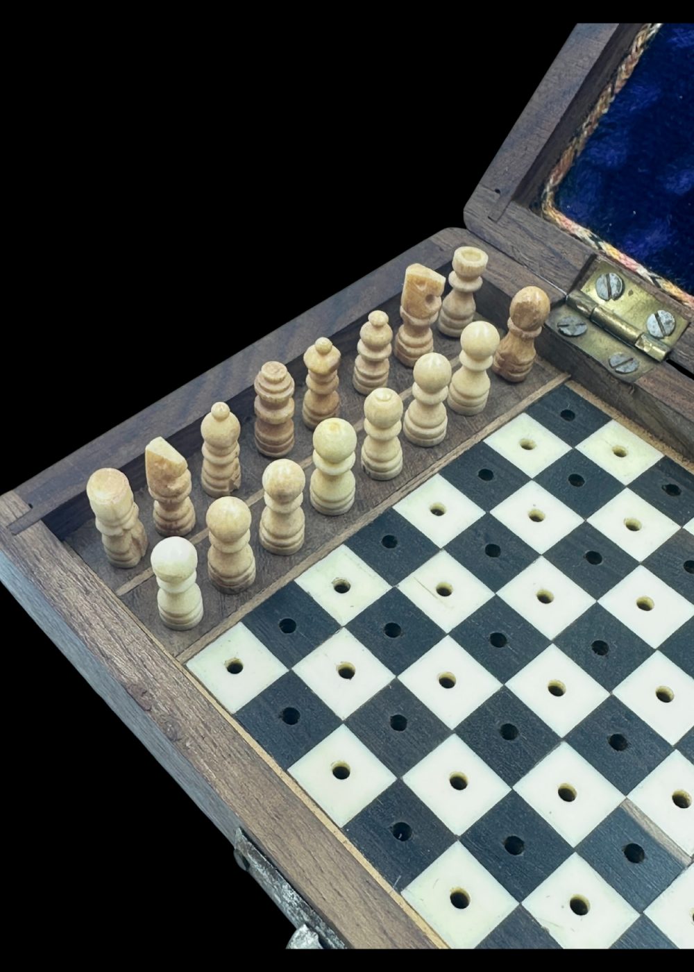 This finely crafted chess set, made from sandalwood and ebony, originates from Kerala and dates back approximately 50–60 years. Housed in a compact wooden box lined with rich velvet, the set features pegged pieces and a board designed for travel and durability. The detailed workmanship and choice of premium woods highlight Kerala’s long-standing tradition of skilled artisanal woodworking, blending functionality with timeless aesthetic appeal.