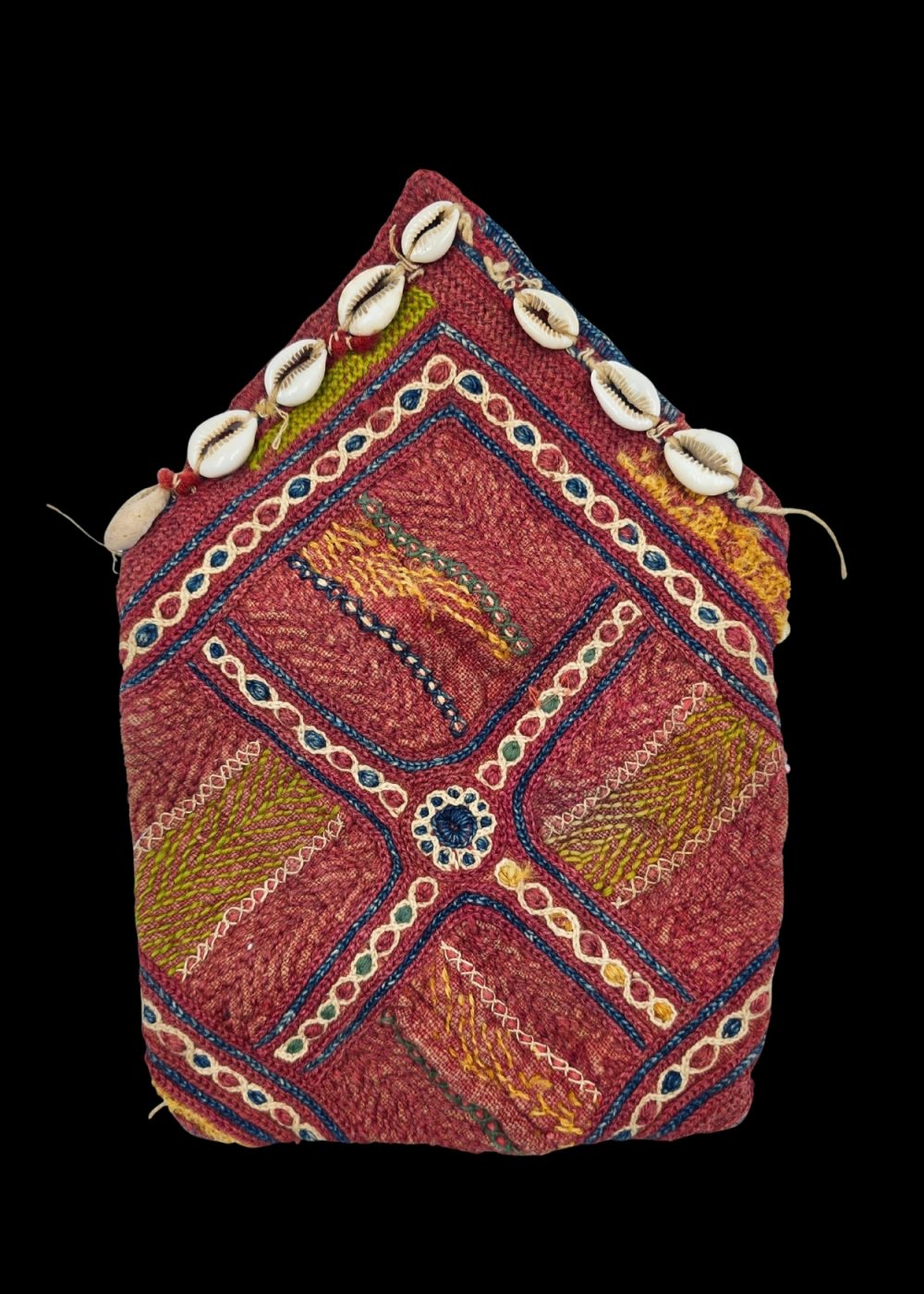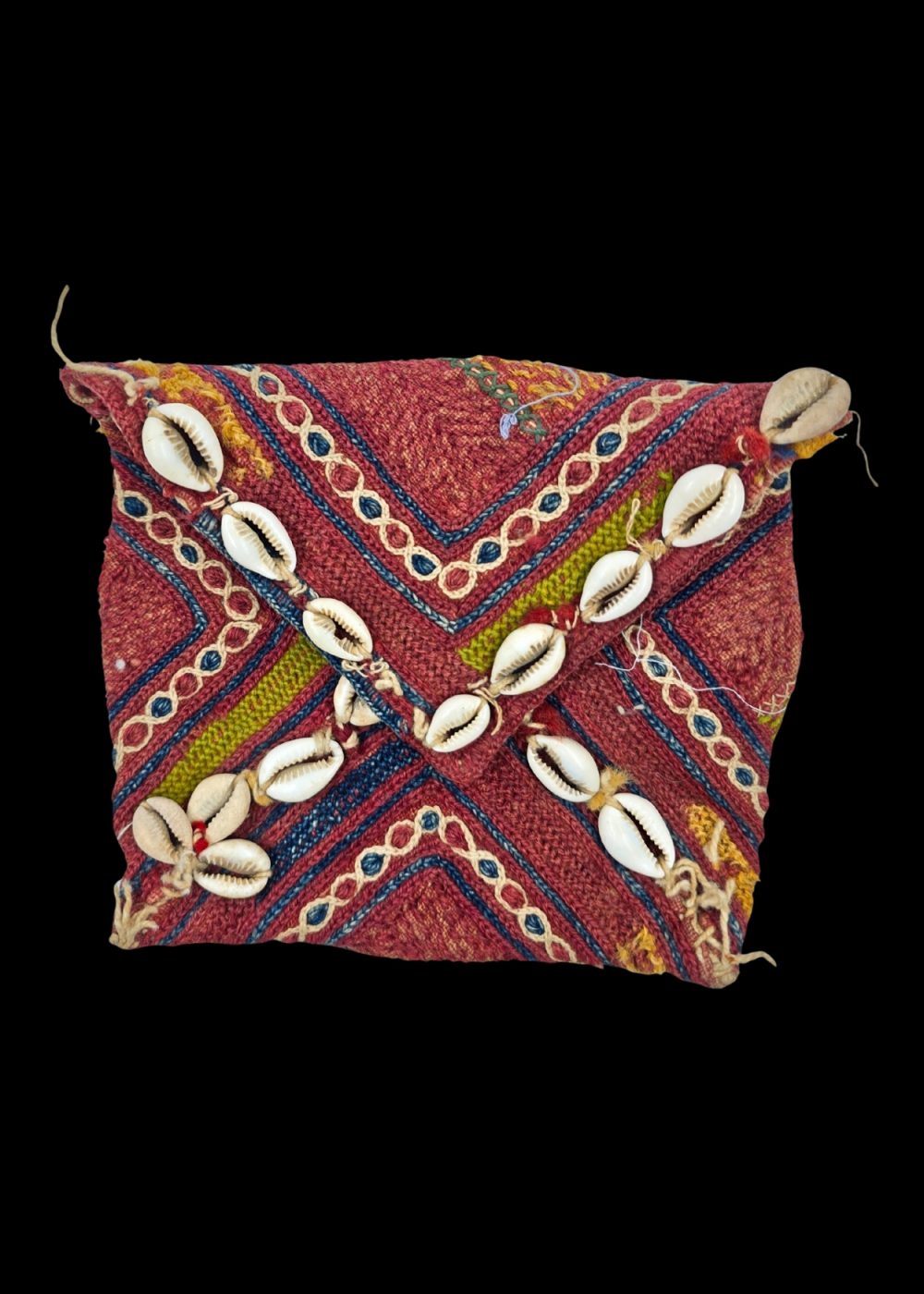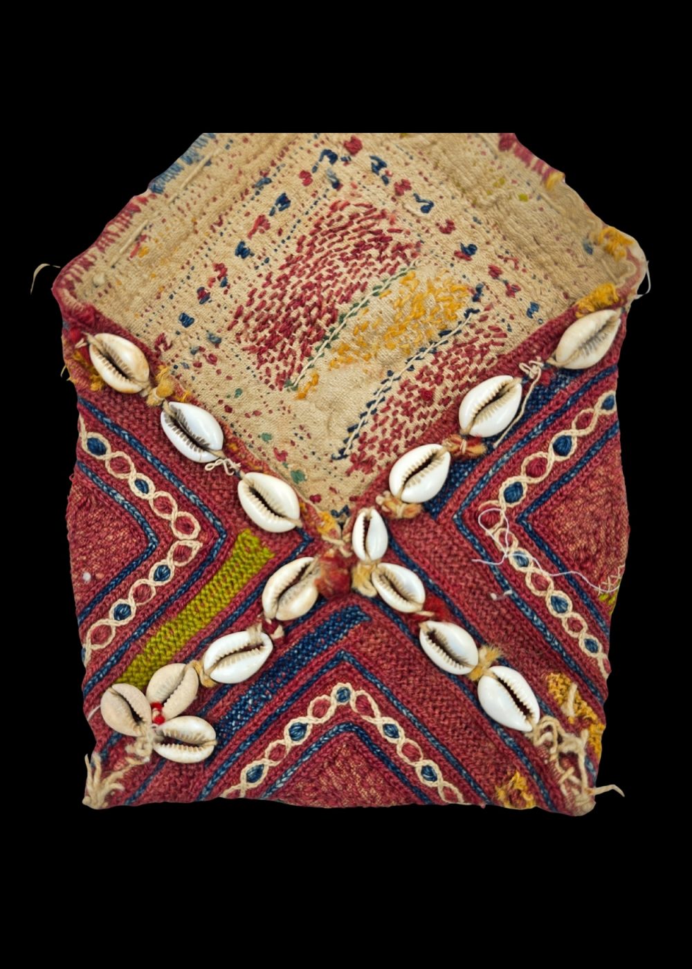 This image showcases a traditional Banjara embroidered tribal bag, adorned with cowrie shells. The bag features vibrant, geometric patterns in rich colors like red, blue, and yellow, with intricate thread work that reflects the skill and artistry of the Banjara community. The cowrie shells are carefully stitched along the edges, adding both texture and cultural significance. These bags are typically used by the Banjara people for practical purposes, while also serving as a symbol of their rich heritage and craftsmanship.