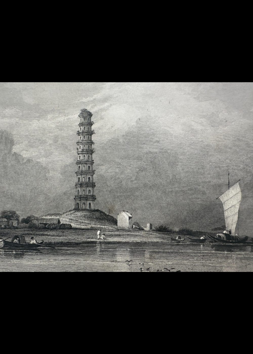 This engraving depicts a serene riverside view featuring a tall Chinese pagoda situated between Canton (Guangzhou) and Whampoa (Huangpu). Traditional Chinese boats glide across calm waters, while figures on the shore lend life to the tranquil scene. The composition highlights the distinctive architecture of the pagoda, rising gracefully above the landscape, symbolizing both cultural heritage and harmony with nature. Part of the India and China series, it reflects 19th-century European artistic fascination with the East.