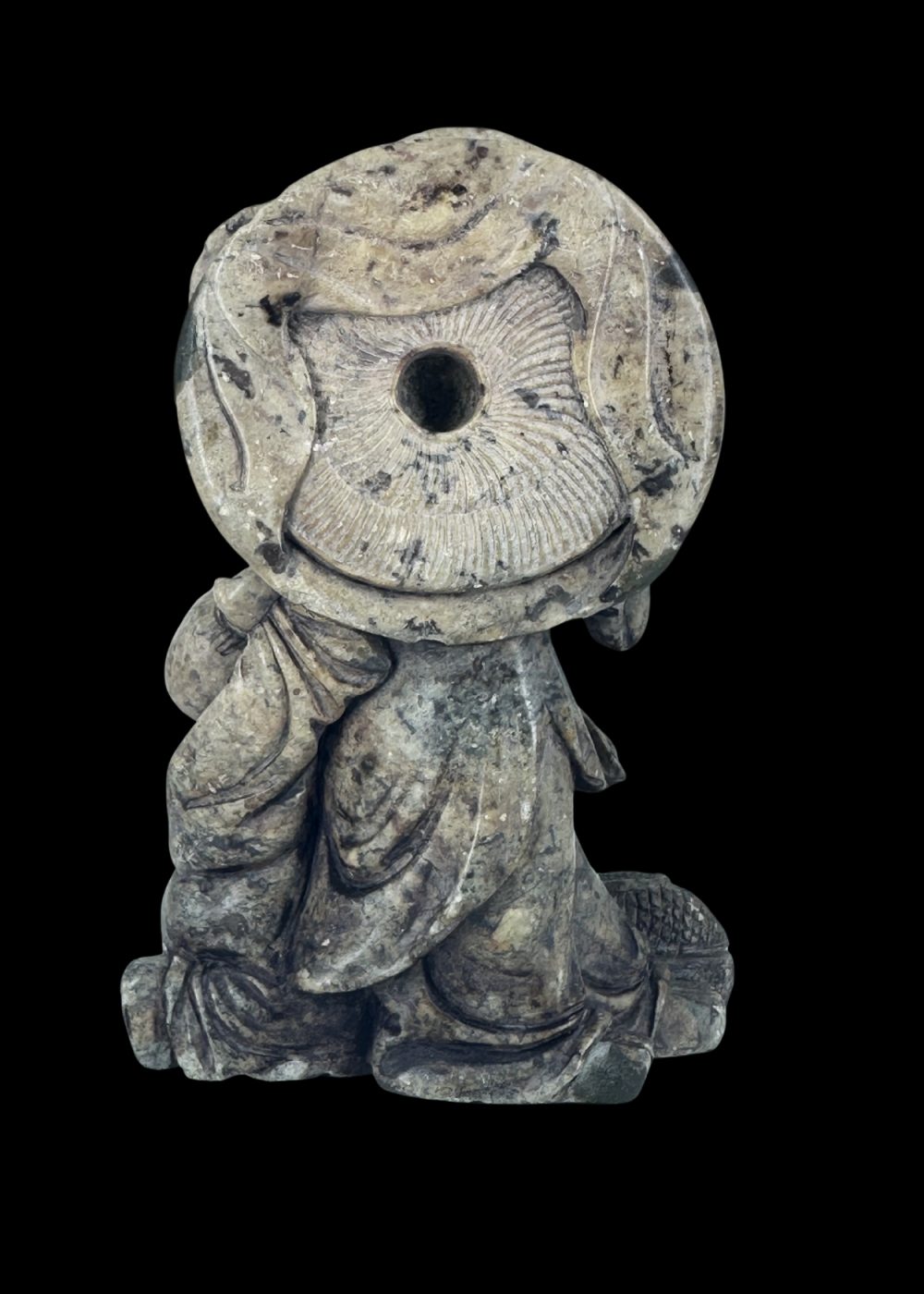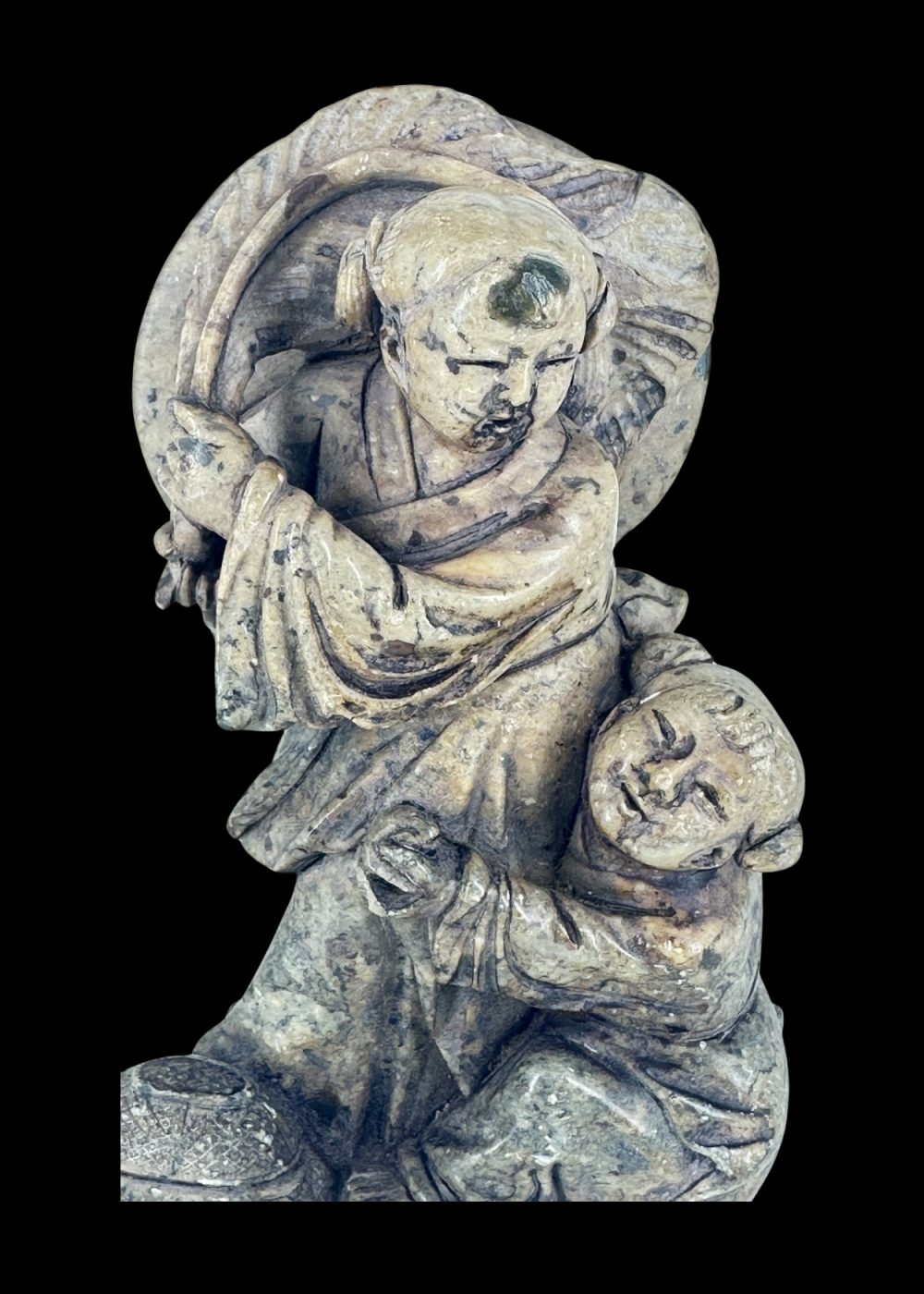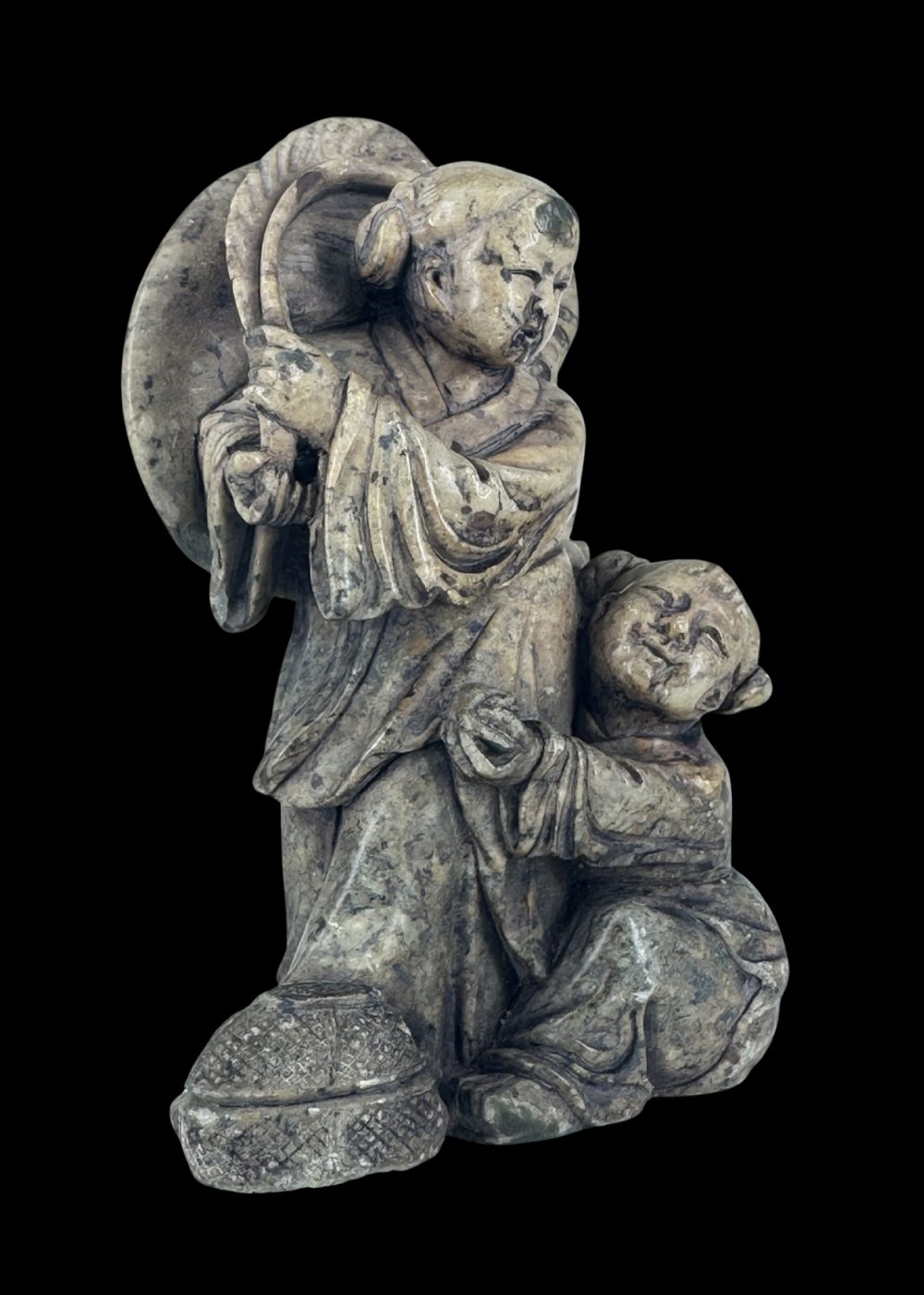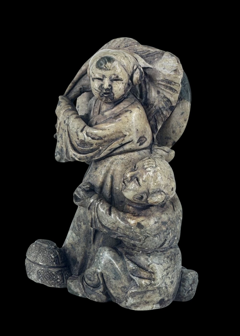 This finely carved soapstone piece features two figures—one seated, gently clasping the robe of a standing companion who holds an object, possibly symbolic or ceremonial. The sculpture exudes craftsmanship through its delicate folds, expressions, and smooth, polished surface typical of traditional Chinese artistry. A harmonious blend of narrative and technique, the work reflects the cultural emphasis on storytelling and reverence in Chinese carving traditions.