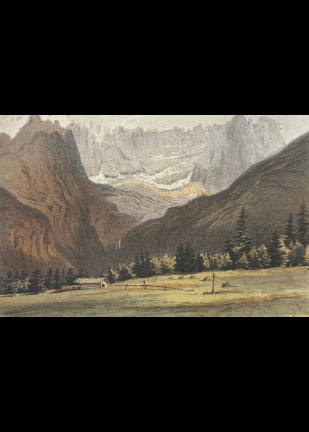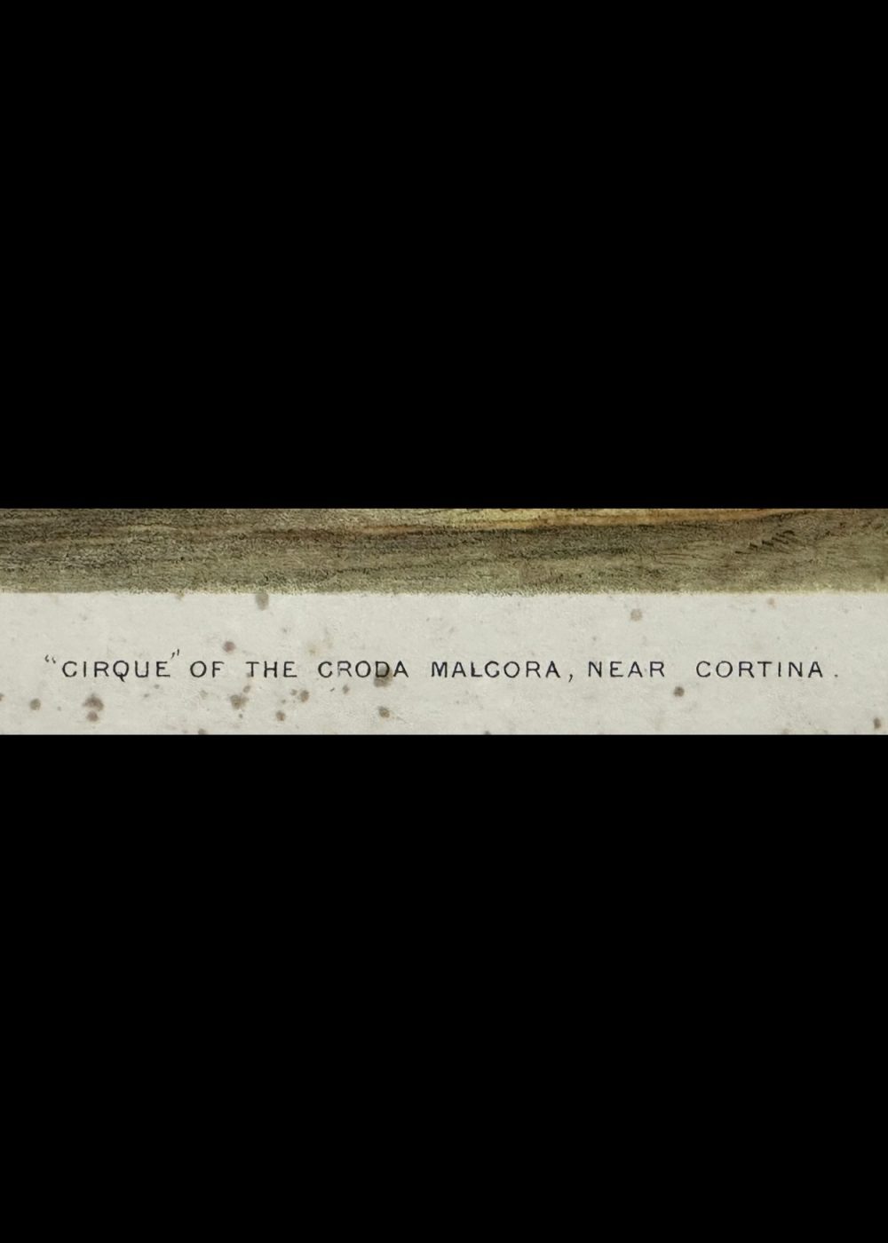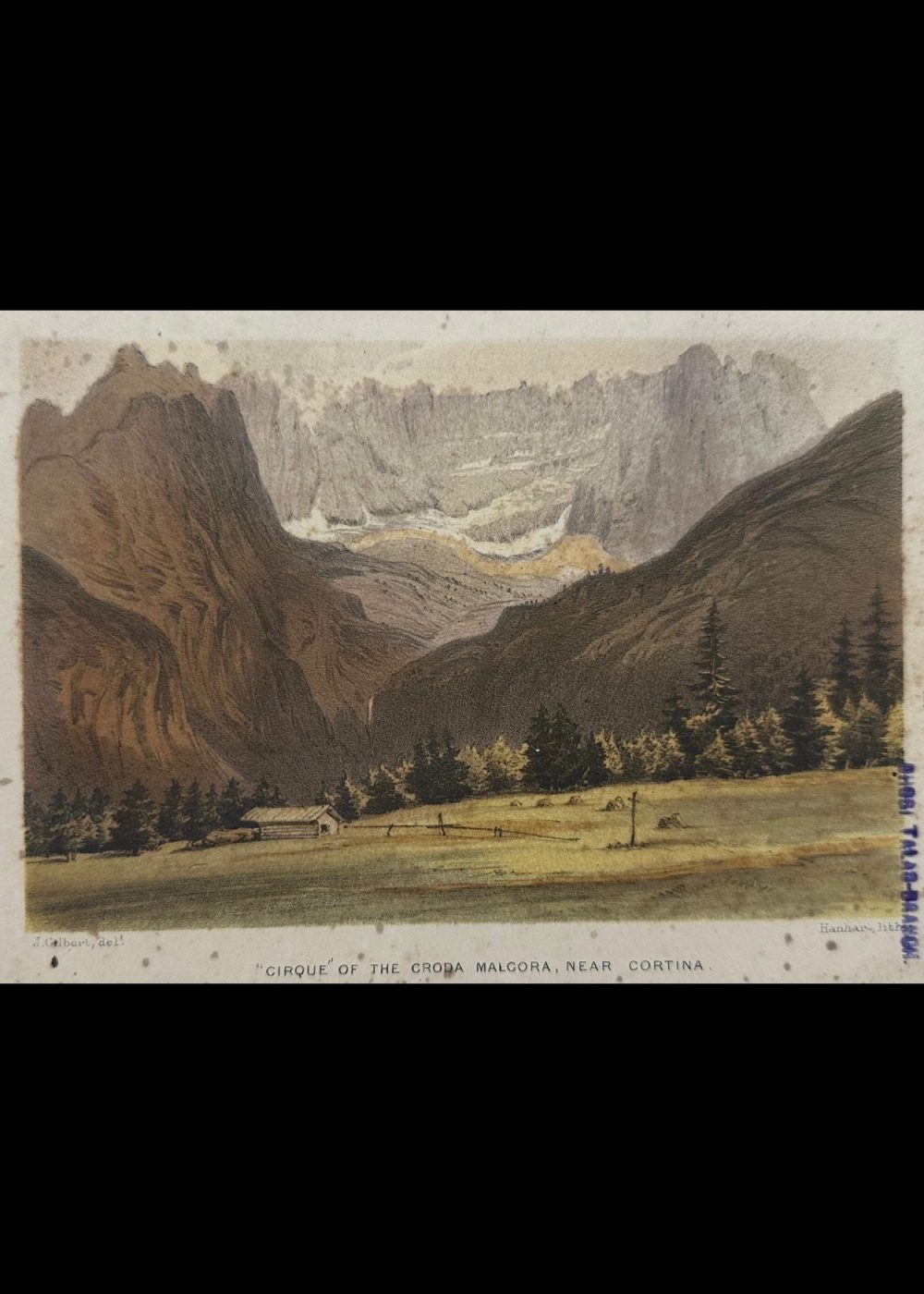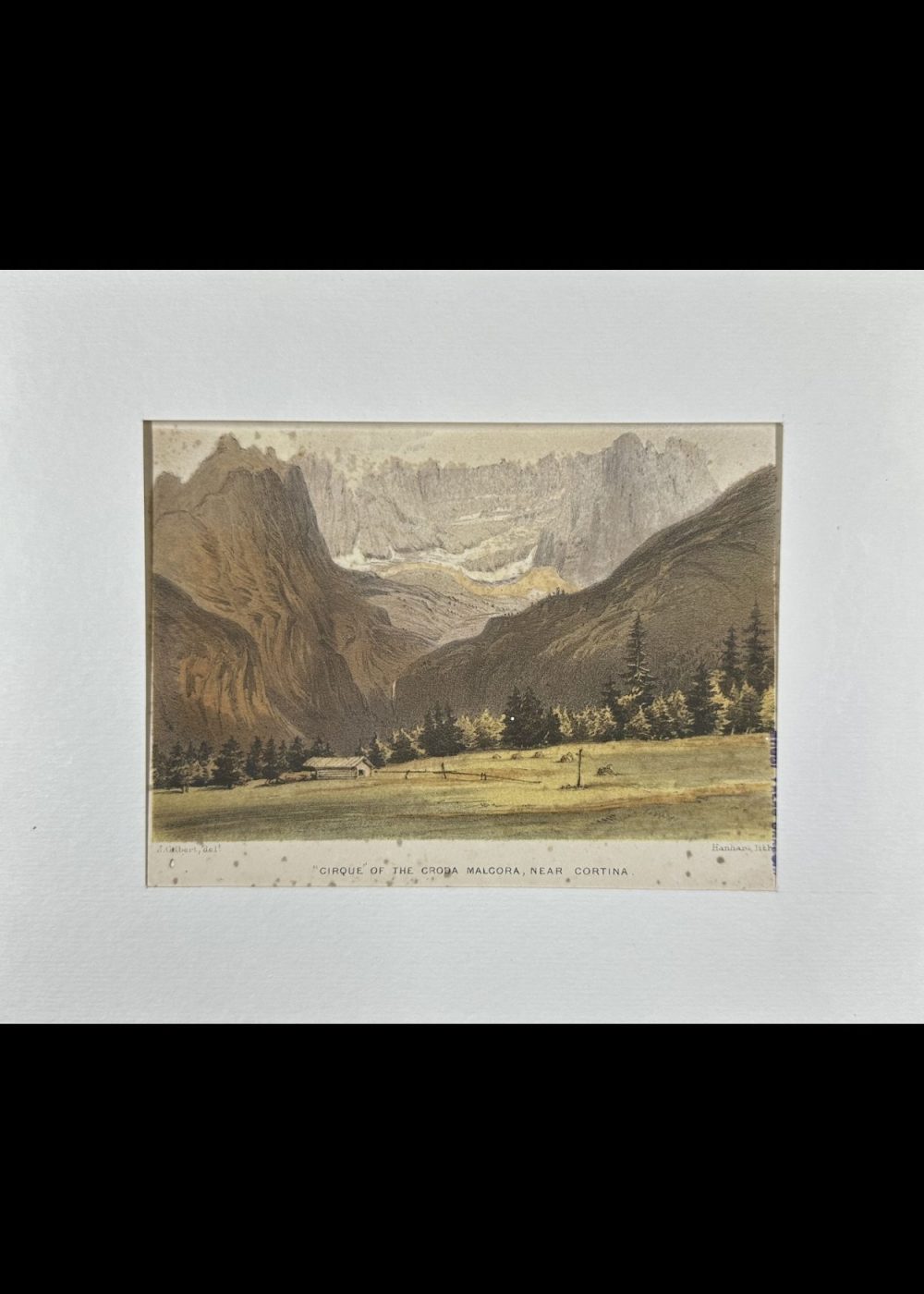 This delicate 19th-century chromolithograph presents a sweeping view of the Croda Malgora, a striking alpine formation near Cortina d’Ampezzo in the Dolomite region of northern Italy. The composition features dramatic rocky cliffs enveloping a glacial valley, with a sunlit pasture and scattered alpine trees in the foreground. A few small figures and a structure suggest human scale amid the grand natural setting. The warm earth tones and careful shading highlight the rugged beauty of the terrain, capturing the serene yet majestic essence of the Dolomites.