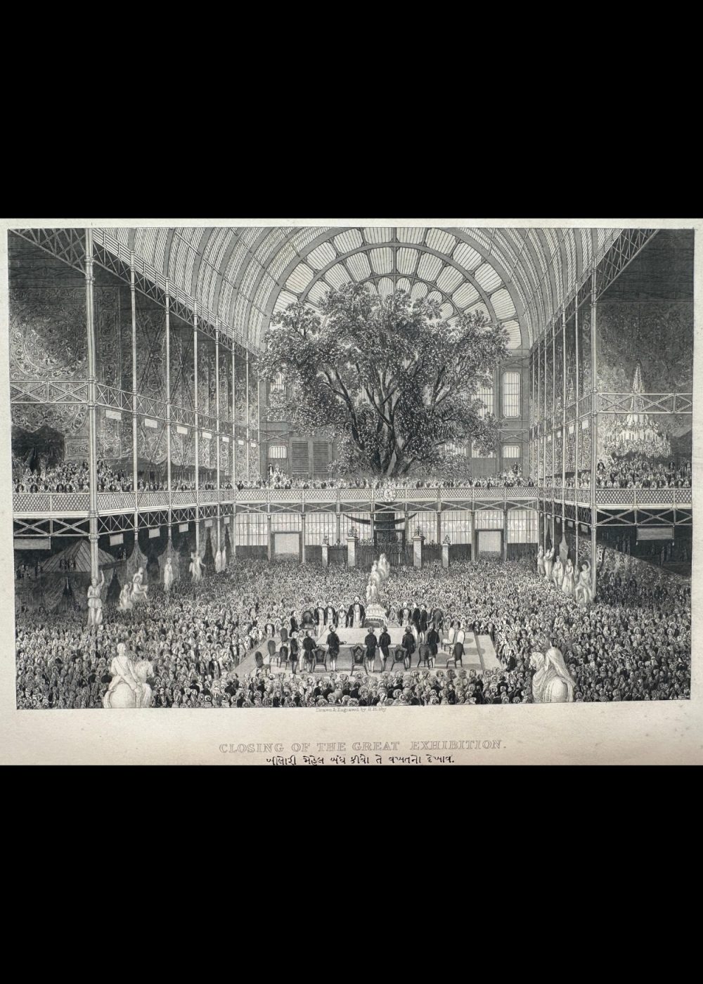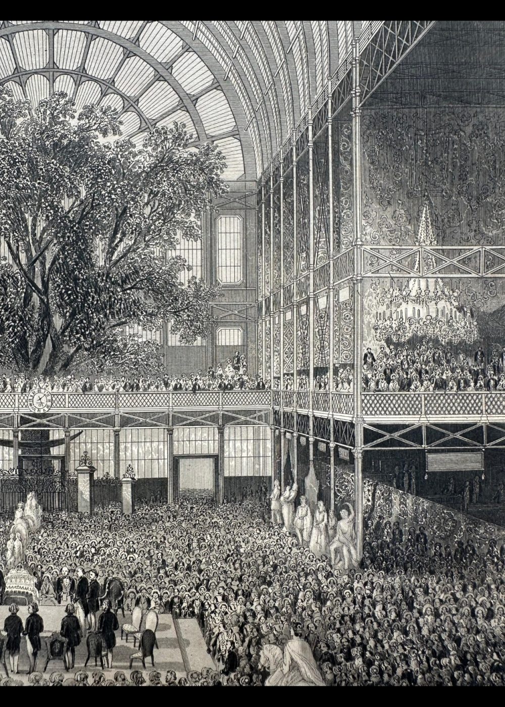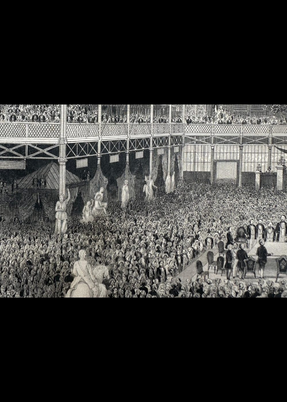 This engraving depicts the closing ceremony of the Great Exhibition held at the Crystal Palace in 1851. The scene shows a large crowd gathered inside the palace, which is illuminated by chandeliers and decorated with grand sculptures. In the center, a formal gathering is taking place, with dignitaries and key figures sitting at a raised platform. The expansive, glass-roofed structure of the Crystal Palace is prominently featured, along with an impressive tree at its heart. The engraving captures the sense of both celebration and finality as the historic event comes to an end, marking a significant moment in the Victorian era’s industrial and cultural history.