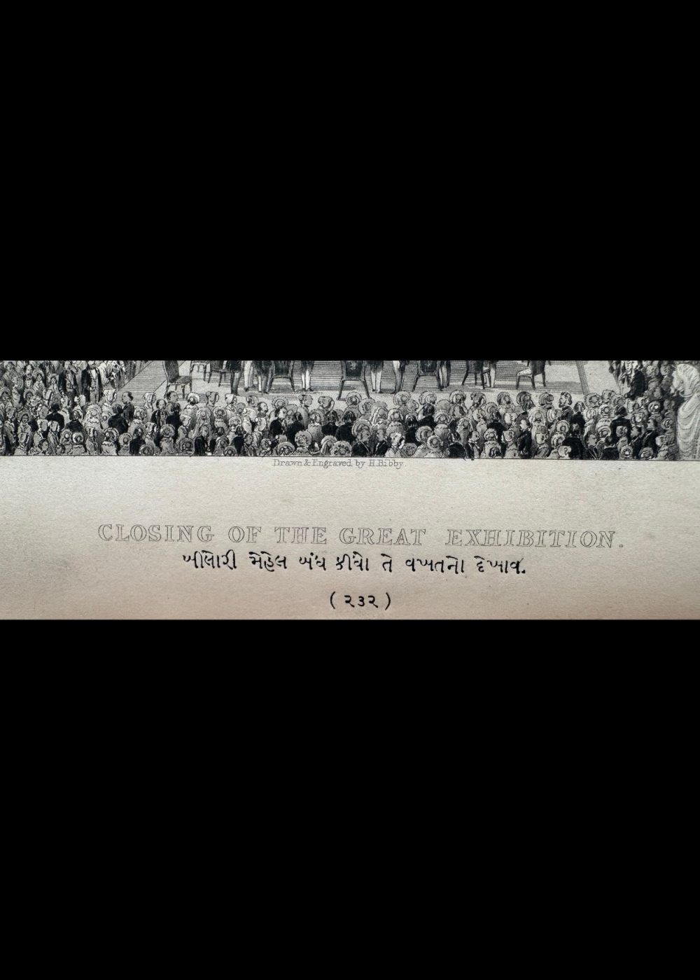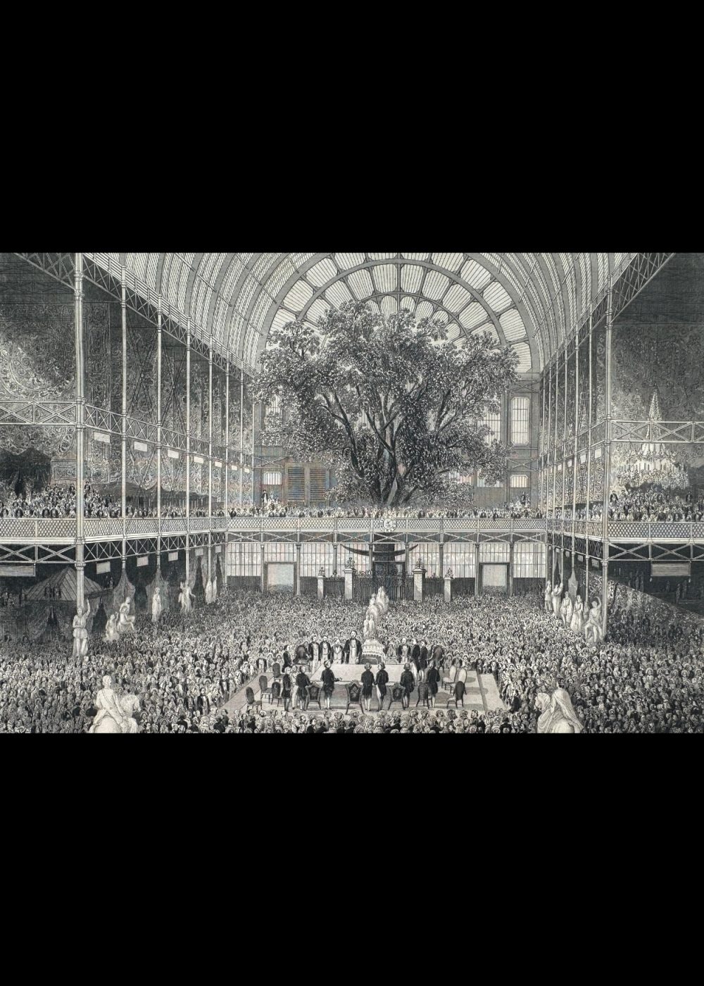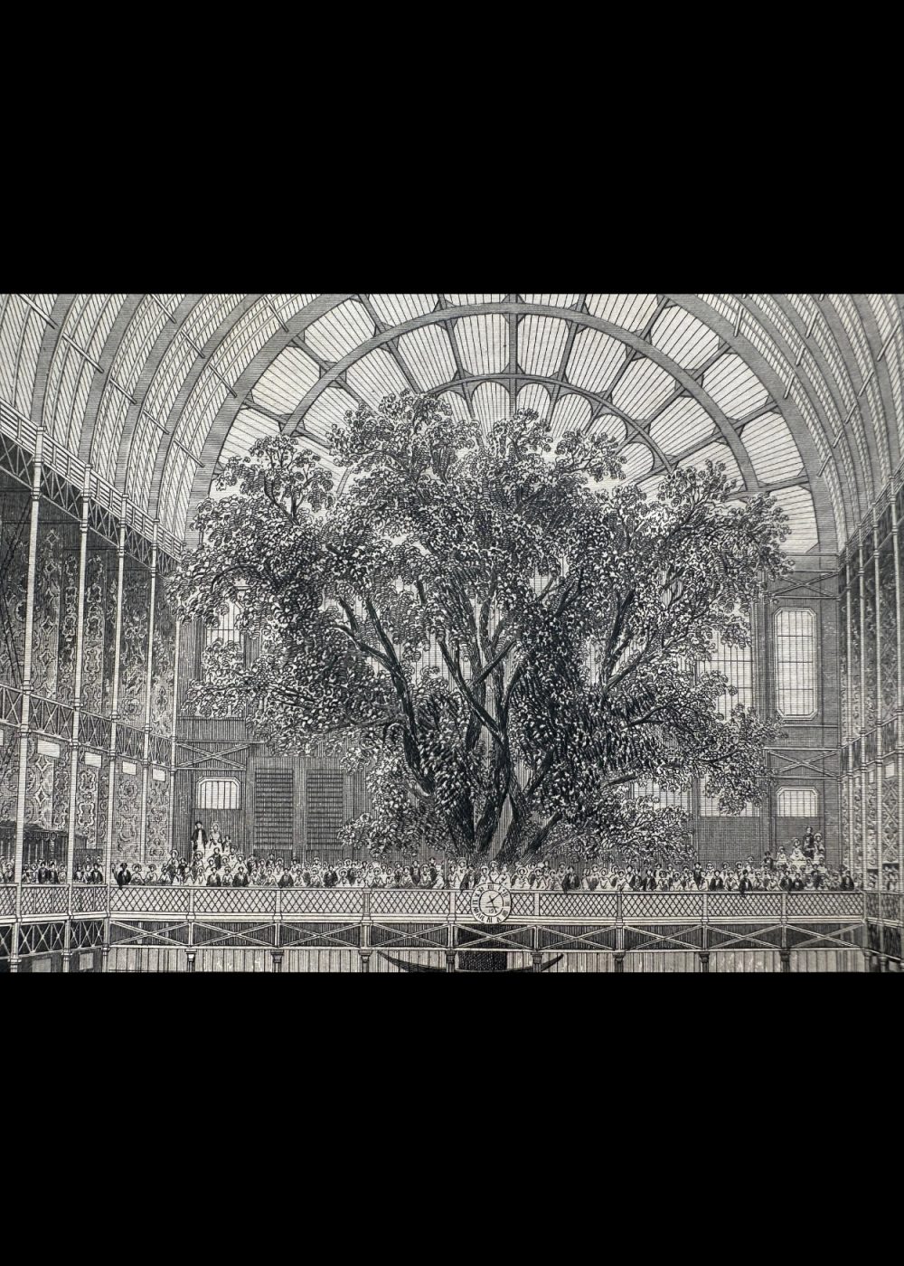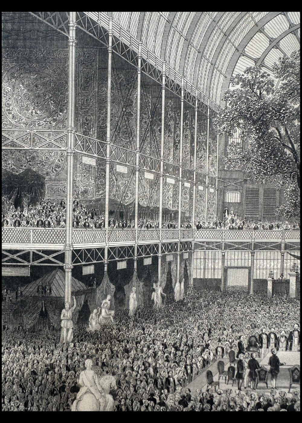 This engraving depicts the closing ceremony of the Great Exhibition held at the Crystal Palace in 1851. The scene shows a large crowd gathered inside the palace, which is illuminated by chandeliers and decorated with grand sculptures. In the center, a formal gathering is taking place, with dignitaries and key figures sitting at a raised platform. The expansive, glass-roofed structure of the Crystal Palace is prominently featured, along with an impressive tree at its heart. The engraving captures the sense of both celebration and finality as the historic event comes to an end, marking a significant moment in the Victorian era’s industrial and cultural history.