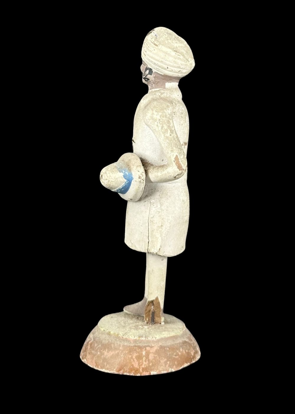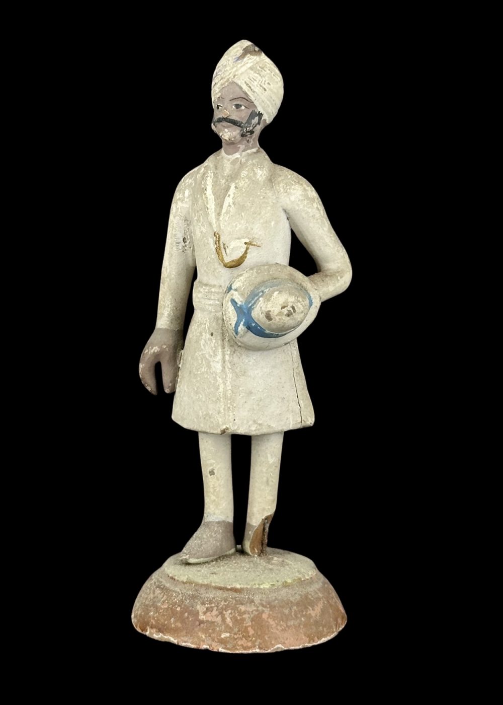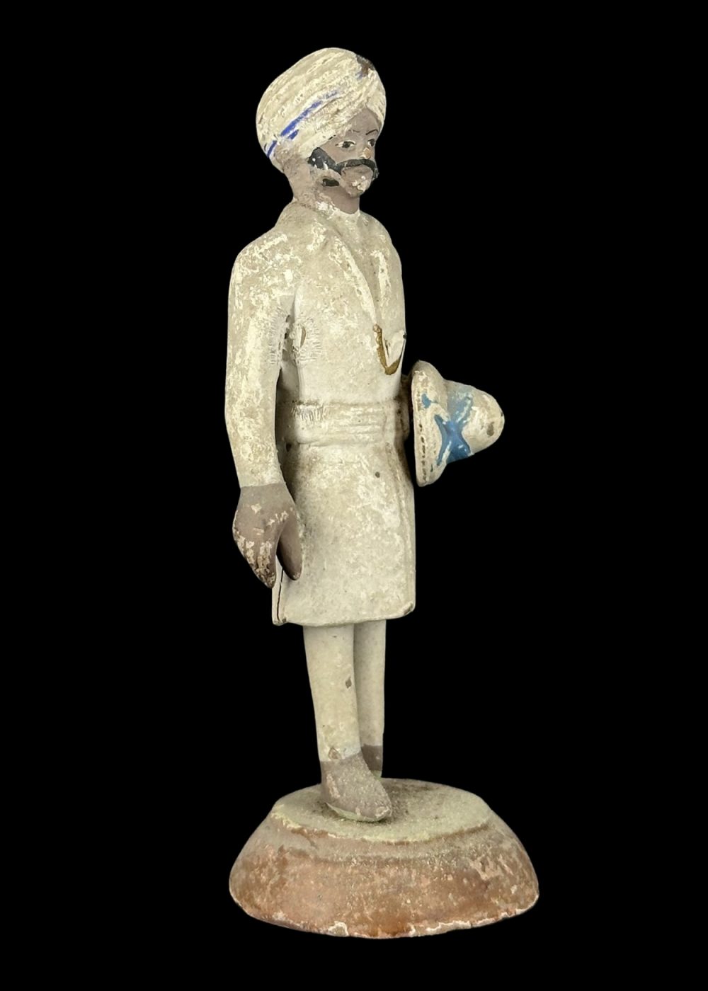 This figurine depicts an Indian attendant or orderly from the colonial era, dressed in a traditional turban and long coat, holding a round object—possibly a ceremonial item or piece of equipment—under one arm. His neatly groomed appearance, upright stance, and formal attire suggest his role in a colonial administrative or service context. The figure captures a historical period marked by Indo-British cultural intersections and reflects the dignity and discipline of domestic or institutional service personnel during that time.