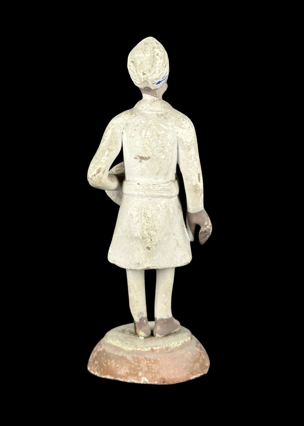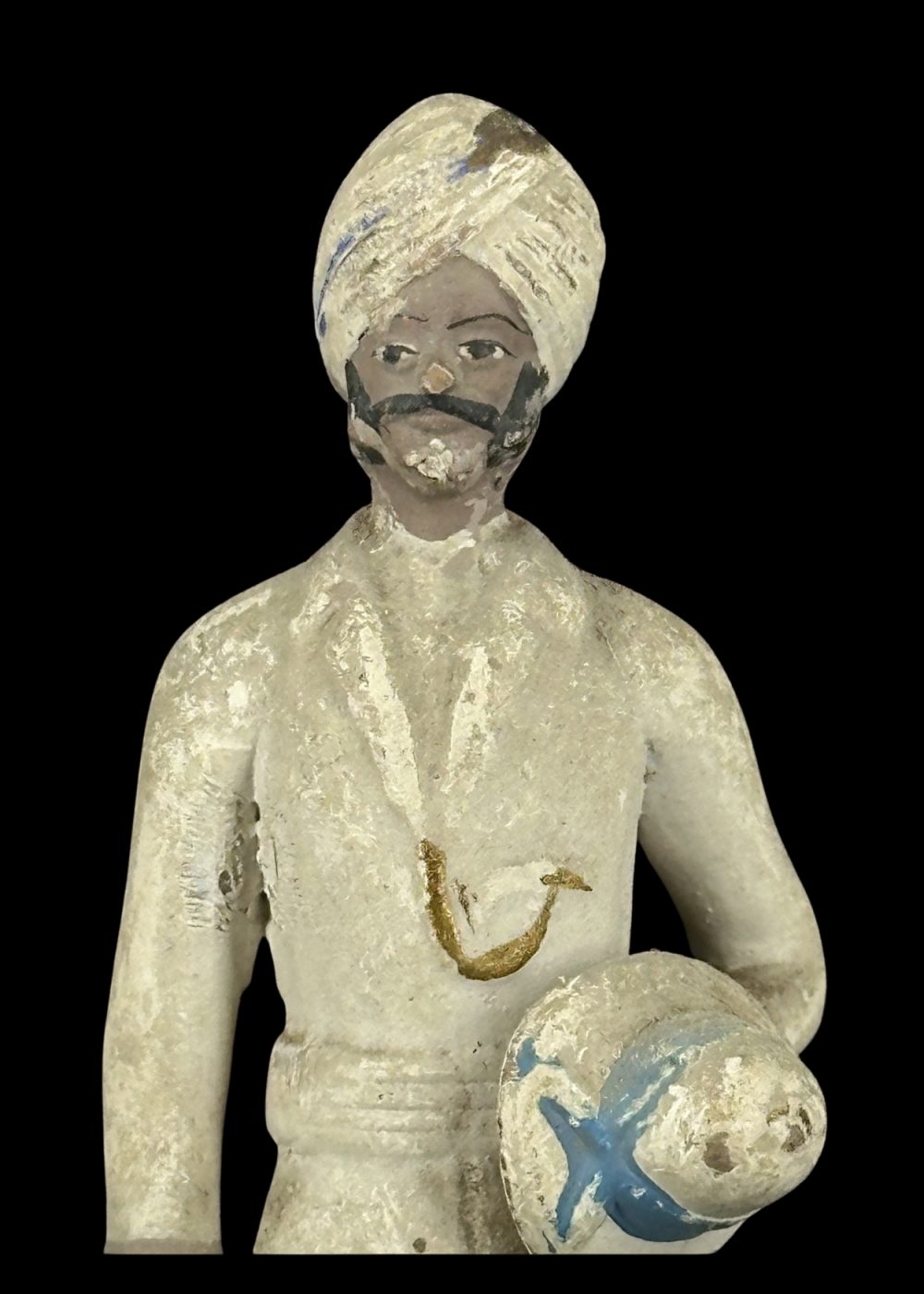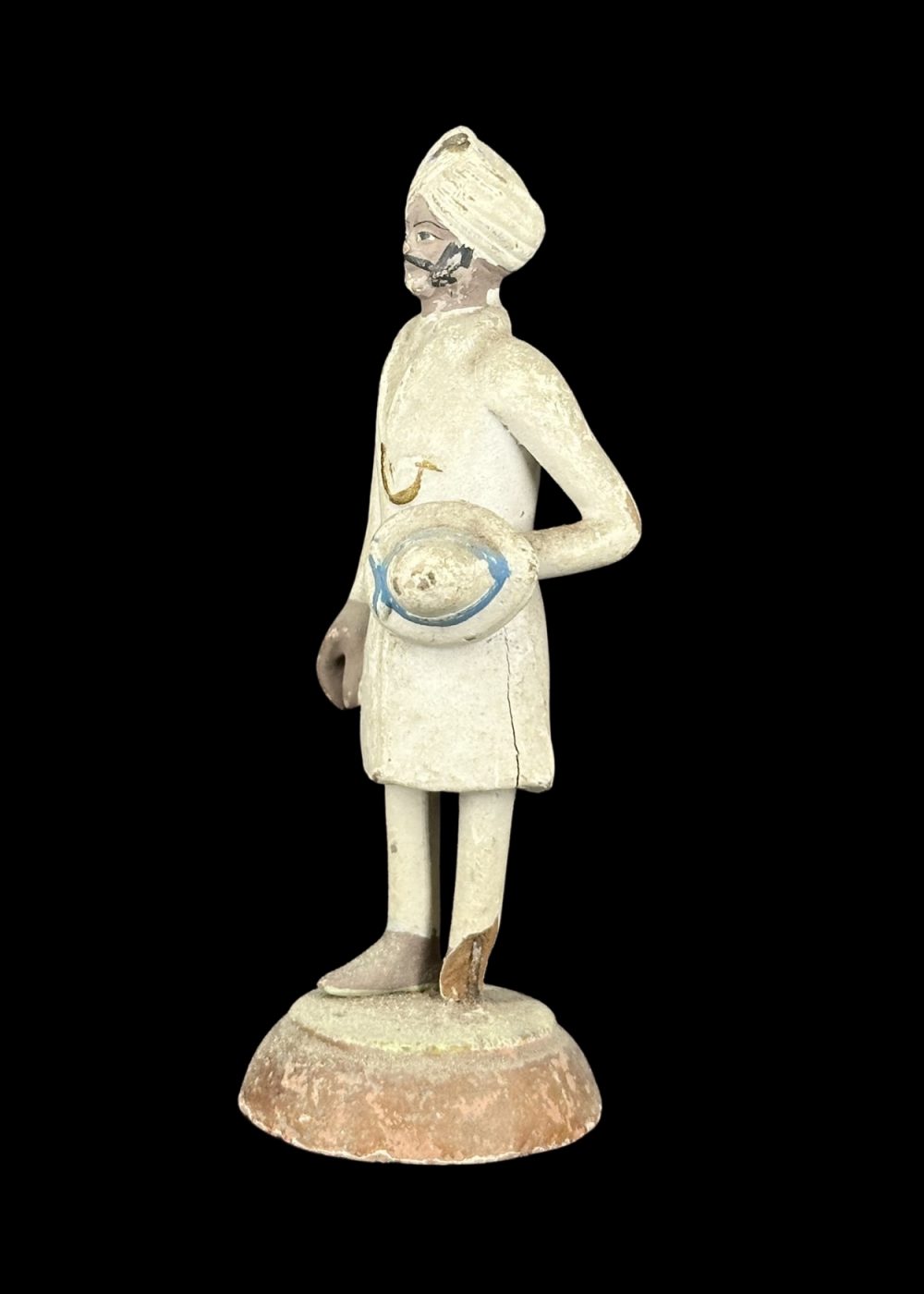 This figurine depicts an Indian attendant or orderly from the colonial era, dressed in a traditional turban and long coat, holding a round object—possibly a ceremonial item or piece of equipment—under one arm. His neatly groomed appearance, upright stance, and formal attire suggest his role in a colonial administrative or service context. The figure captures a historical period marked by Indo-British cultural intersections and reflects the dignity and discipline of domestic or institutional service personnel during that time.