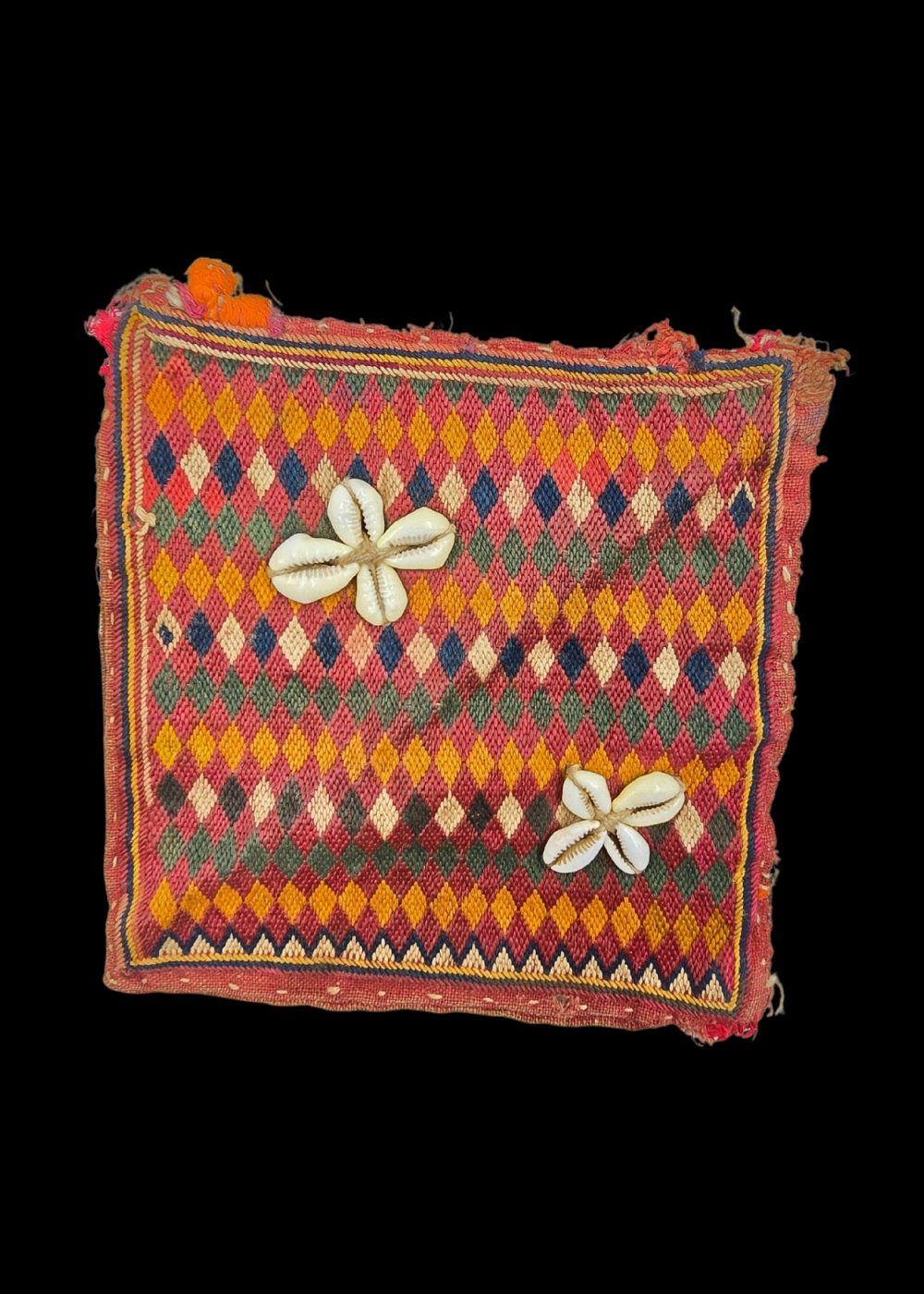 This is a vibrant handcrafted textile made by the Banjara community, known for their rich tradition of embroidery and textile arts. The piece features a striking diamond-shaped geometric pattern in bold hues of red, yellow, green, blue, and white, woven in a rhythmic arrangement. Decorative accents include cowrie shells, stitched in floral motifs, symbolizing prosperity and protection. The textile is bordered with fine woven edging and small pom-pom embellishments at the corner, typical of tribal Banjara aesthetics. Likely used as a pouch, cushion cover, or ritual cloth, this piece reflects the nomadic heritage and expressive visual language of the Banjaras.