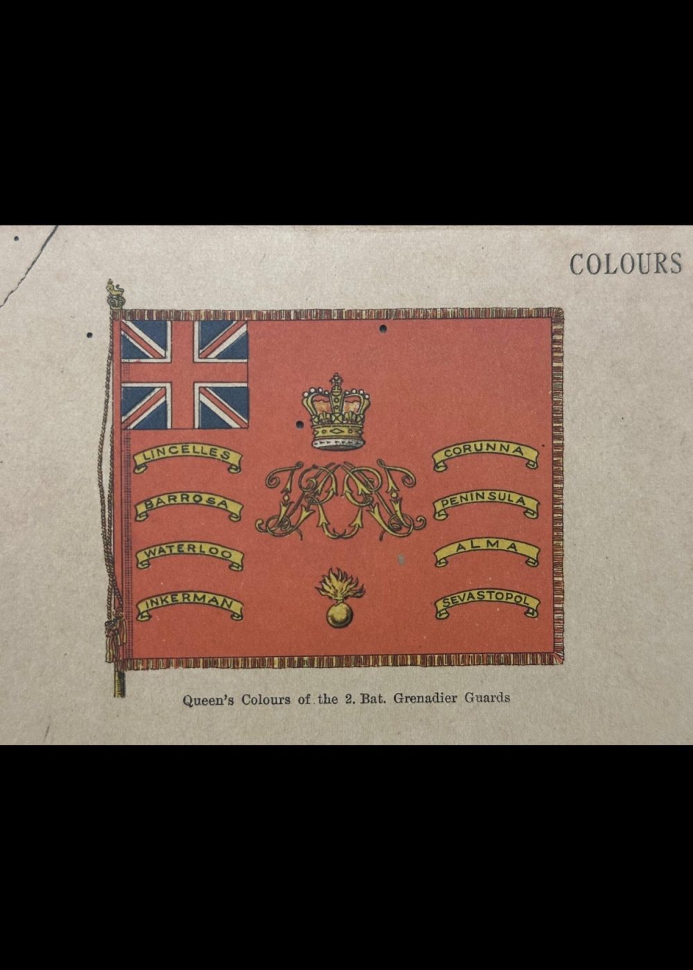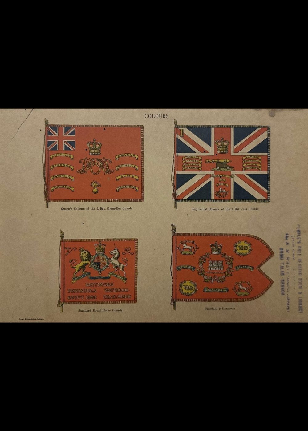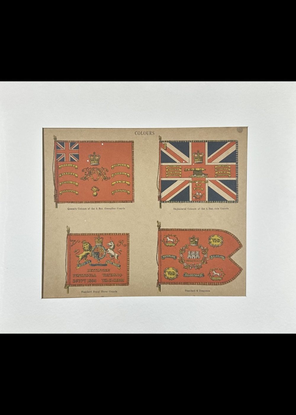 This historical illustration features the ceremonial flags, or “colours,” of notable British Army regiments. Displayed are the Queen’s Colour and Regimental Colour of the 1st Battalion Grenadier Guards, along with the standards of the Royal Horse Guards and a militia battalion. Rich in heraldic symbols, battle honours, and royal insignia, these flags represent regimental pride, tradition, and allegiance. Such colours were central to military ceremonies and served as rallying points in battle, symbolizing the honour and heritage of each regiment.
