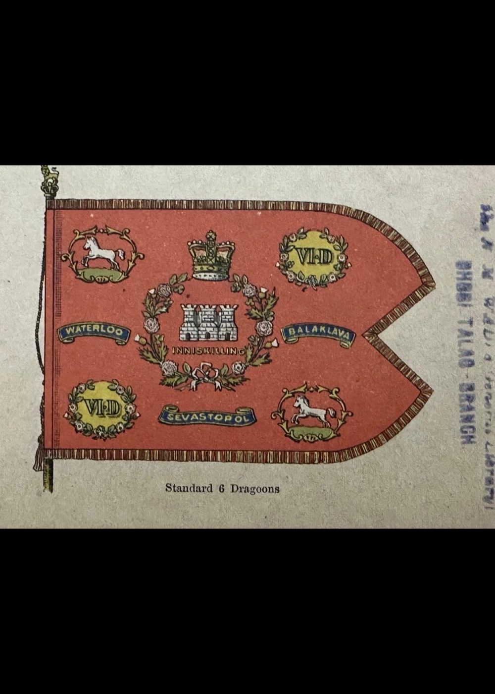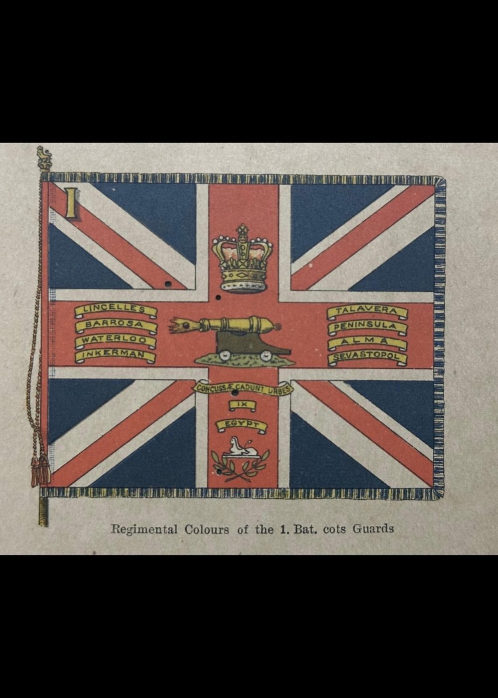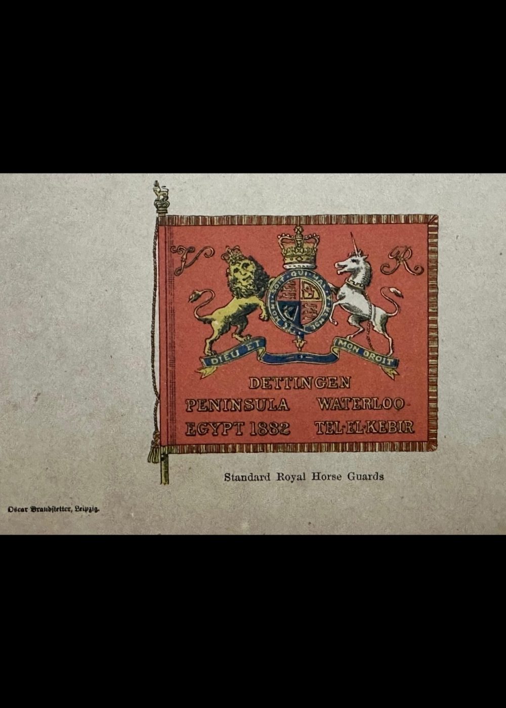 This historical illustration features the ceremonial flags, or “colours,” of notable British Army regiments. Displayed are the Queen’s Colour and Regimental Colour of the 1st Battalion Grenadier Guards, along with the standards of the Royal Horse Guards and a militia battalion. Rich in heraldic symbols, battle honours, and royal insignia, these flags represent regimental pride, tradition, and allegiance. Such colours were central to military ceremonies and served as rallying points in battle, symbolizing the honour and heritage of each regiment.