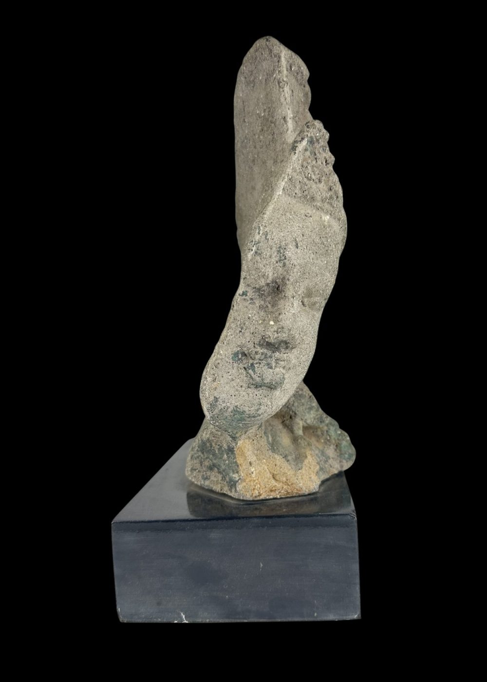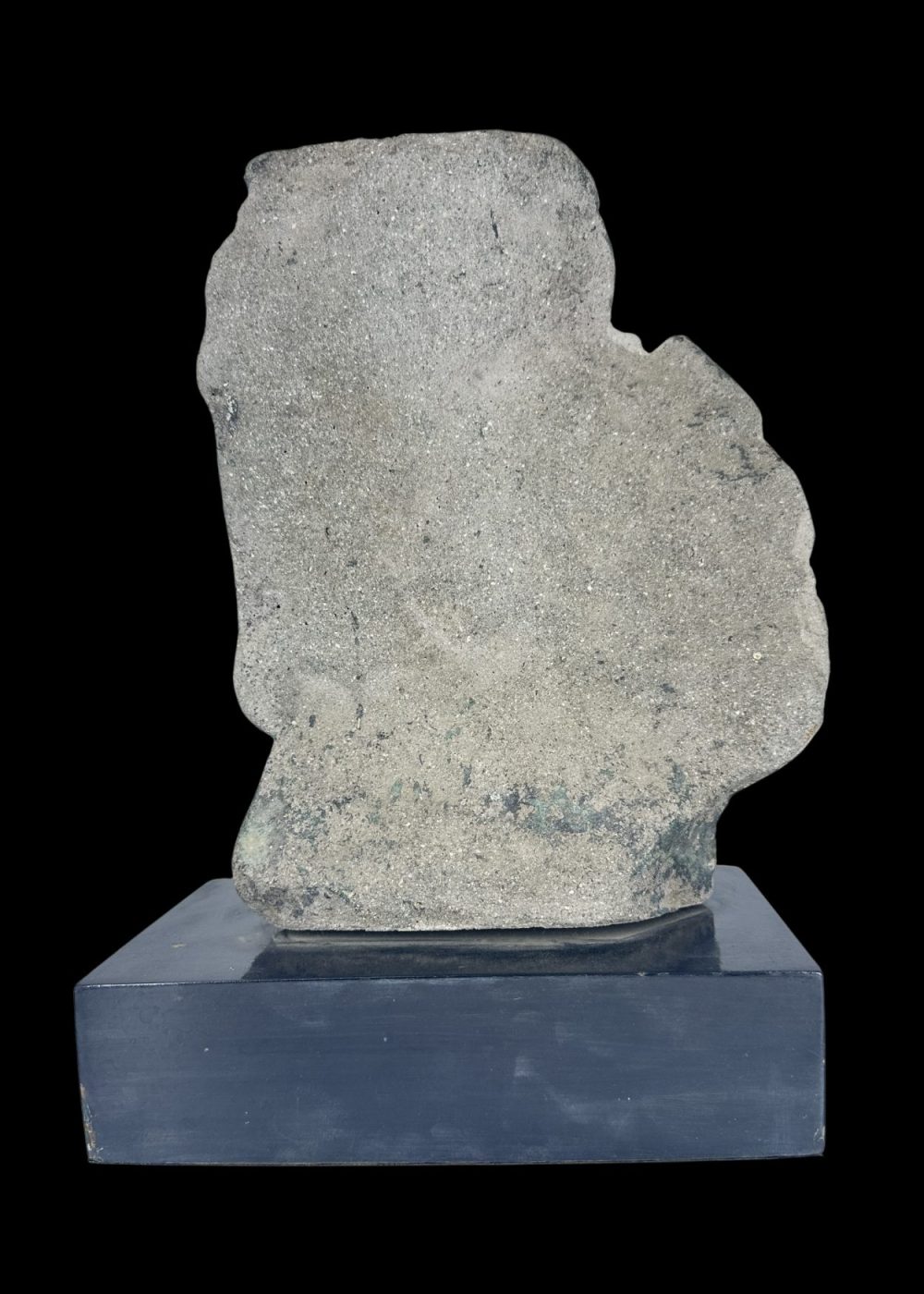 This stylized stone sculpture, carved in Bangalore, merges modern aesthetics with time-honored Indian techniques. Featuring a finely modeled human head with pronounced ear, braided hairwork, and delicately defined features, the piece showcases artistic precision within a rugged stone medium. Mounted on a contrasting black plinth, the sculpture celebrates regional craftsmanship through a minimalist yet culturally resonant form.