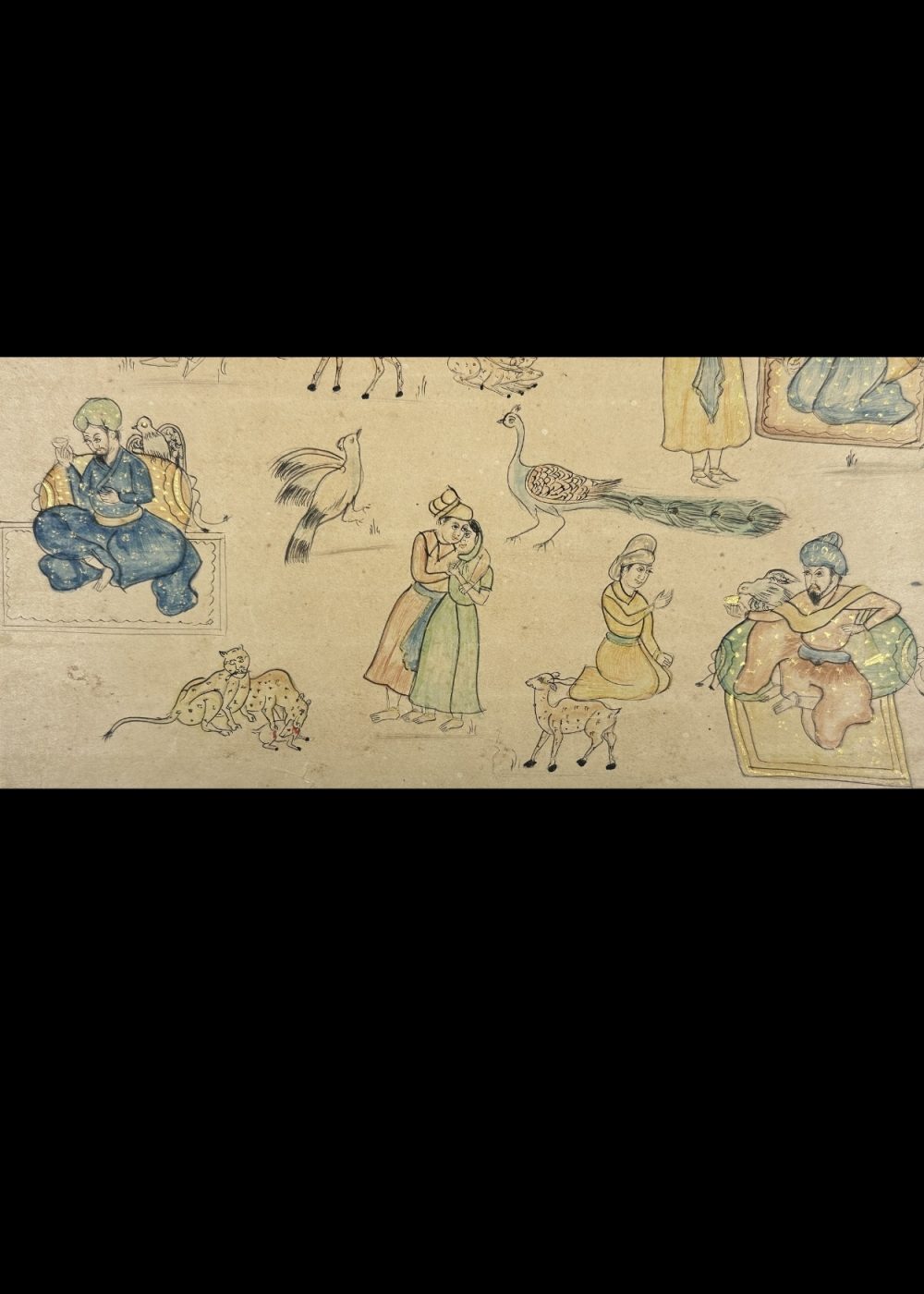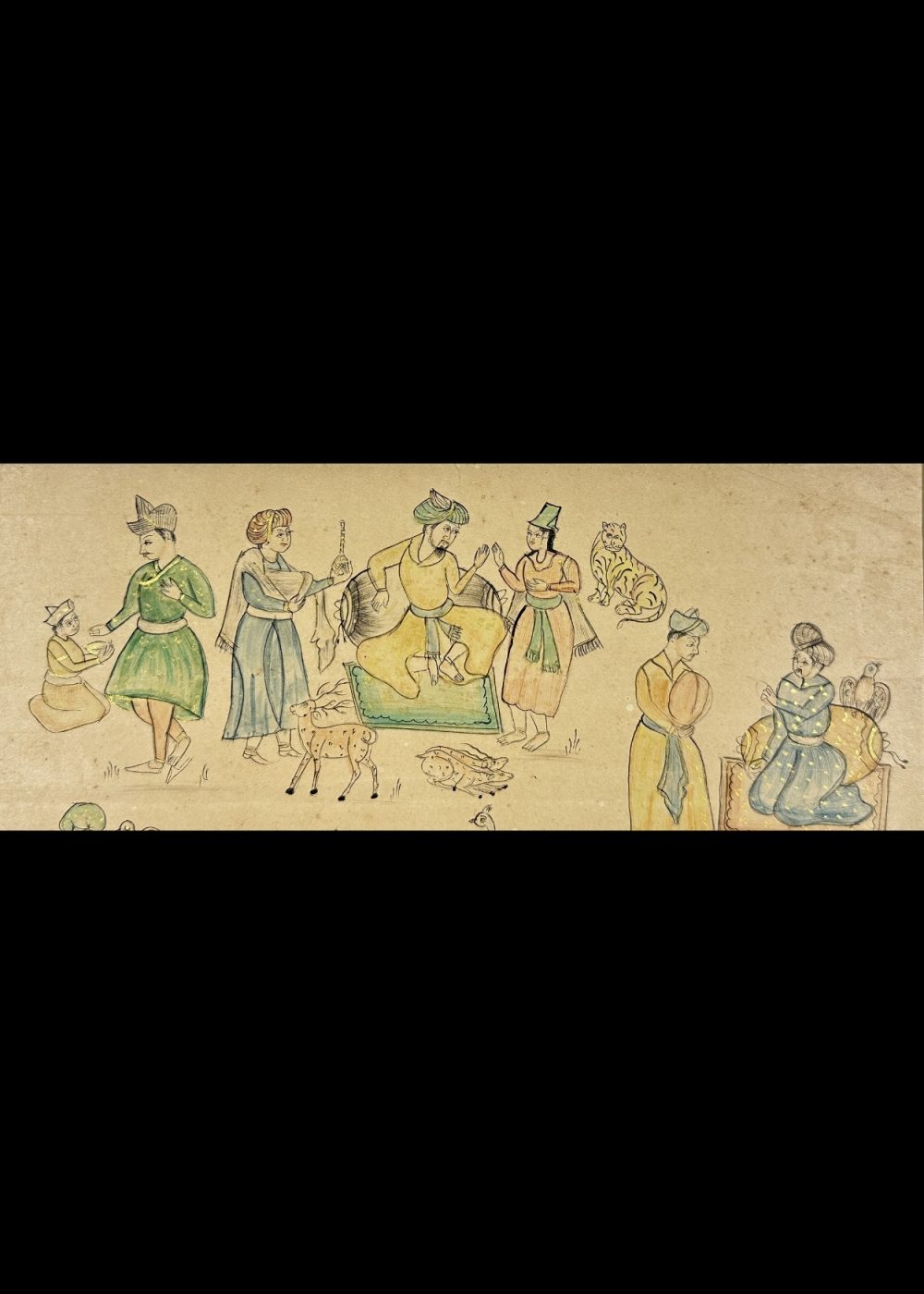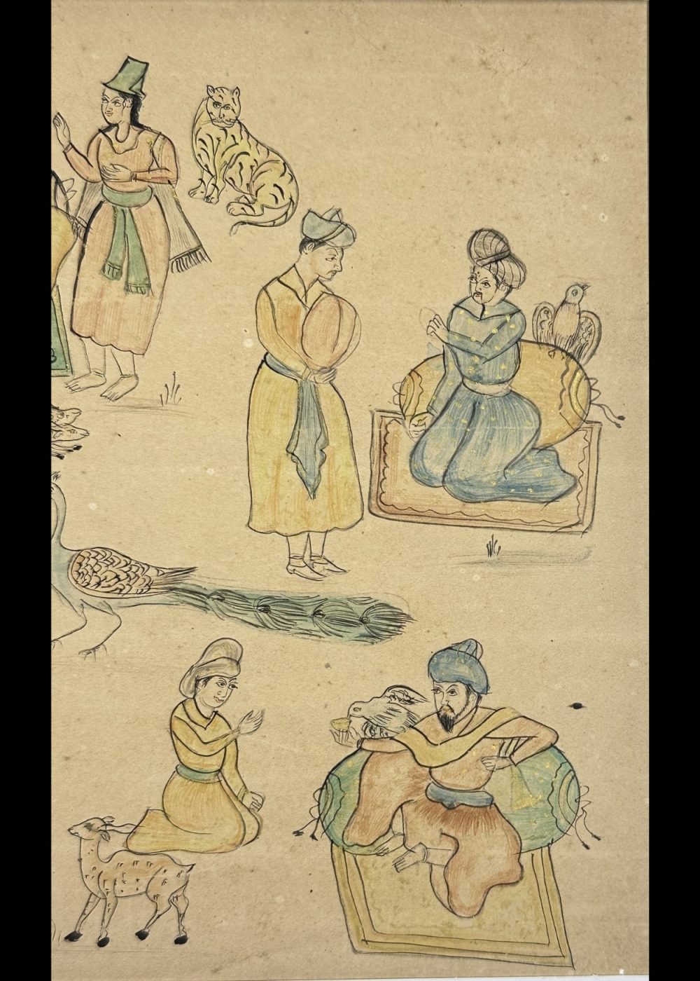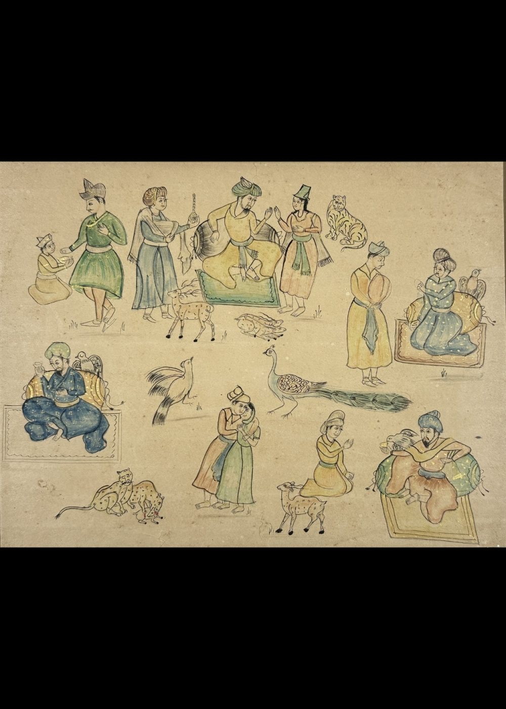 This delicate painting, likely from the 19th-century Company School tradition, presents a series of loosely arranged vignettes depicting royal leisure, courtly interactions, and animals. The central scene features a noble figure, possibly a king or nobleman, seated on a green divan surrounded by attendants, courtiers, and entertainers. Scattered around are individual portraits of men and women engaged in conversation, music, and affection—each embodying aspects of refined courtly life. The inclusion of animals such as leopards, peacocks, goats, and exotic birds reflects the fascination with nature and domesticity in princely environments. The linear style, muted palette, and narrative format are hallmarks of Company paintings, created during colonial India to blend Indian subjects with European-inspired realism.